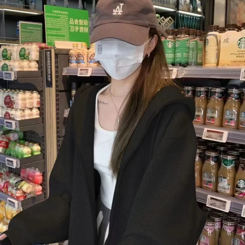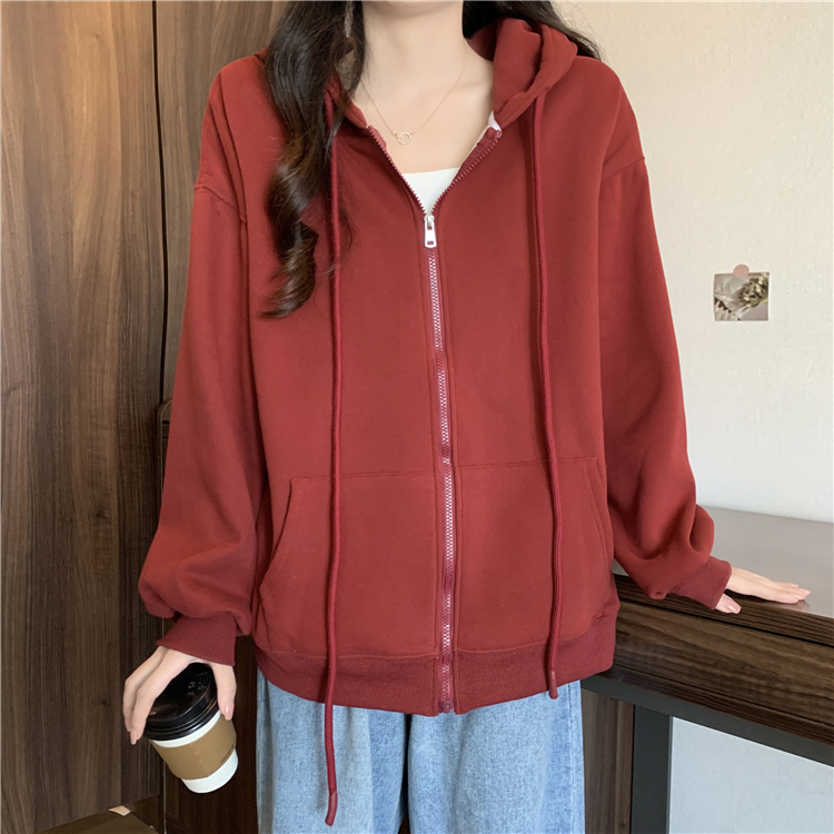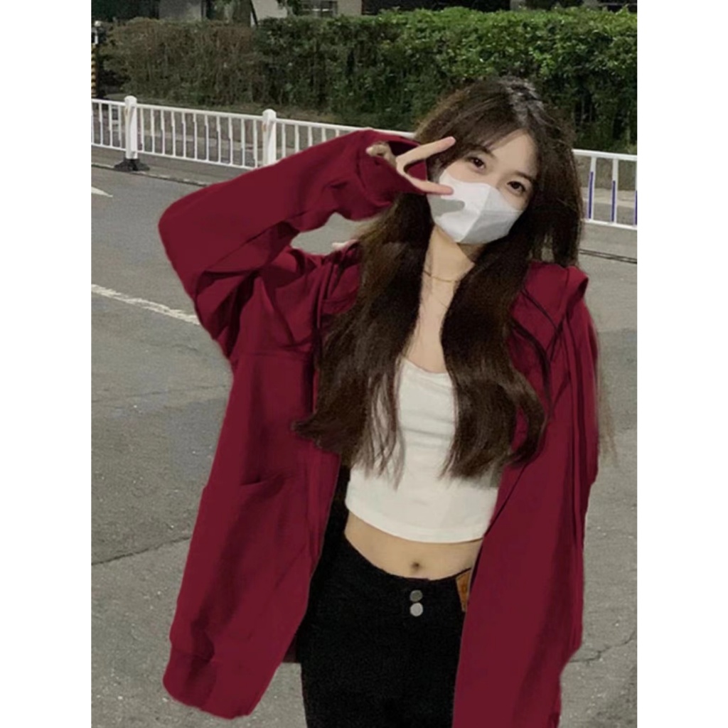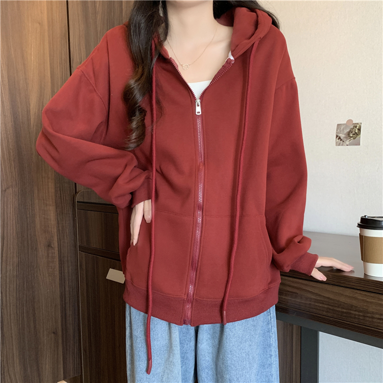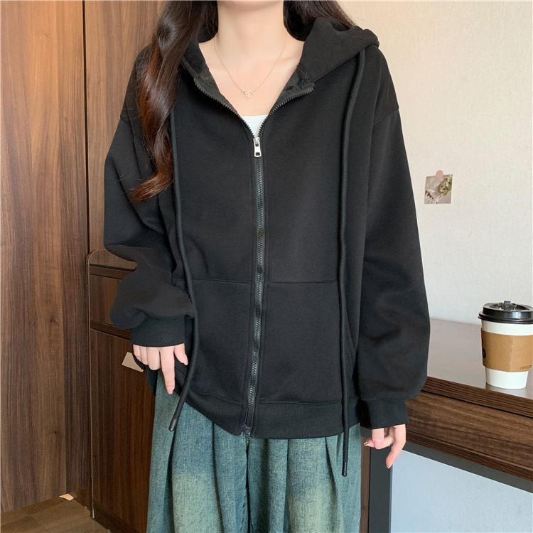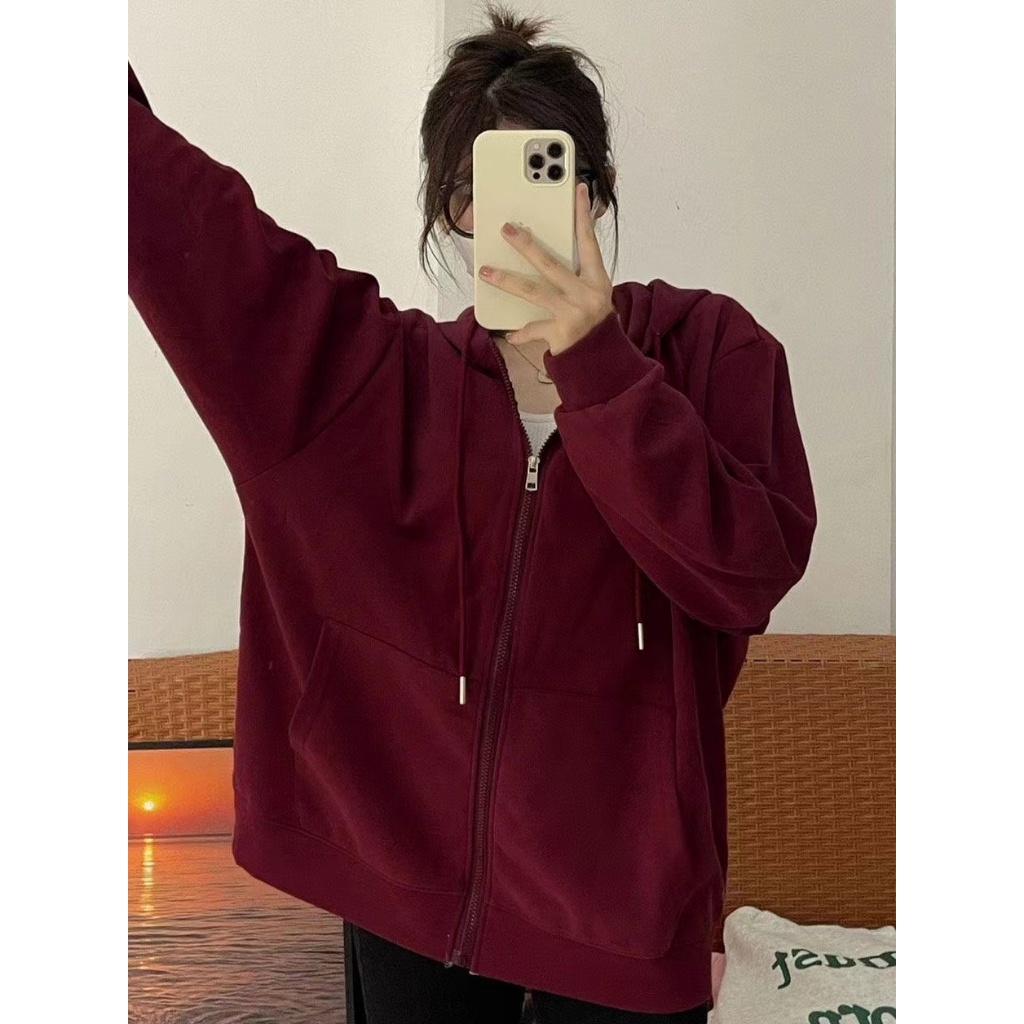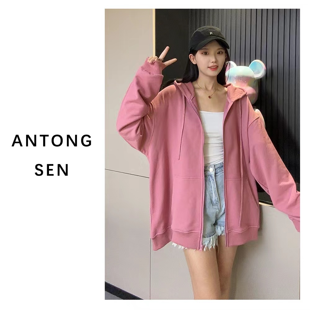 สไตล์เกาหลี สำหรับผู้หญิง M-2XLสีทึบ เสื้อฮู้ด แขนยาว ทรงโอเวอร์ไซซ์ คาร์ดิแกนซิปแขนยาว