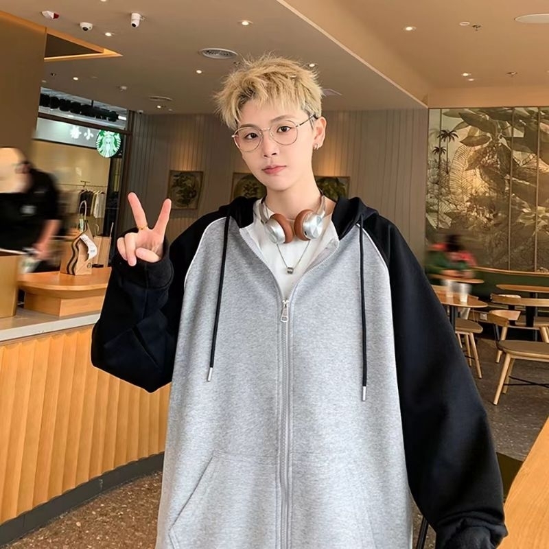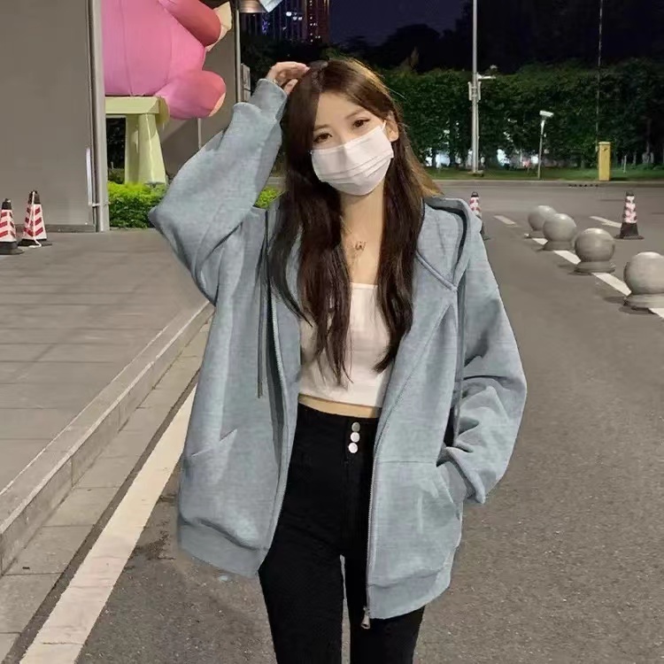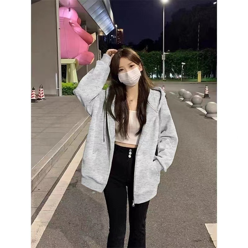 สไตล์เกาหลี สำหรับผู้หญิง ลายตัวอักษร ทรงโอเวอร์ไซซ์ สีเทา เสื้อกันหนาวแขนยาว มีฮู้ด ซิปหน้า แฟชั่น