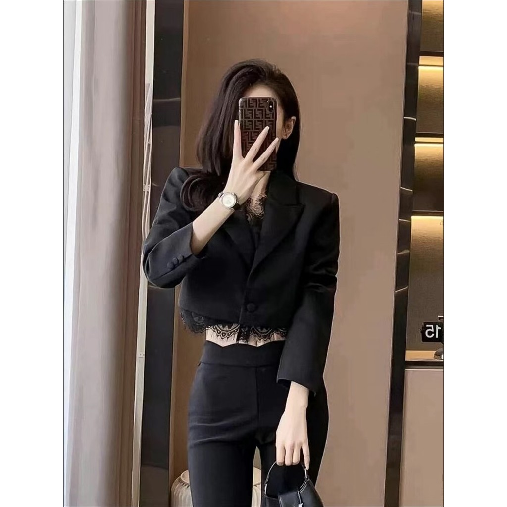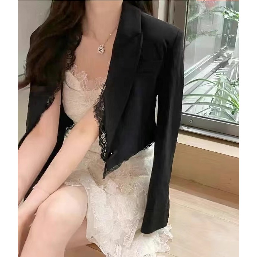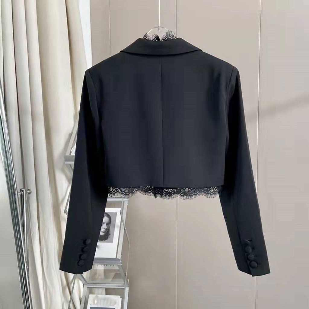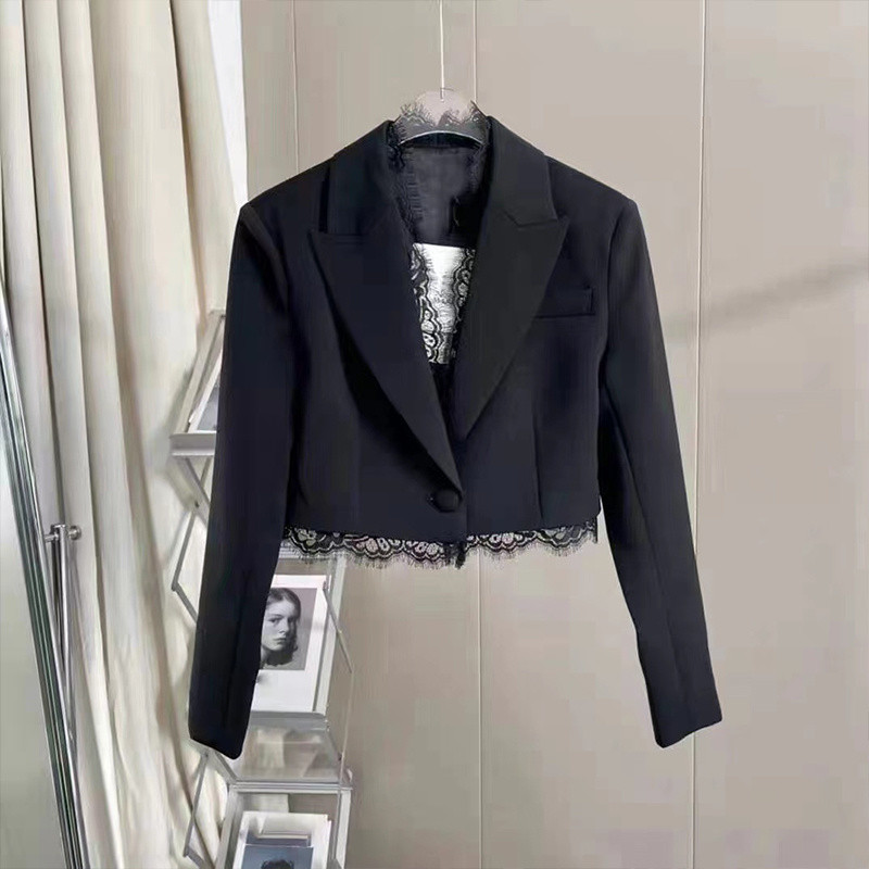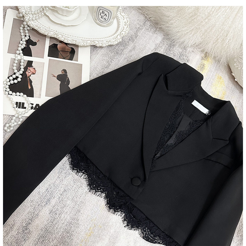 imoveFrench Style Womens Black Cushion Shoulder Lace Stitching Small Suit Jacket Slim Fit Ruffled Short Suit Commuting Work Clothes