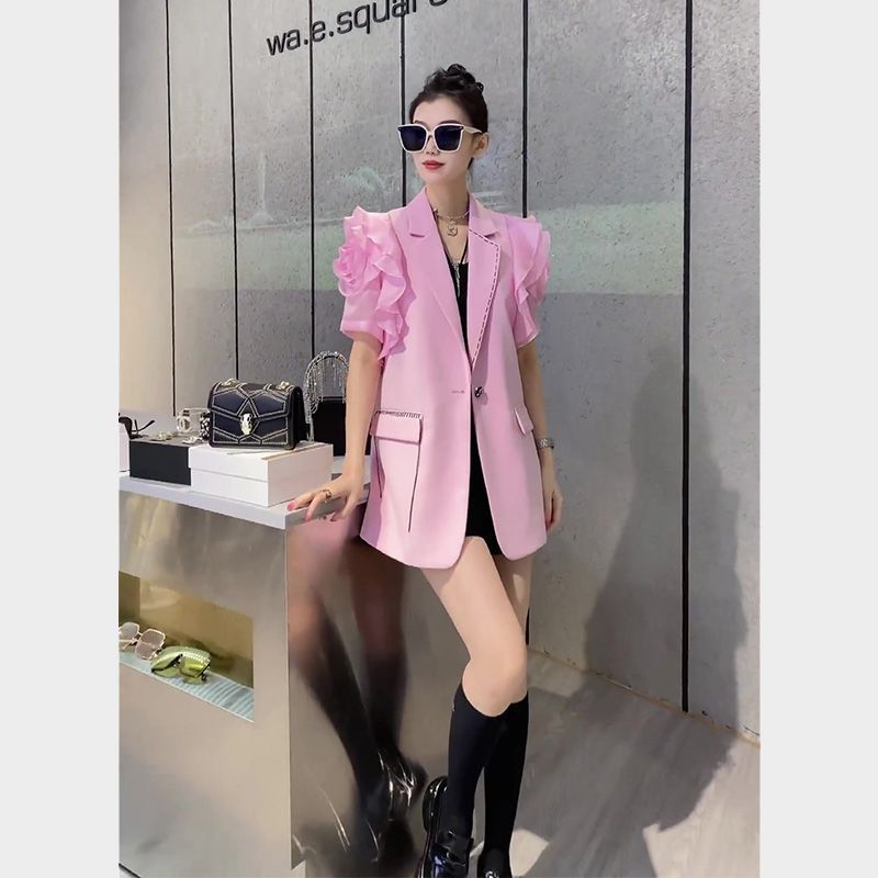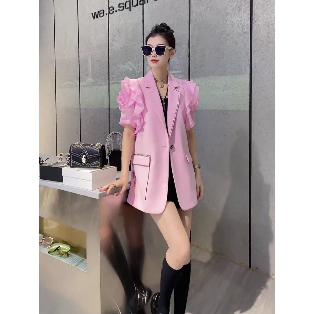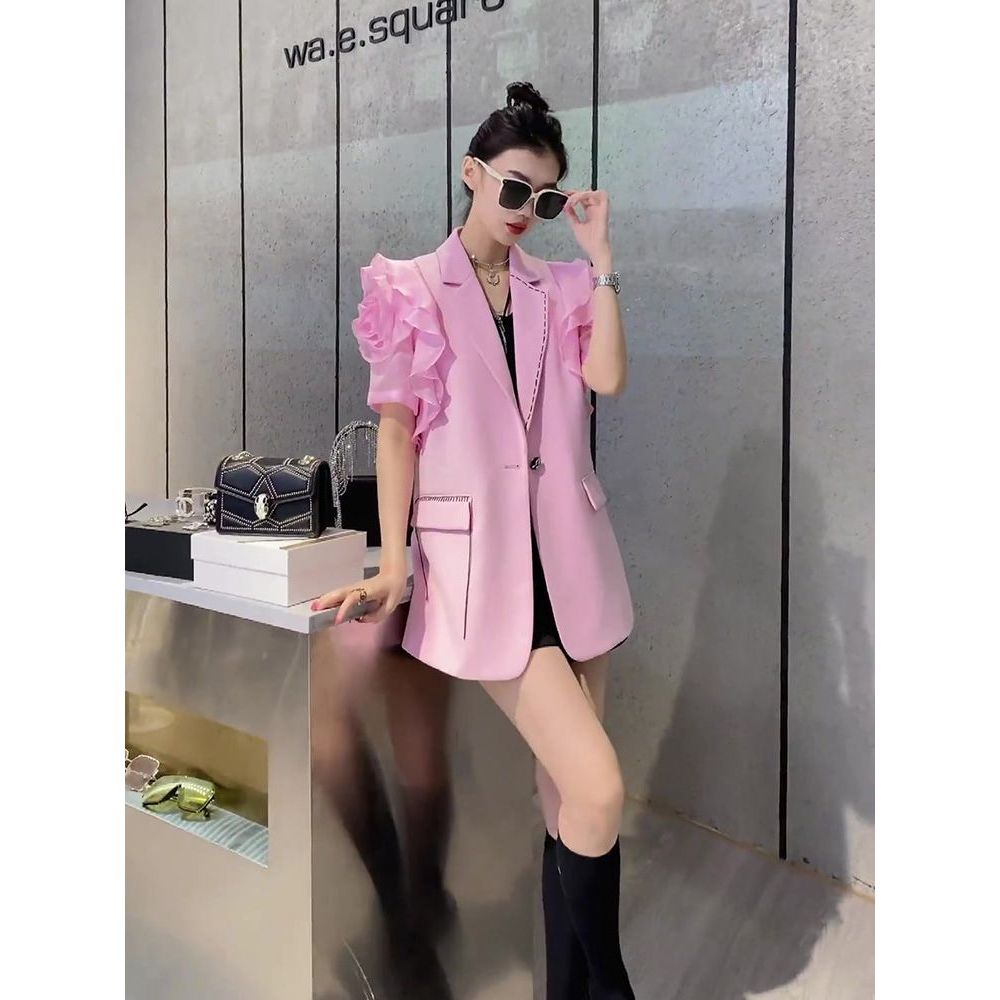 Niche Non-Collision Top ดีไซน์คลาสลิค สไตล์เกาหลี แขนสั้น สีชมพู Blazer สำหรับผู้หญิง ฤดูใบไม้ผลิ
