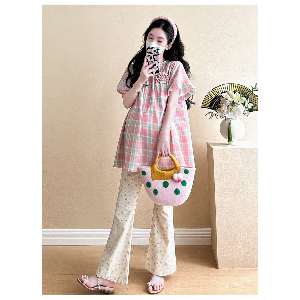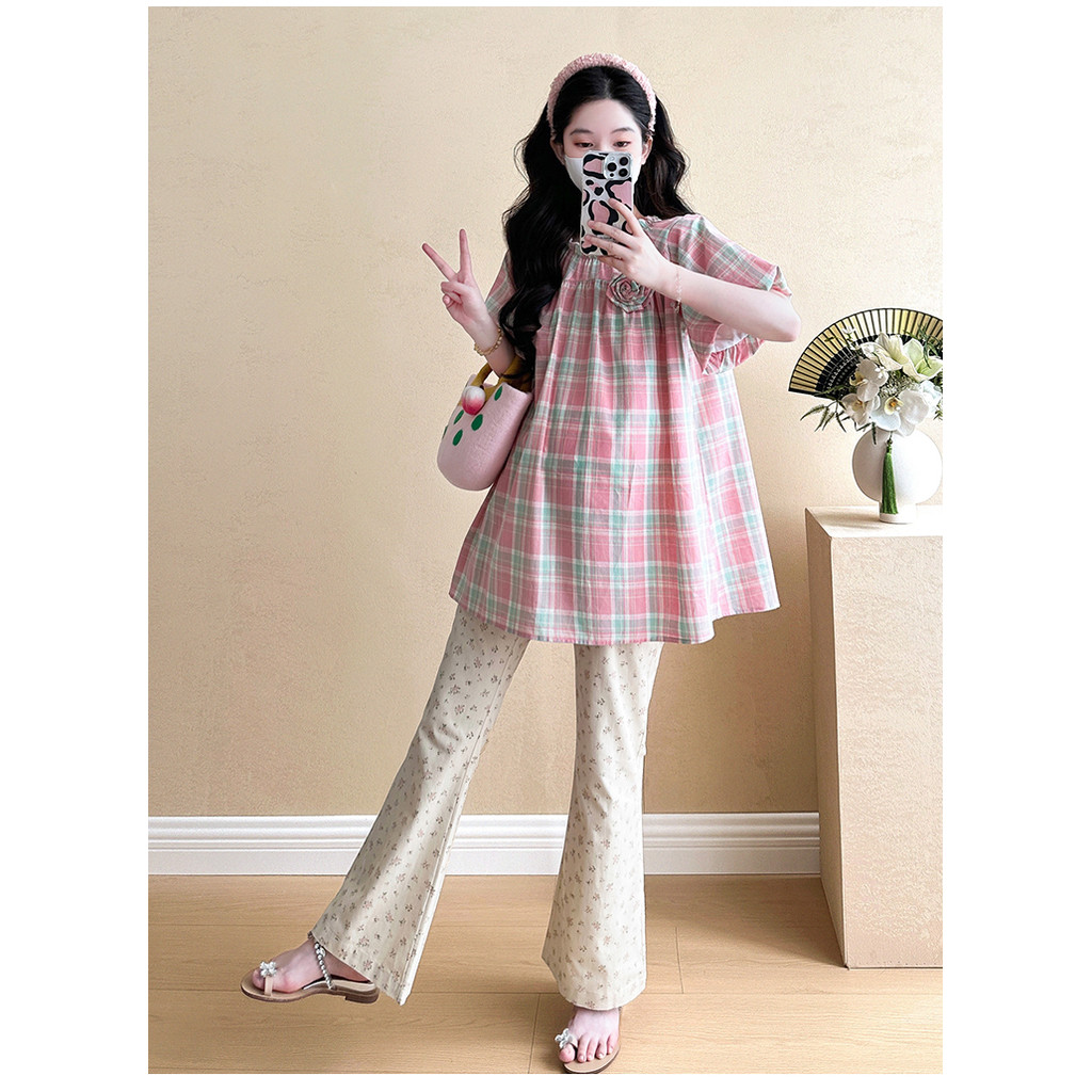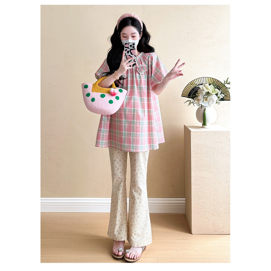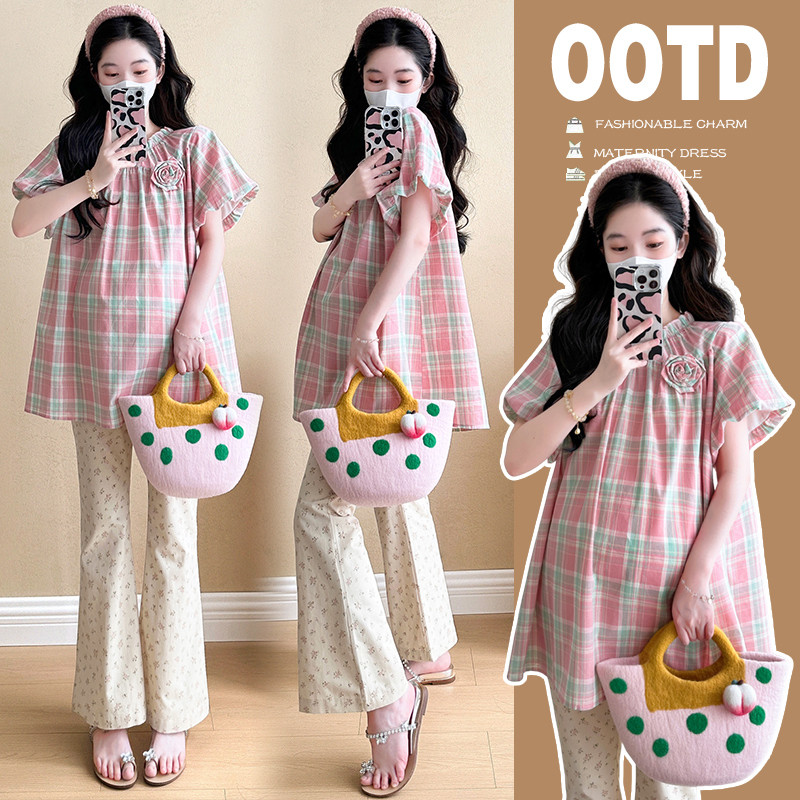 ชุดคลุมท้อง 2025 เวอร์ชั่นเกาหลีสีชมพูหวานลายสก๊อตเสื้อเด็กทารกแฟชั่นกระโปรงหลวมชุดสองชิ้น
