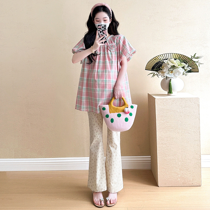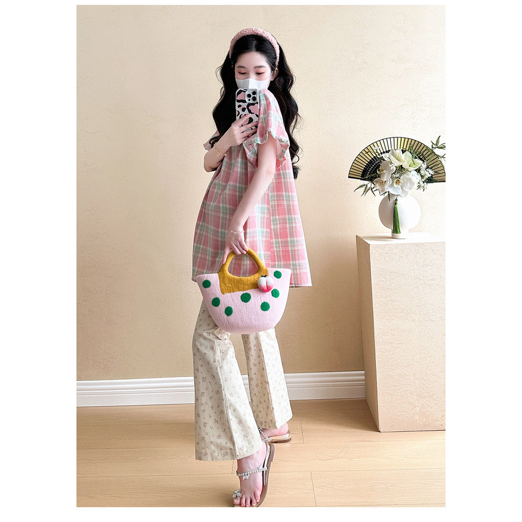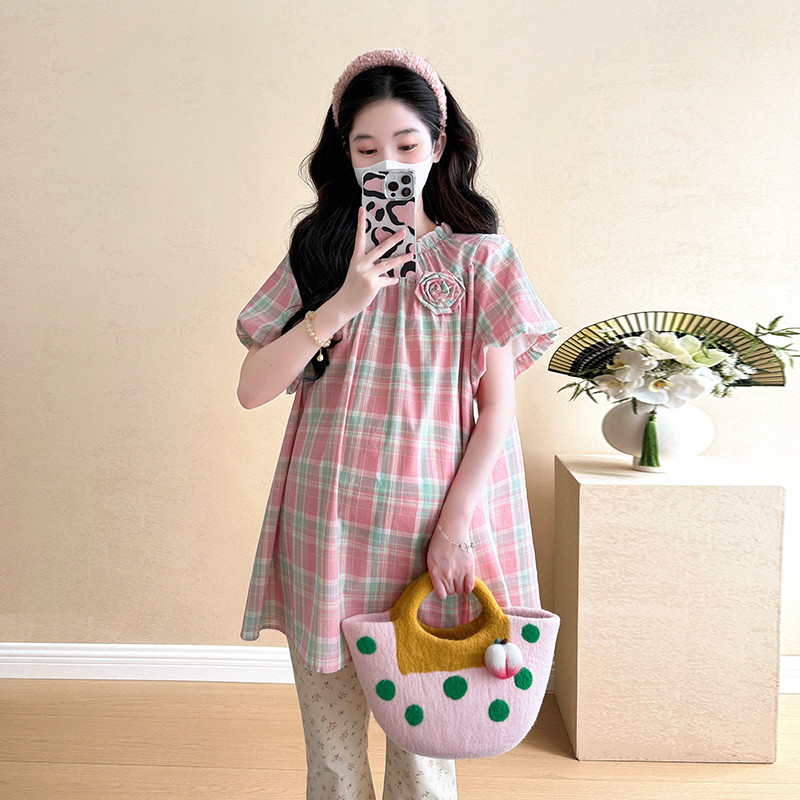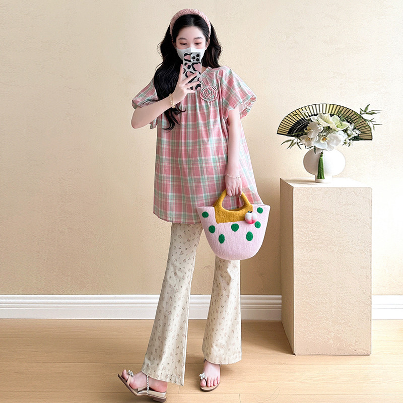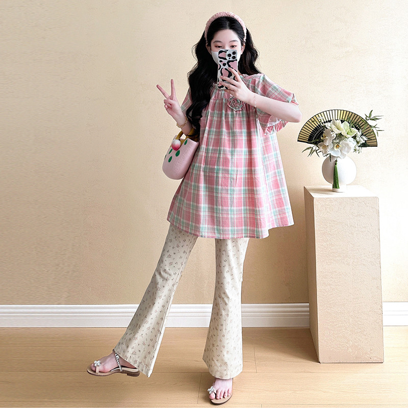 ชุดคลุมท้อง 2025 เวอร์ชั่นเกาหลีสีชมพูหวานลายสก๊อตเสื้อเด็กทารกแฟชั่นกระโปรงหลวมชุดสองชิ้น