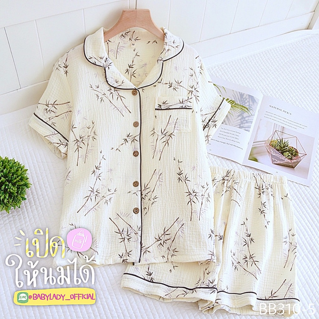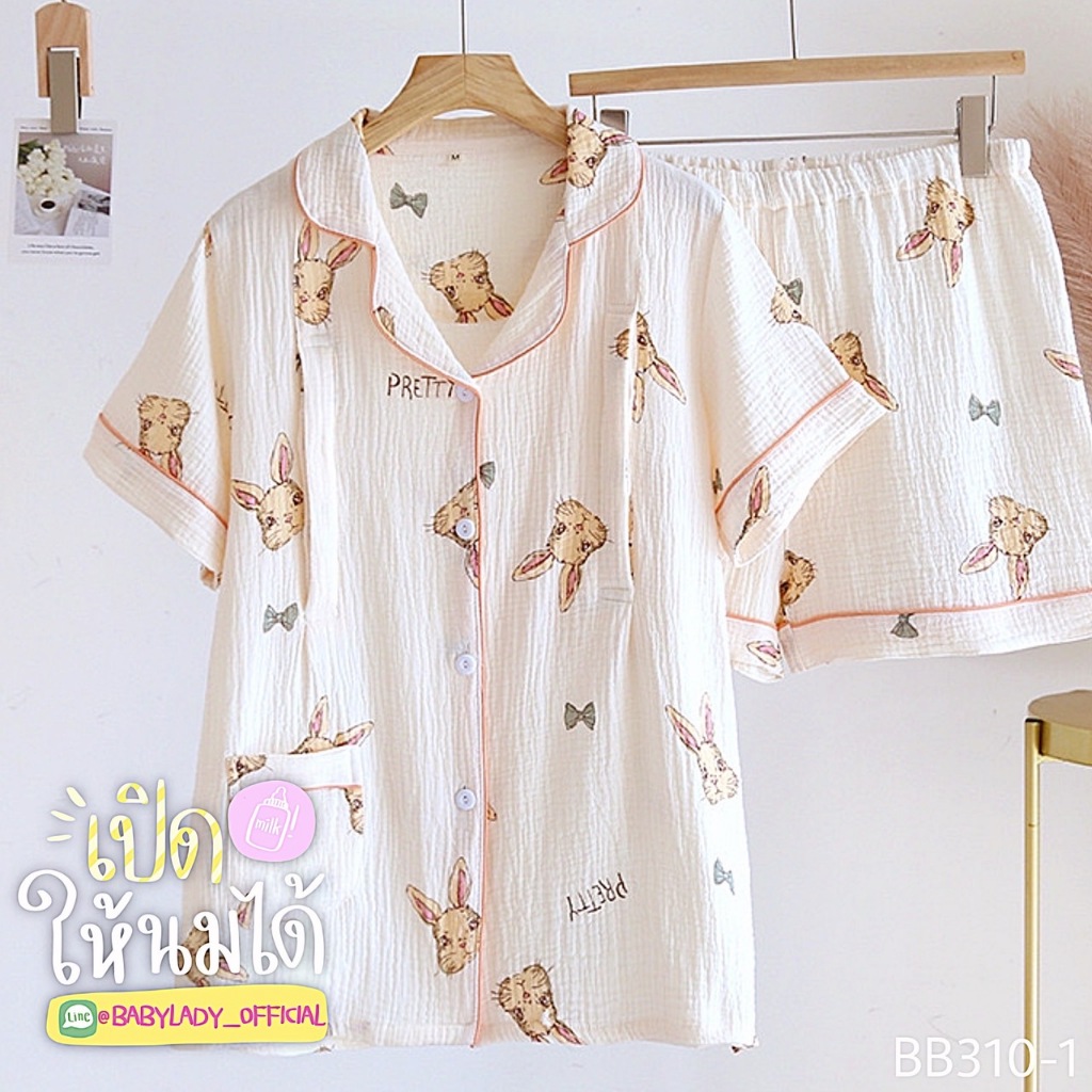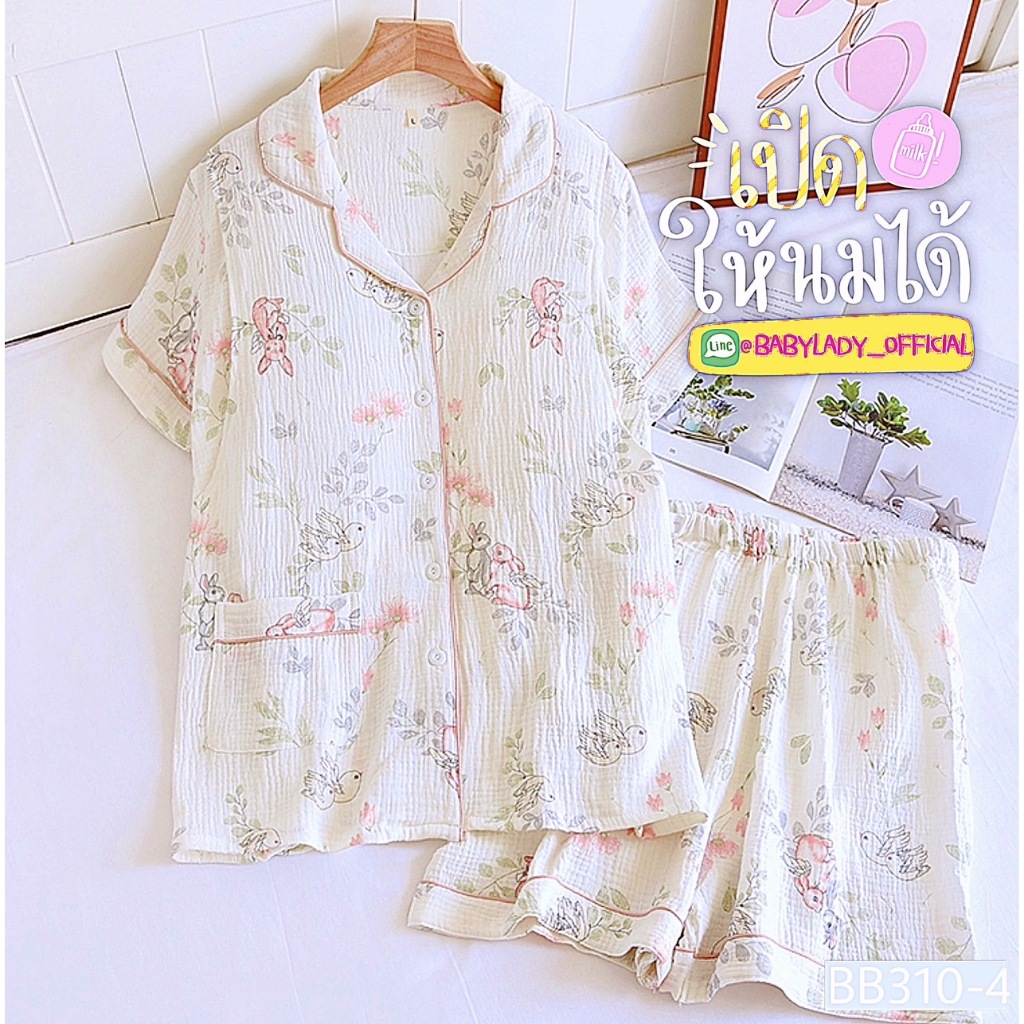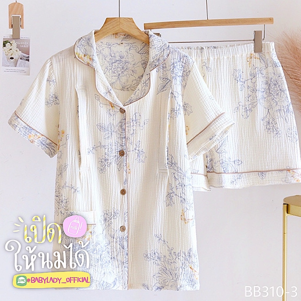 BB 310 Series ชุดนอนคลุมท้อง เปิดให้นม เป็นงาน 2 ชิ้น เนื้อผ้ามัสลิน คอปกแขนสั้น