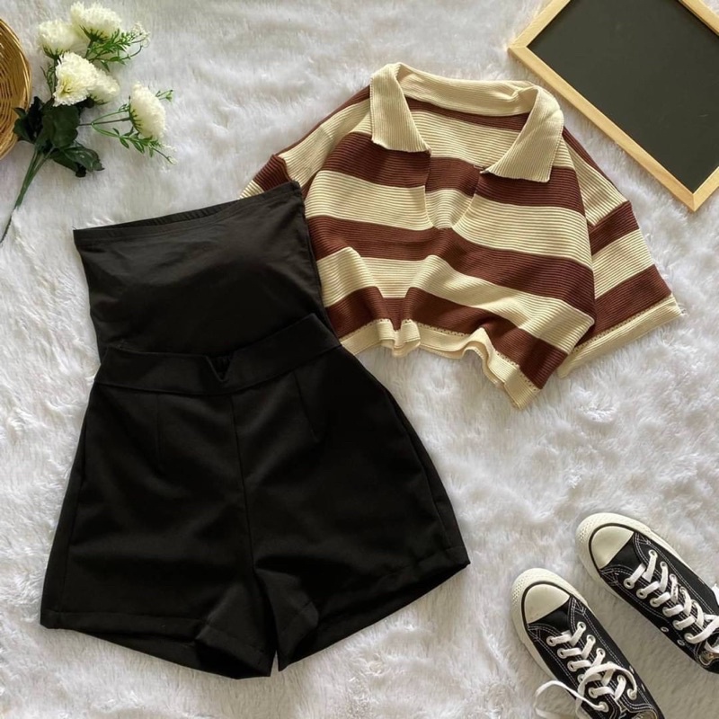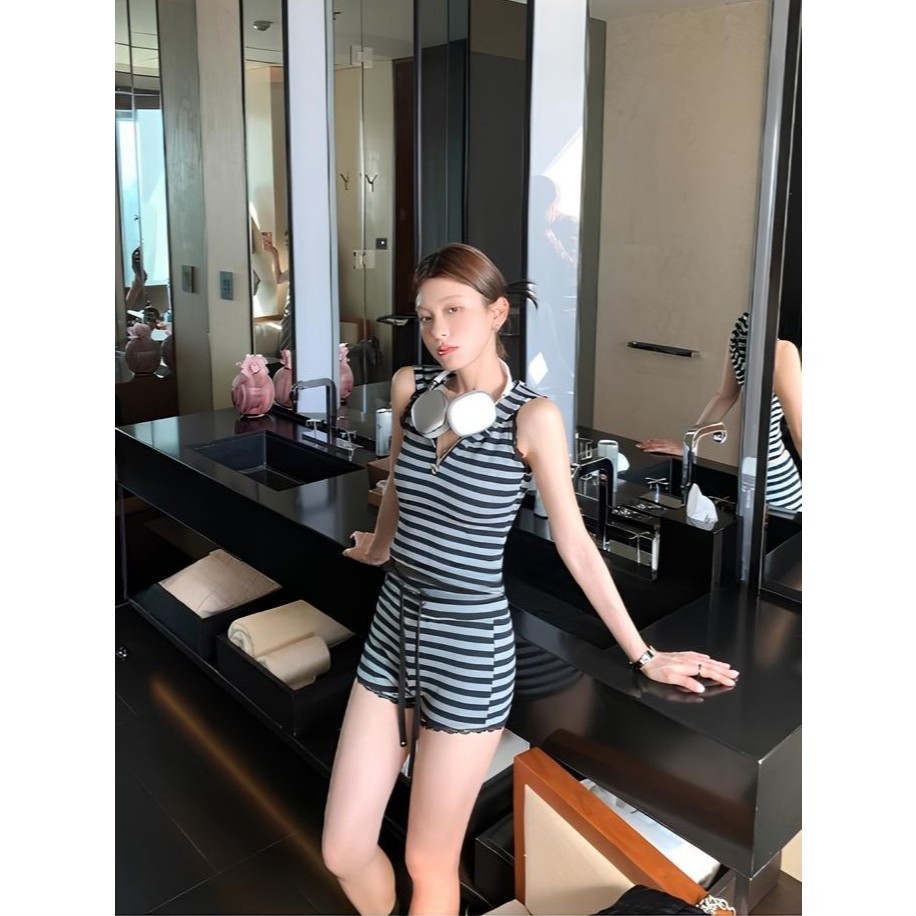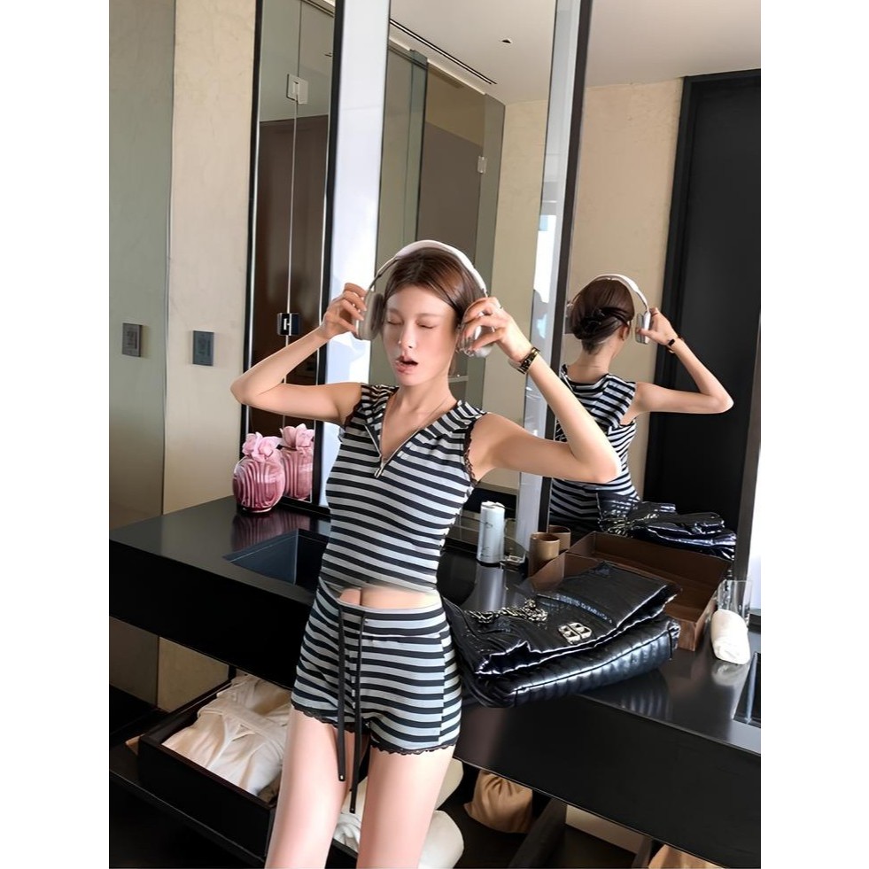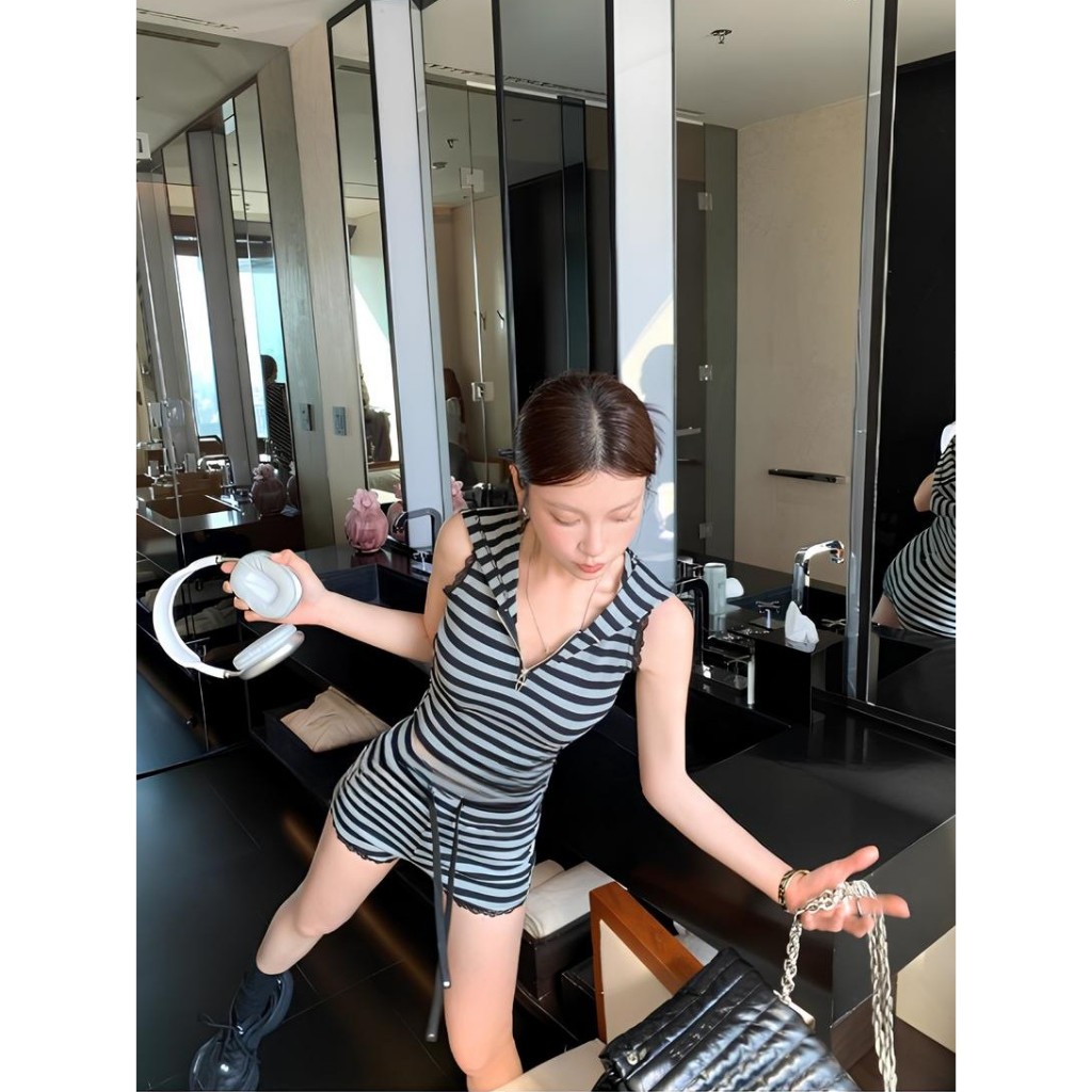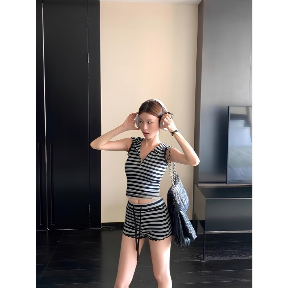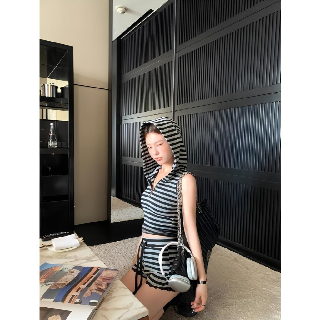เซ็ต2ชิ้น เสื้อครอปฮู้ด ลายทางสีเทาดำ แขนกุดซิปหน้า +กางเกงเอวยางยืดมีเชือกรูด ผ้าโพลิเอสเตอร์ #1301