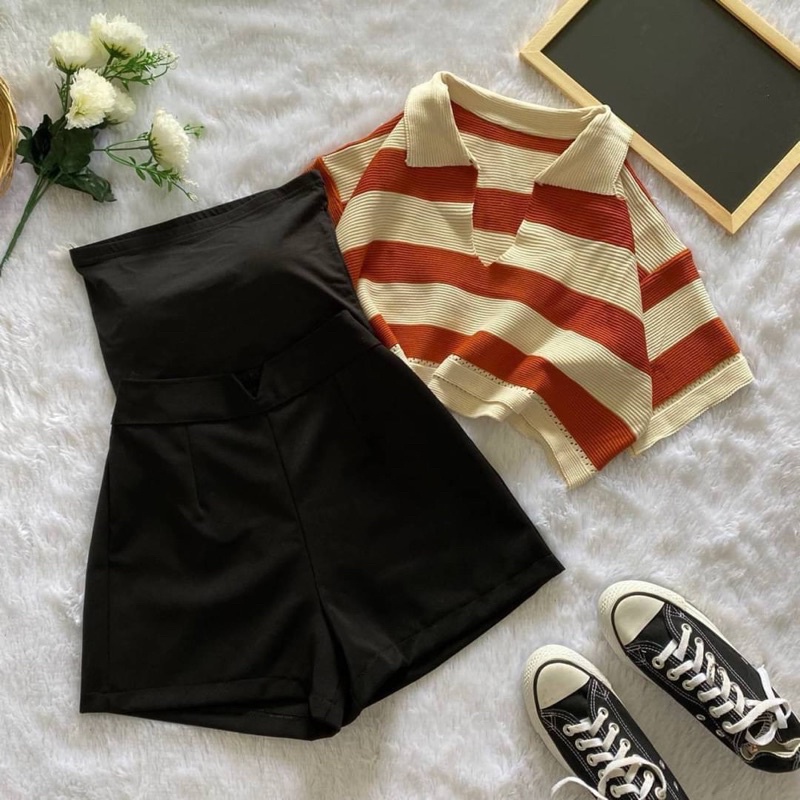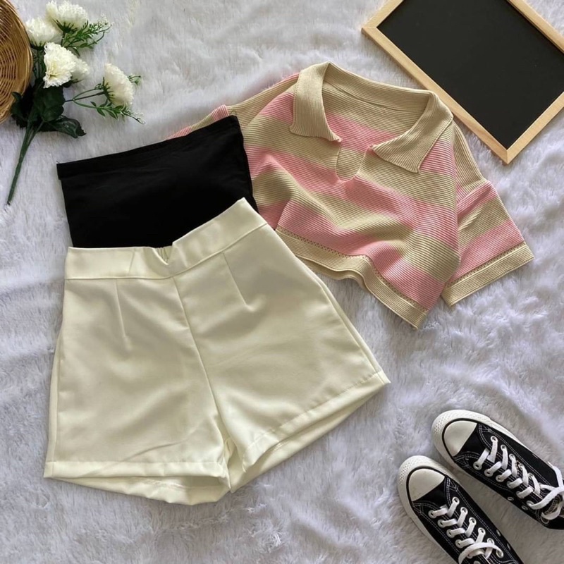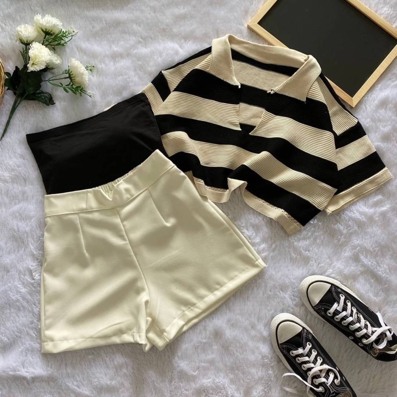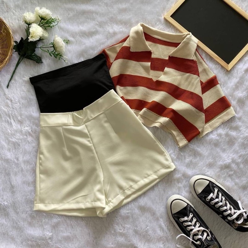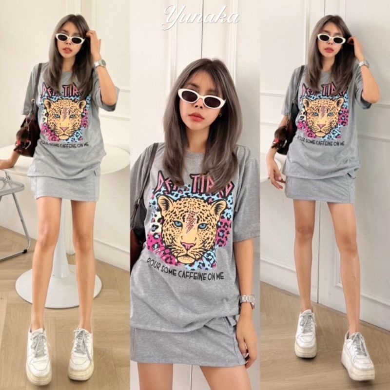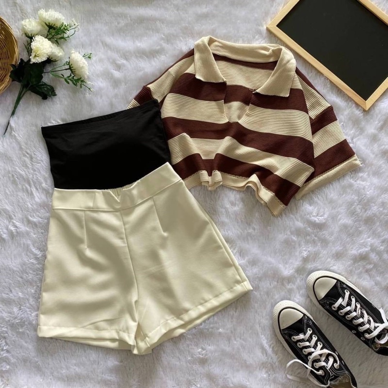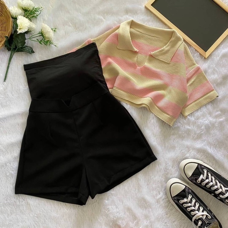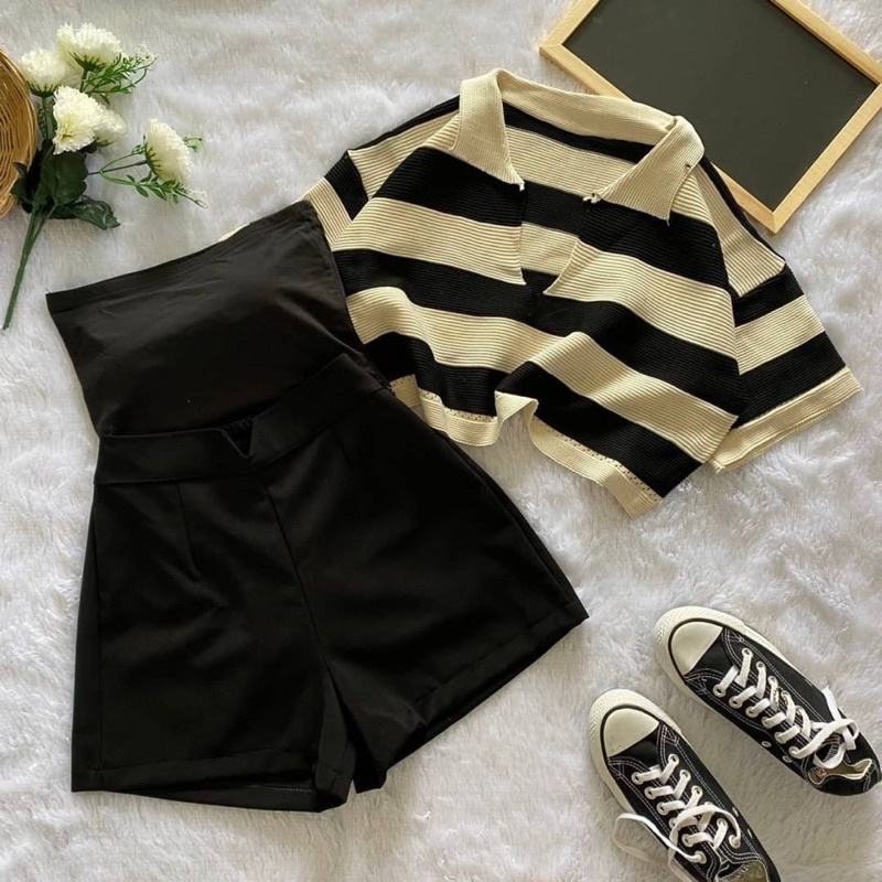 เซ็ต2ชิ้น เสื้อครอปฮู้ด ลายทางสีเทาดำ แขนกุดซิปหน้า +กางเกงเอวยางยืดมีเชือกรูด ผ้าโพลิเอสเตอร์ #1301