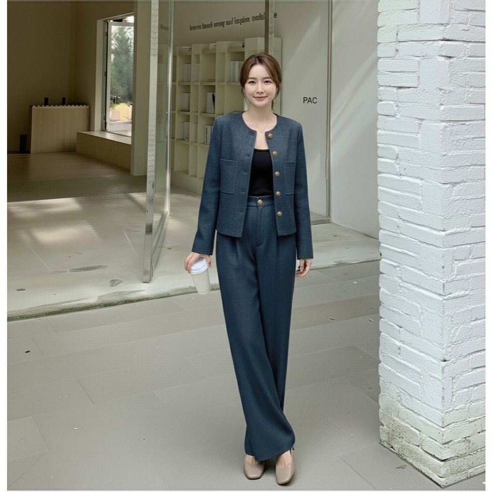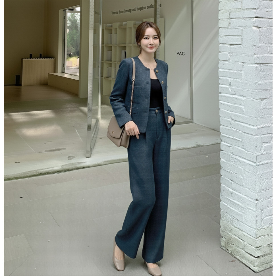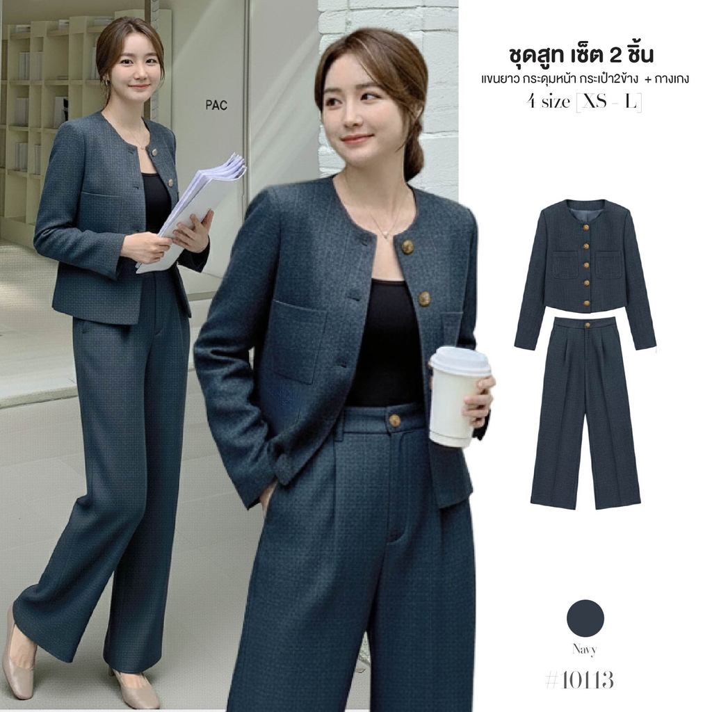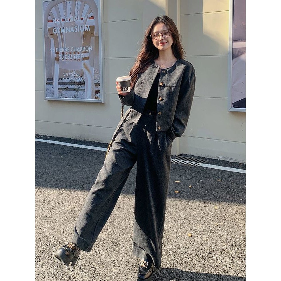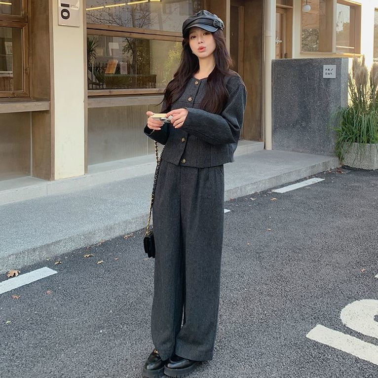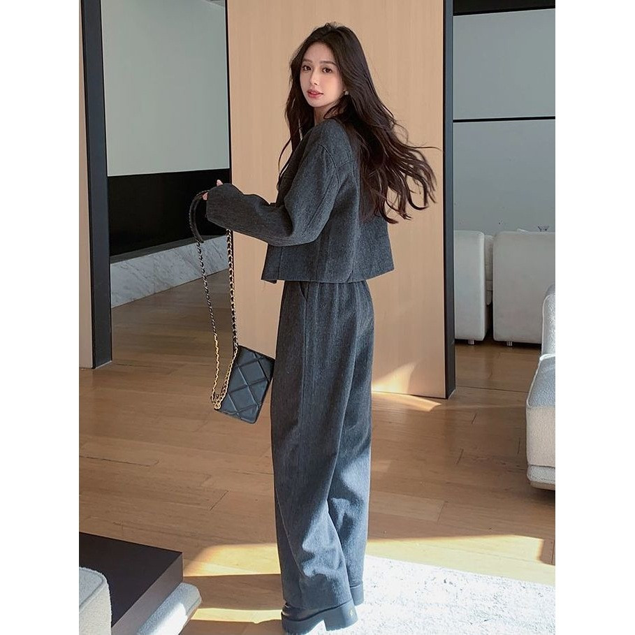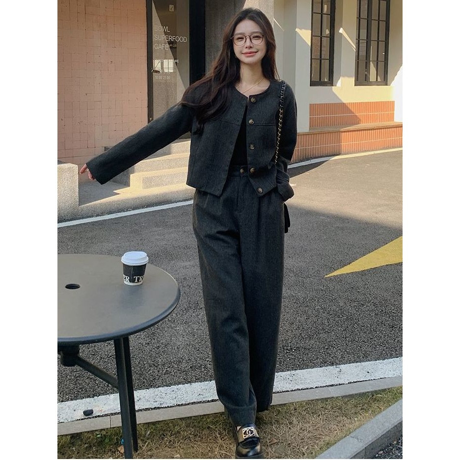 เสื้อสูท/แจ็คเก็ต แขนยาว คอกลม สีกรม กระดุมหน้า กระเป๋า2 ข้างมีซับใน + กางเกงขากระบอกใหญ่ เอวยางยืด ซิปหน้า #10113