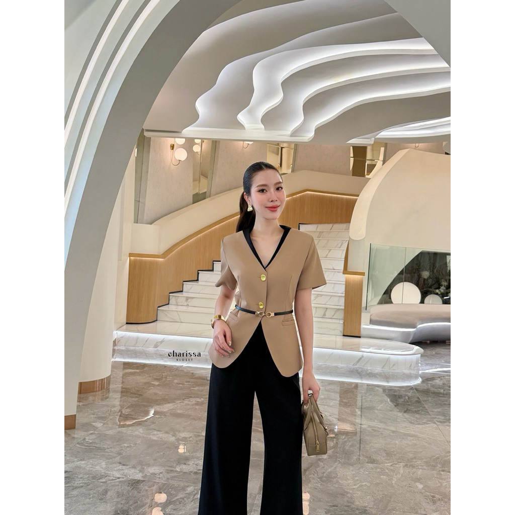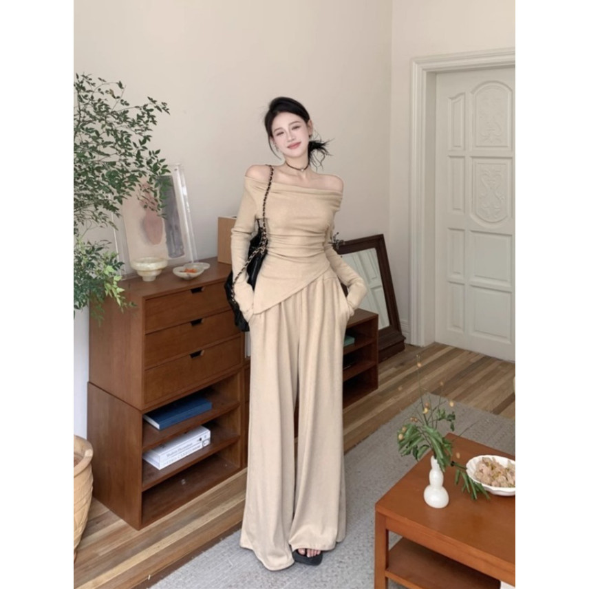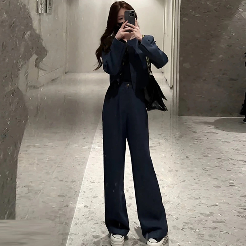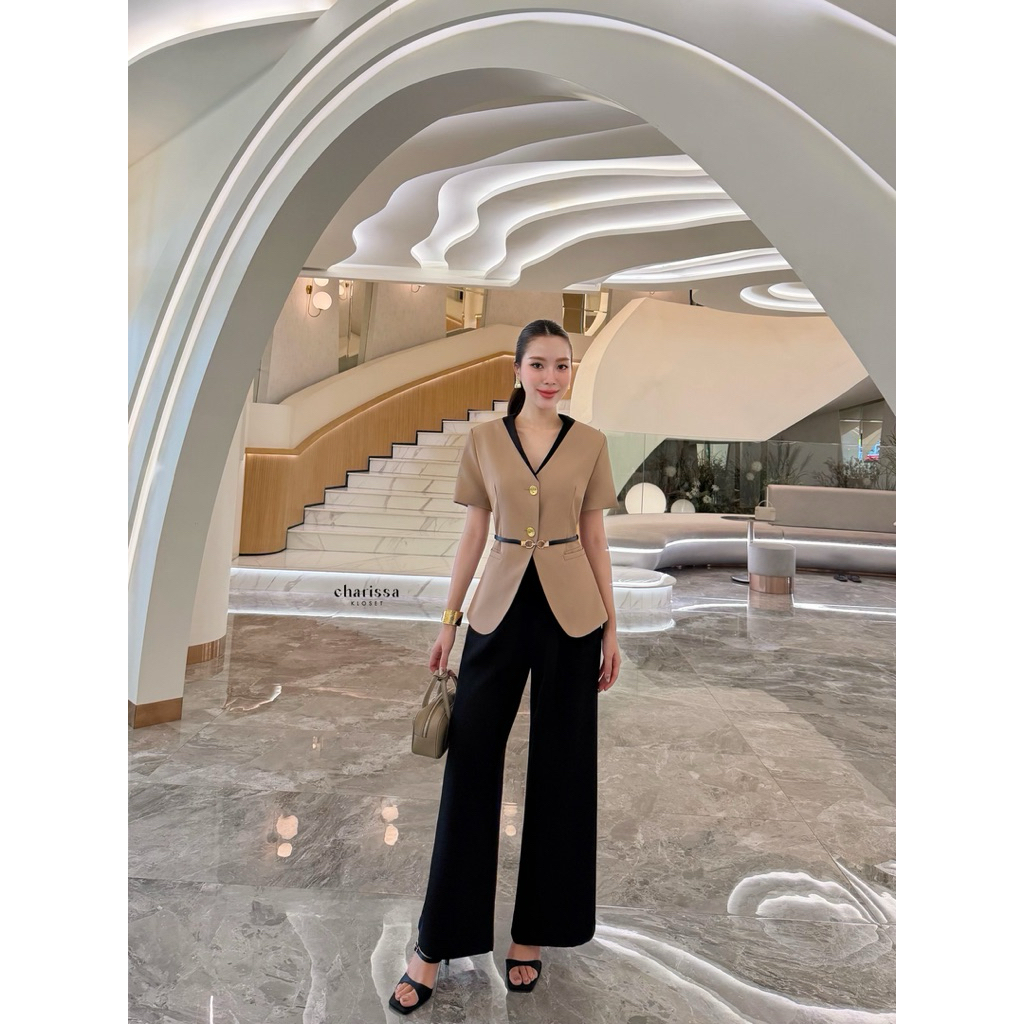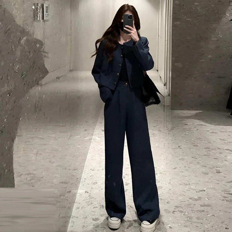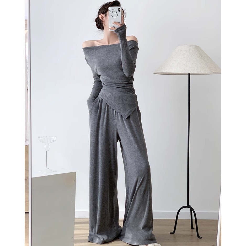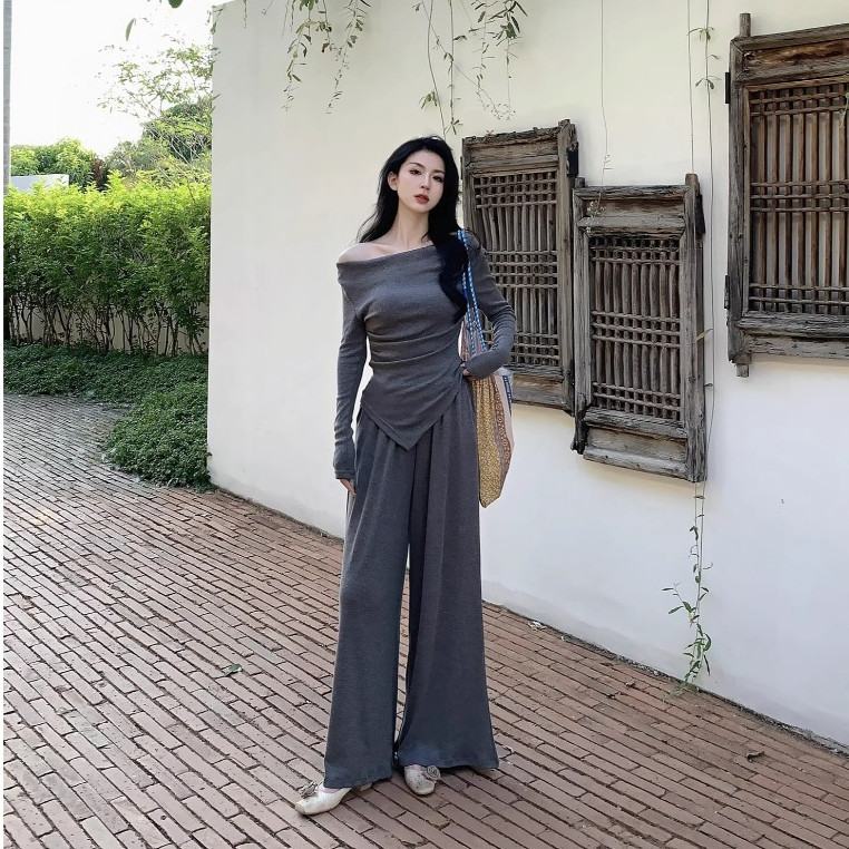 เสื้อสูท/แจ็คเก็ต แขนยาว คอกลม สีกรม กระดุมหน้า กระเป๋า2 ข้างมีซับใน + กางเกงขากระบอกใหญ่ เอวยางยืด ซิปหน้า #10113