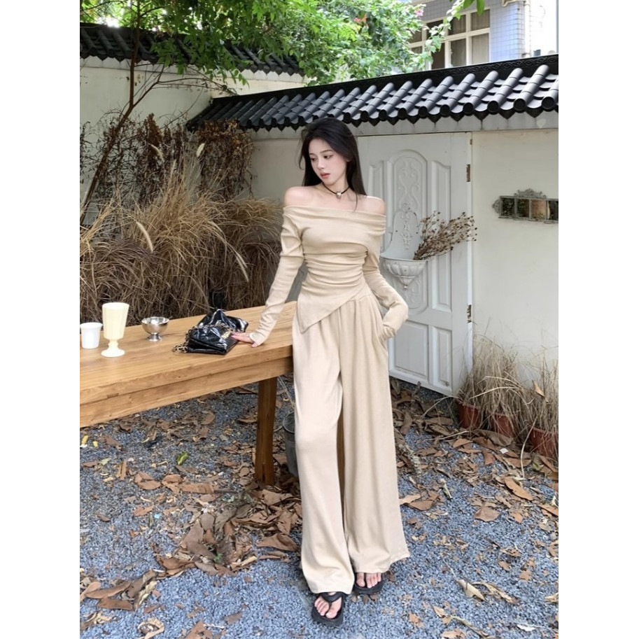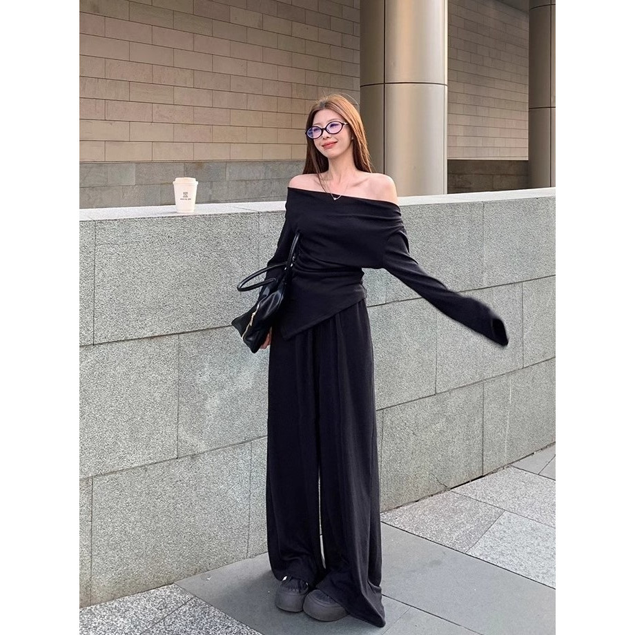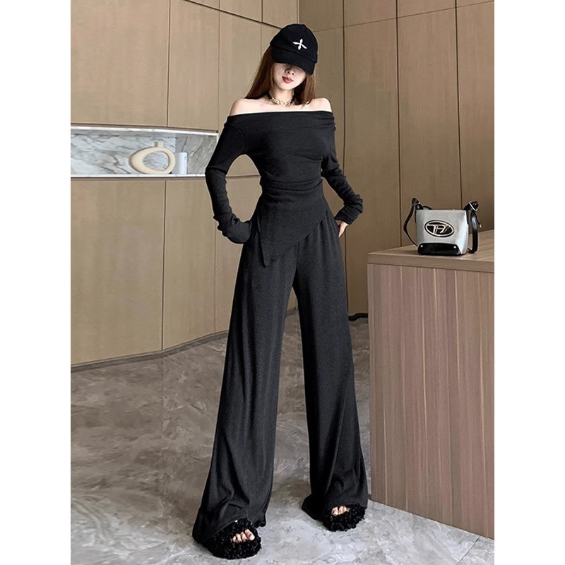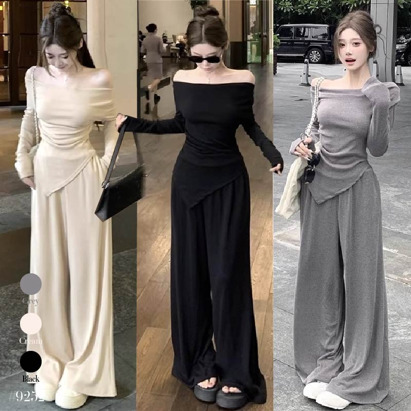 เสื้อยืดแขนยาวผู้หญิง สีดำ เซ็ต2ชิ้น คอถ่วง จับจีบเอว ชายเสื้อแหลม+กางเกงขายาวยางยืด กระเป๋า2ข้าง #9252