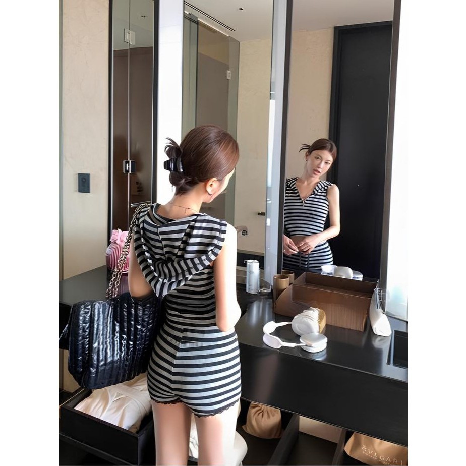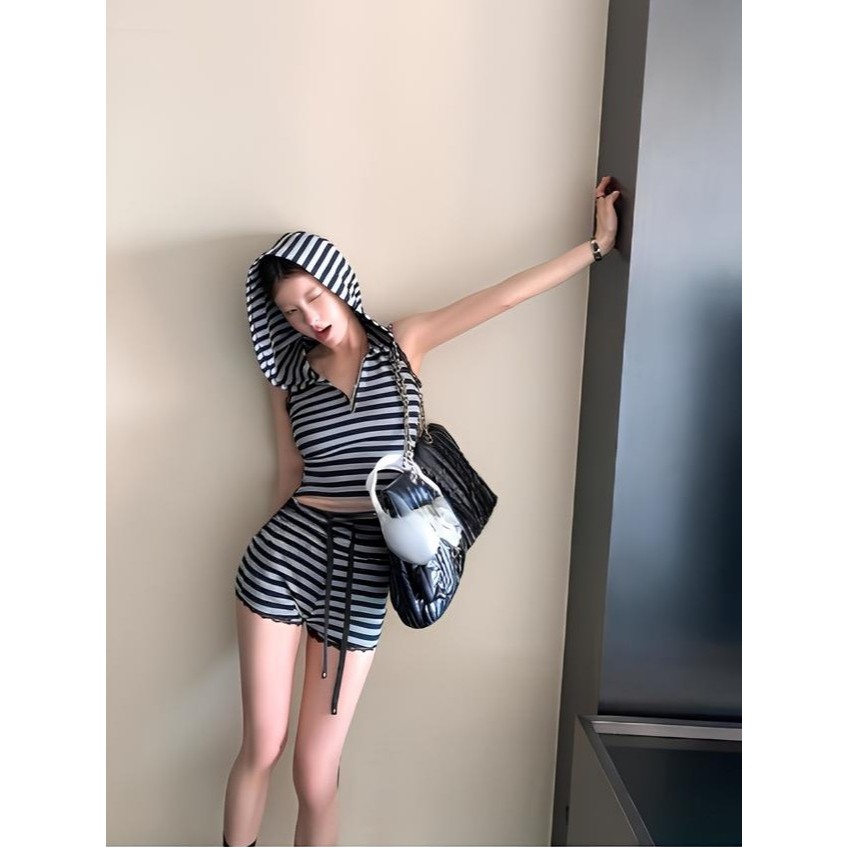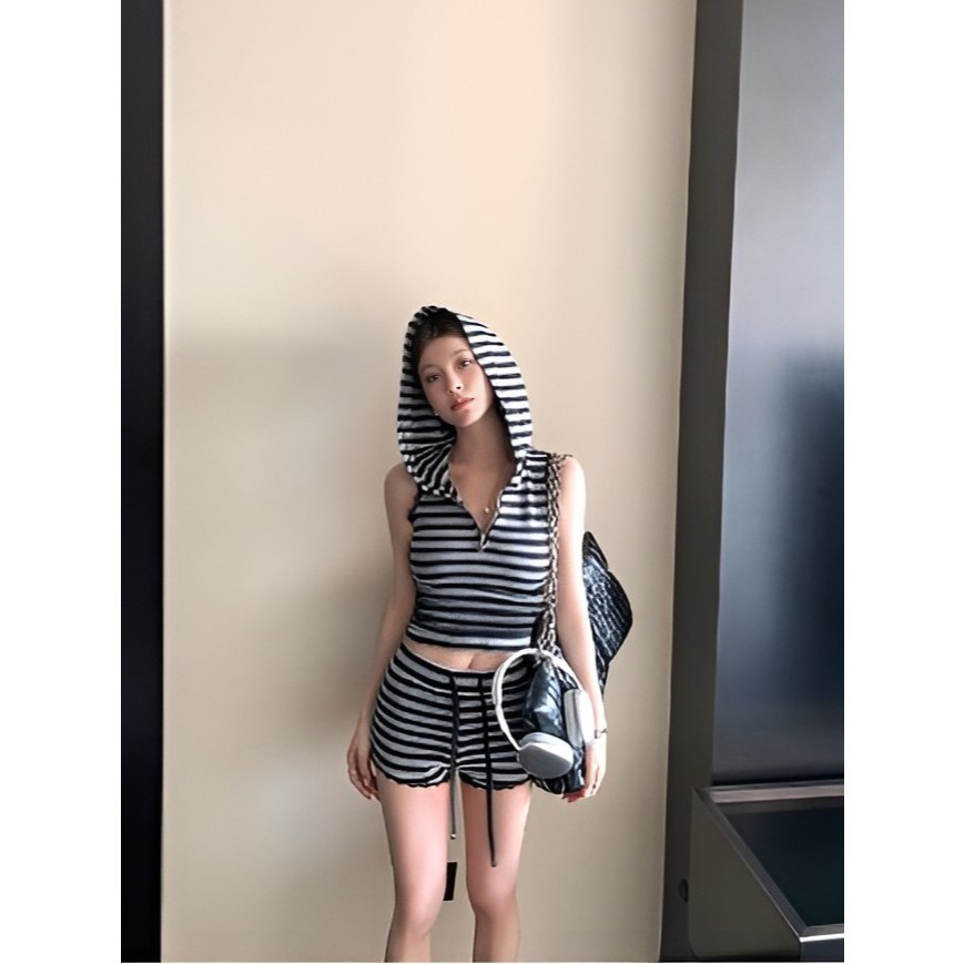 เสื้อยืดมีฮู้ด แขนกุด ซิปหน้า สีเทาดำ ลายทาง + กางเกงเอวยางยืด มีเชือกรูดขาสั้น ชุดออกกำลังกาย #1301