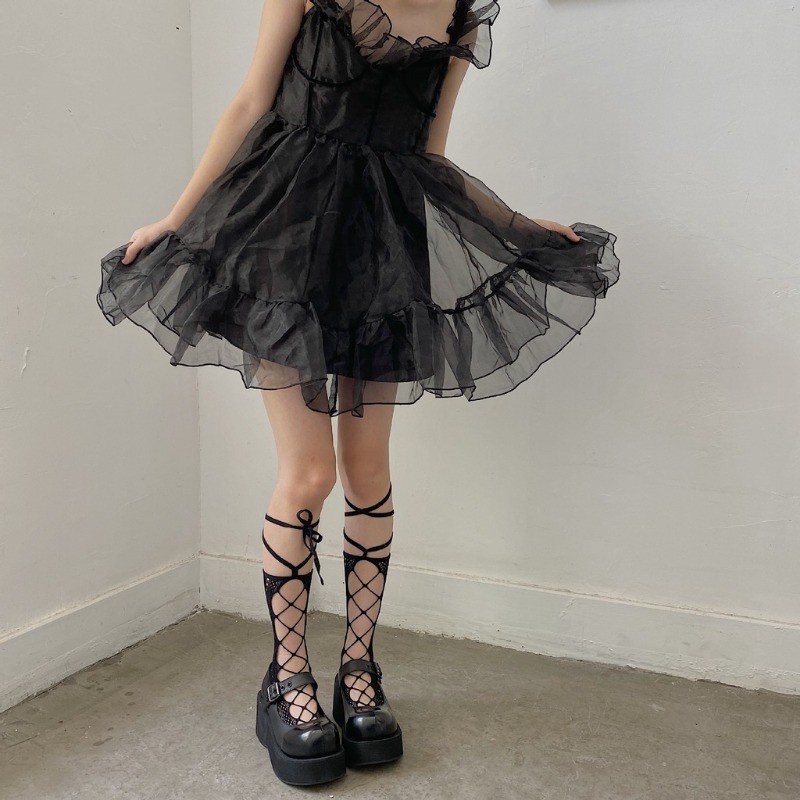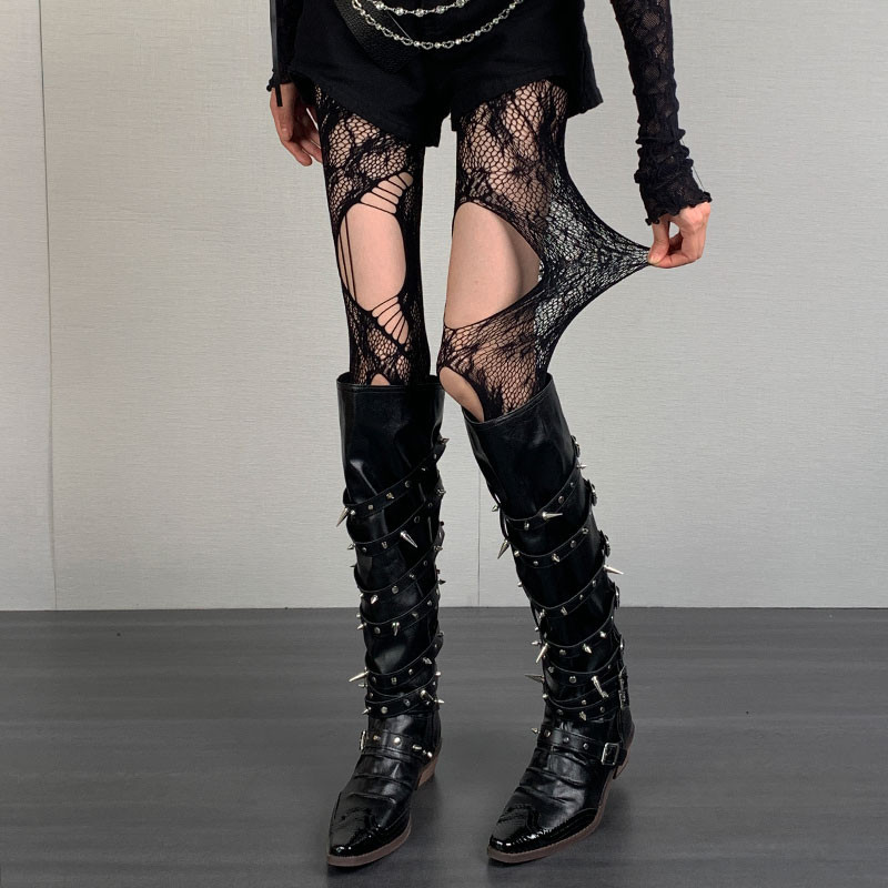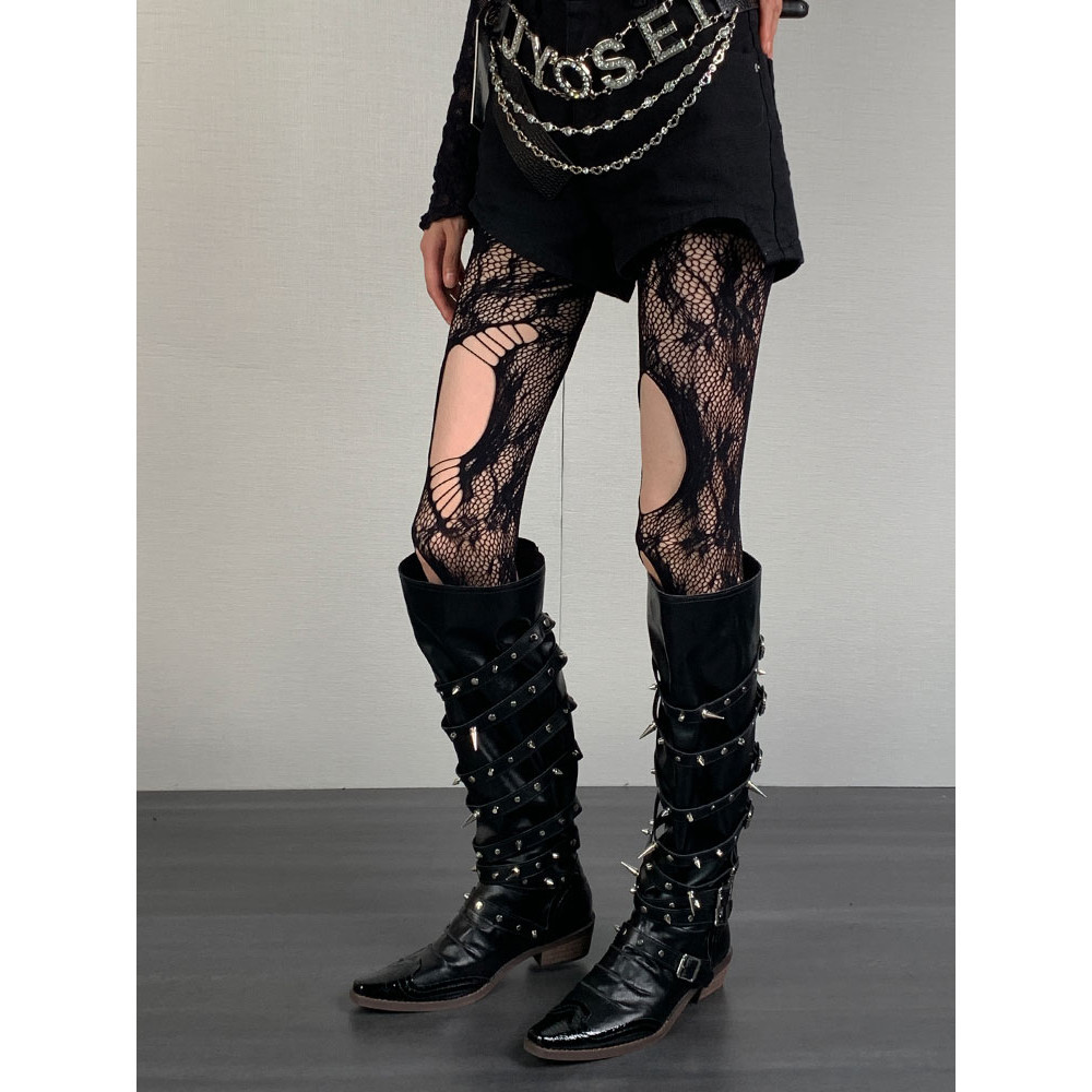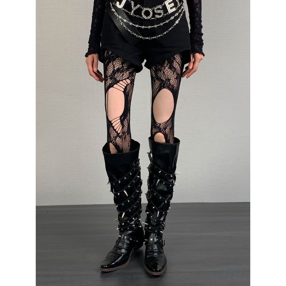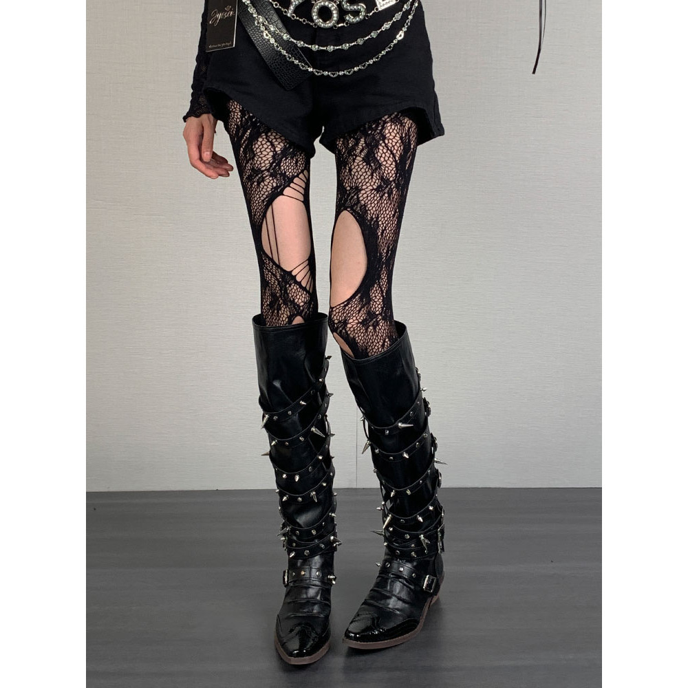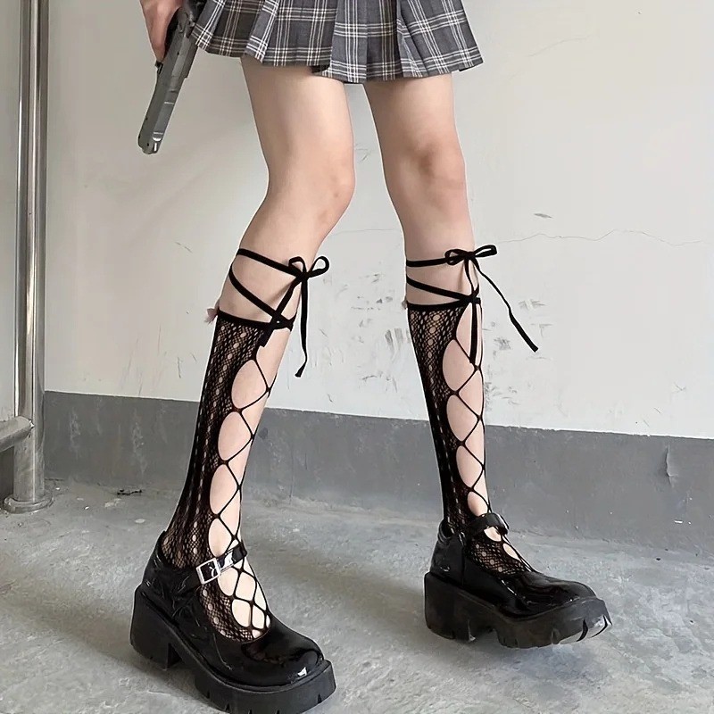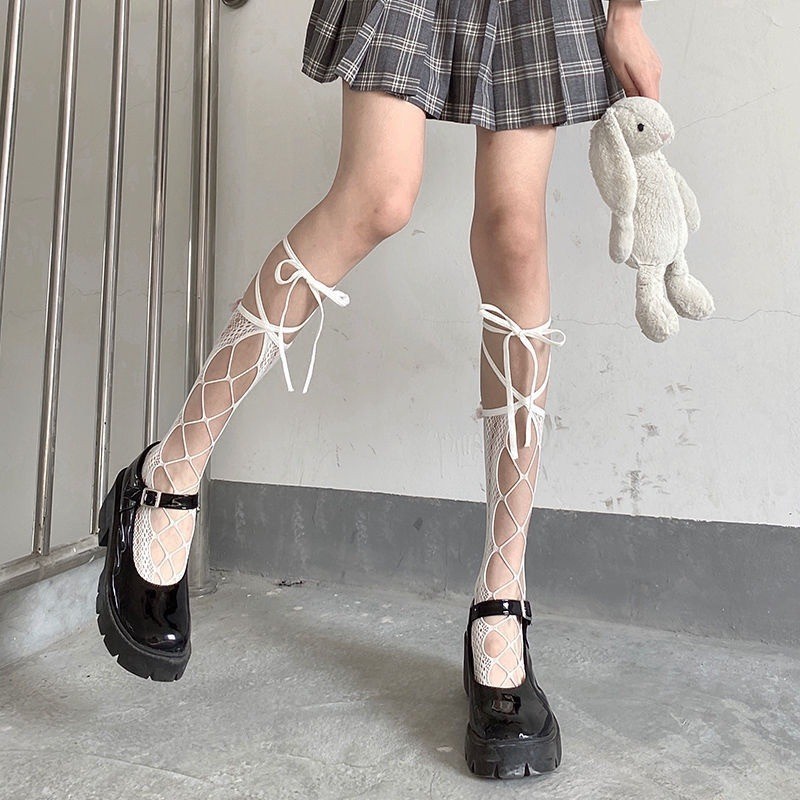 เจเค ถุงเท้าสายรัดน่องกับสายไขว้-โบว์ตาข่ายลูกไม้ ยืดหยุ่น แหอวน ตาข่ายถุงน่องยาว-ผู้หญิงเซ็กซี่ข้ามริบบิ้นถุงเท้าเข่า