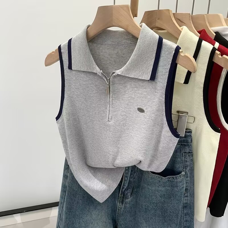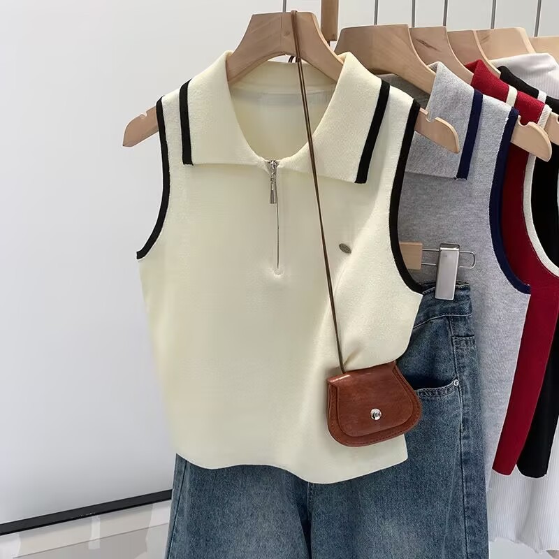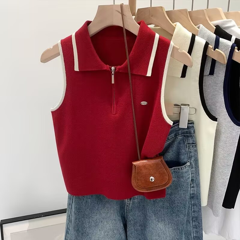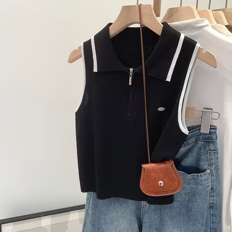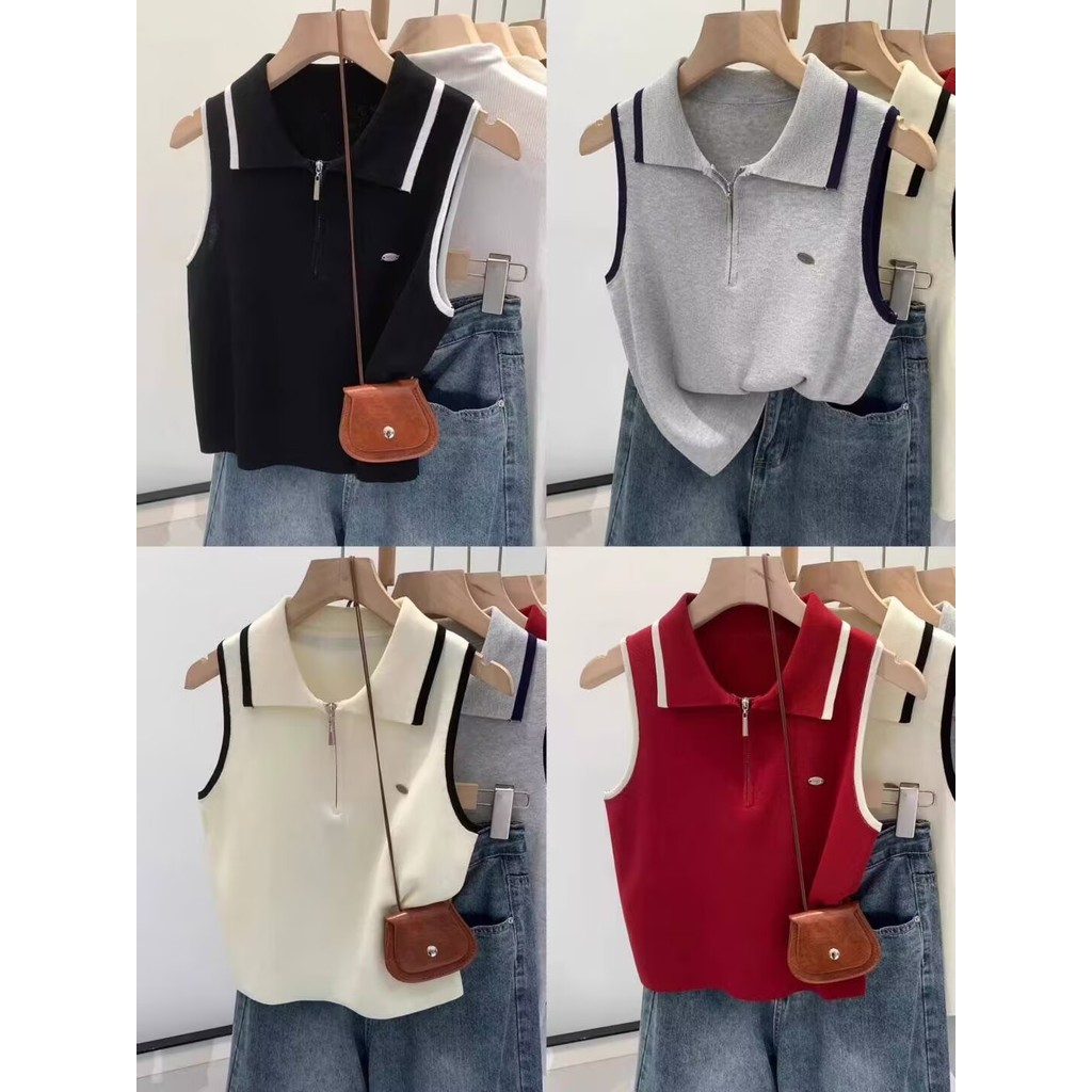 Balamy Polo Lapel ครึ่งซิปรองเท้านอนแขนกุดสำหรับผู้หญิง สไตล์ใหม่ฤดูร้อน