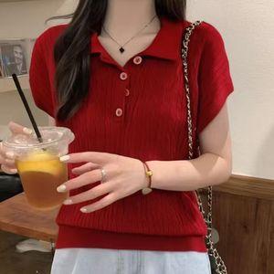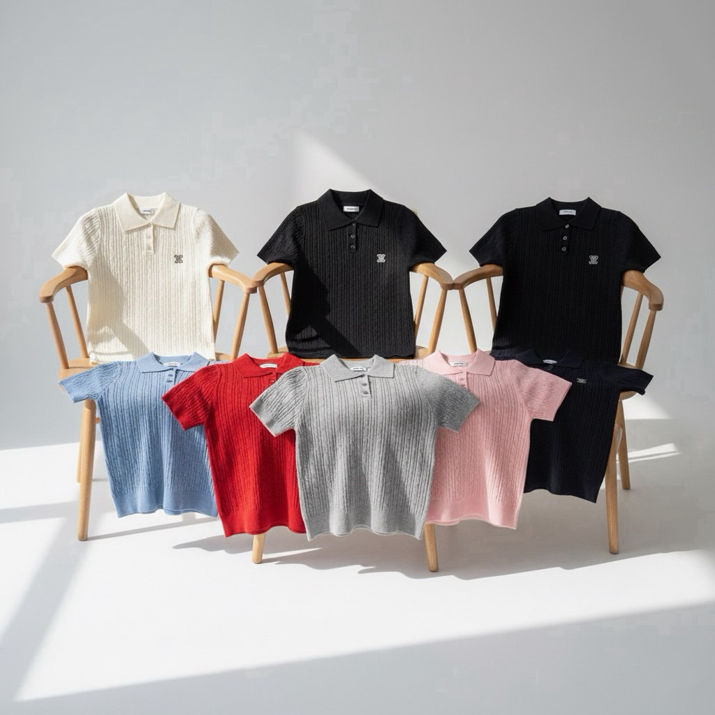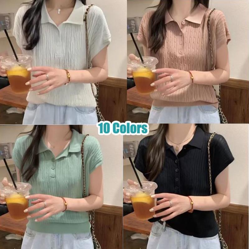 C&T#เสื้อยืดคอโปโลถักแขนสั้นผู้หญิง ทรงเข้ารูป มีให้เลือก 10 สี: ดำ ขาว แอปริคอต ชมพู และแดง#88035
