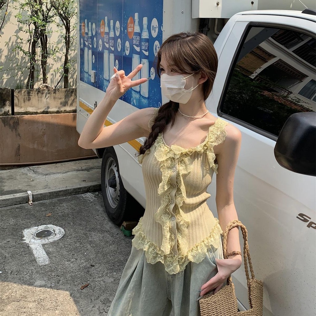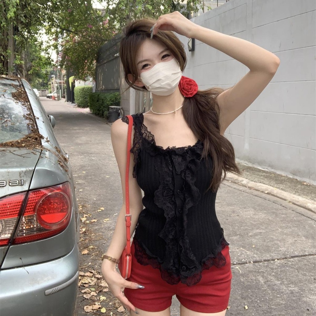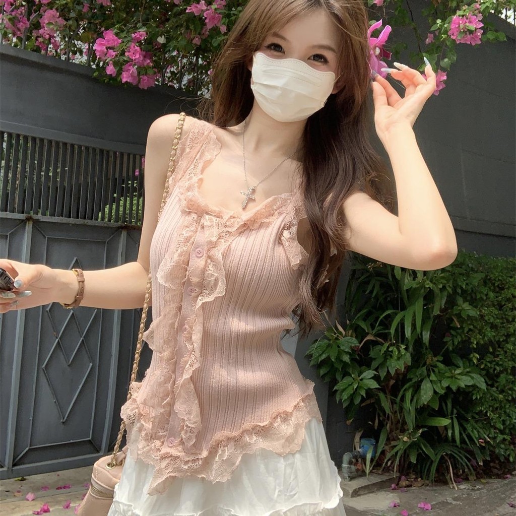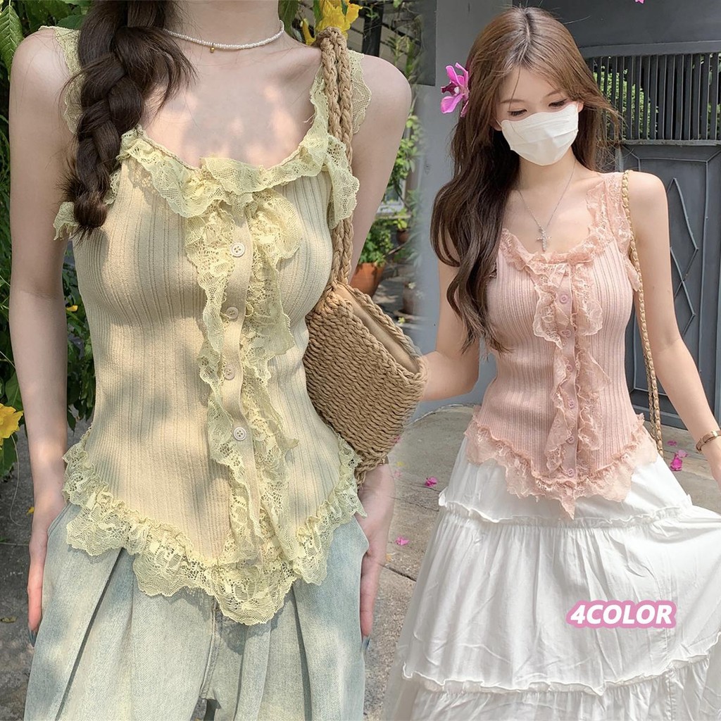 ?Anna? เสื้อไหมพรมแขนกุดลูกไม้ตัวสั้นหวานๆ ดีไซน์สวย ผ้ามีความยืดหยุ่น สวมใส่สบาย เสื้อผ้าแฟชั่นสวยๆ #D625