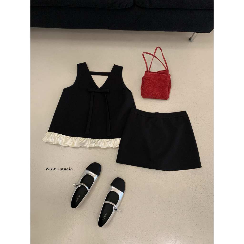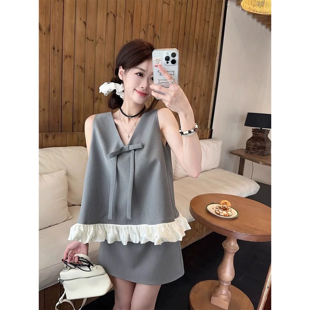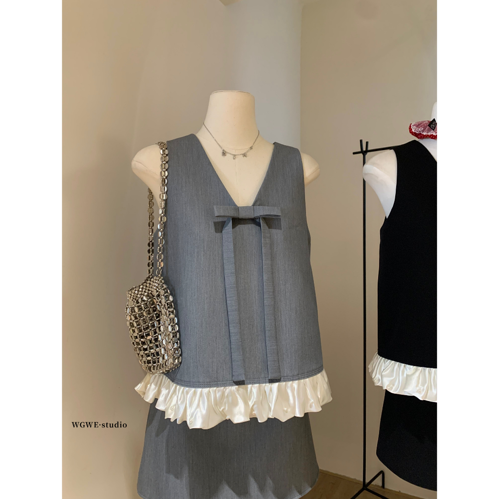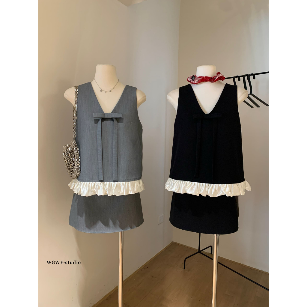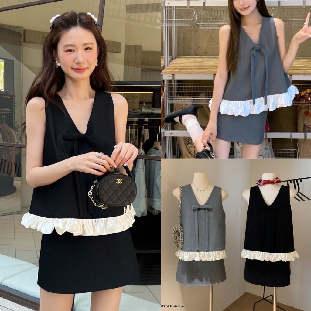 ?? ?? W6055 เซ็ท 2 ชิ้น เสื้อแขนกุดแต่งโบว์และชายเสื้อแต่งผ้า+กระโปรงสั้น มีซับใน แฟชั่นเกาหลี TAG WG.WE ??