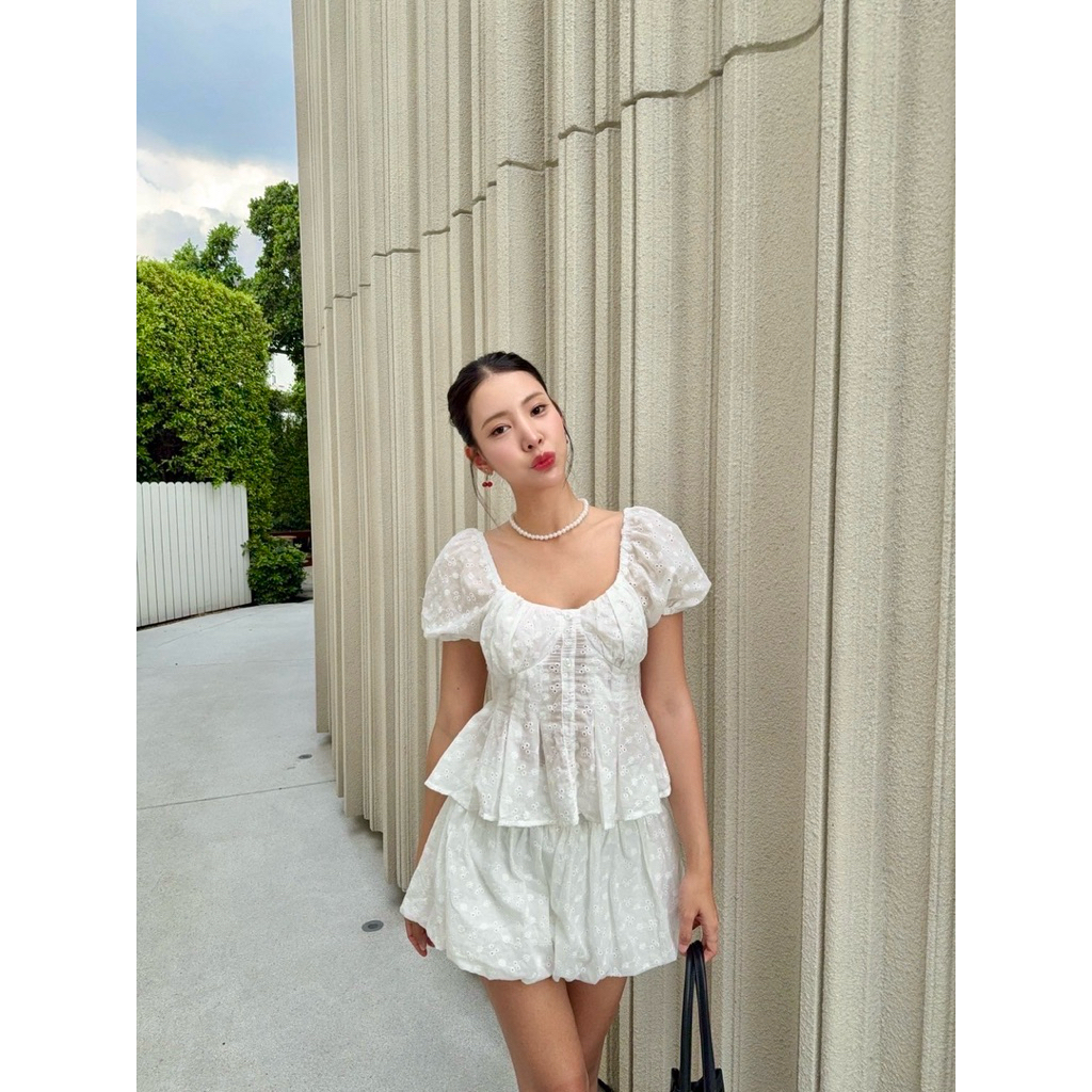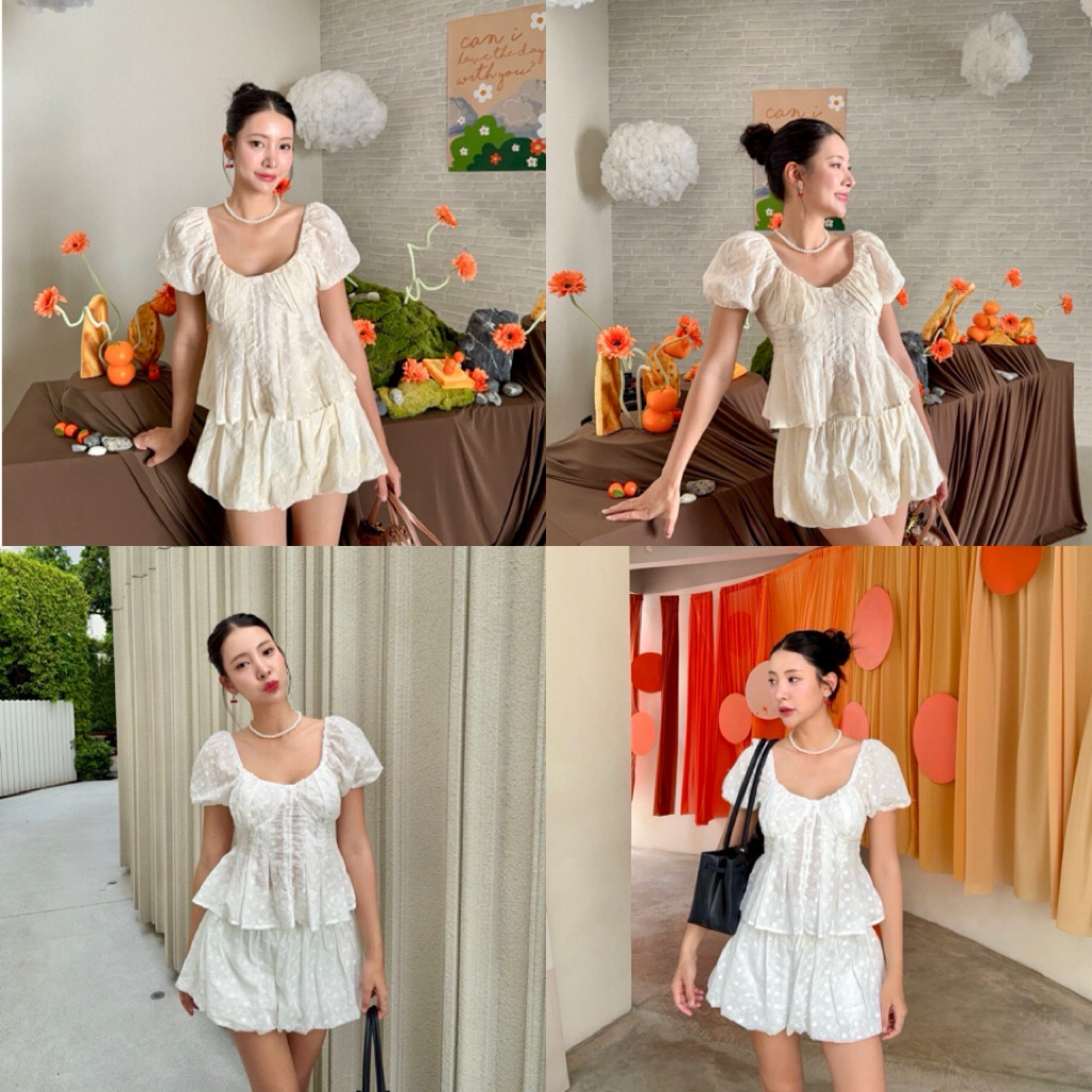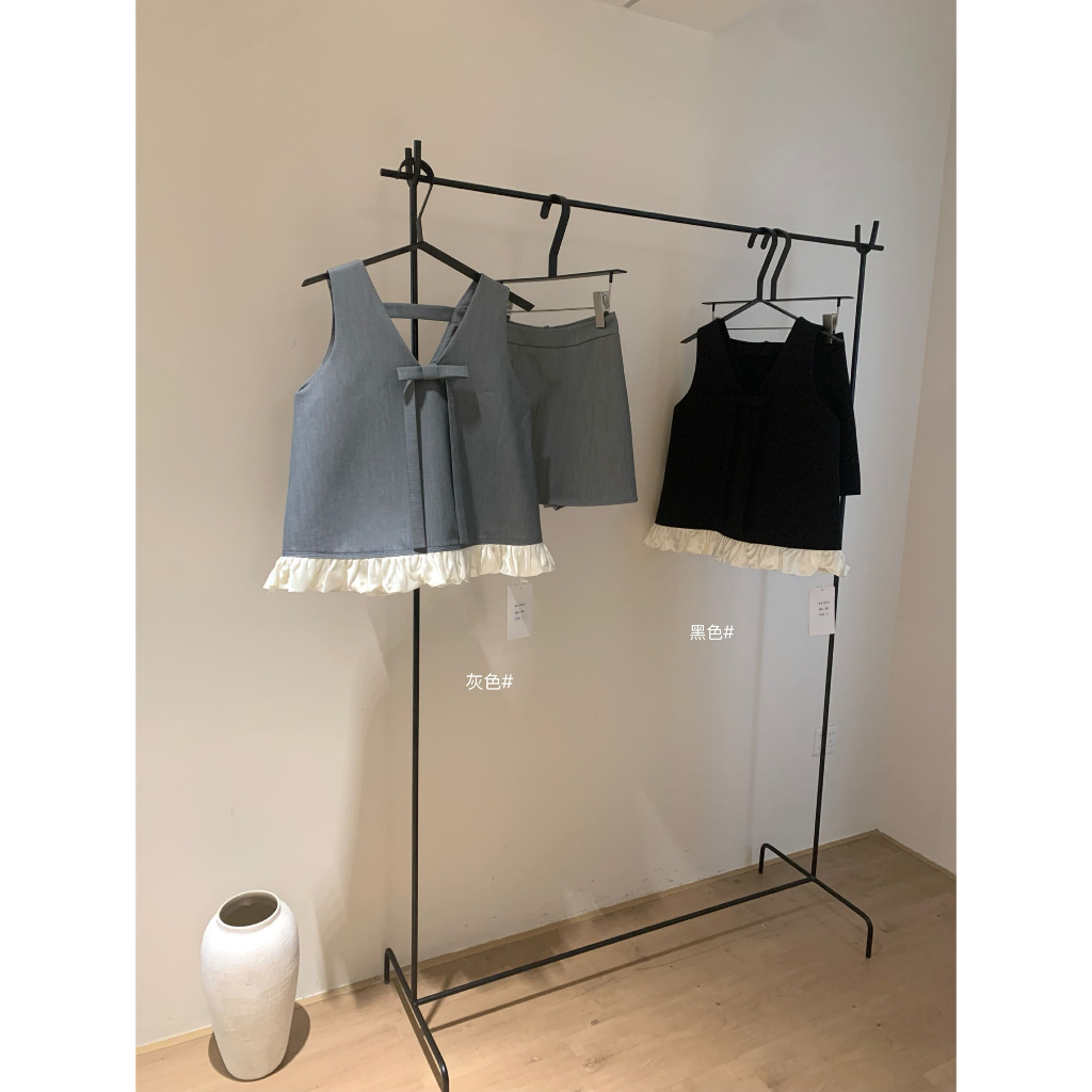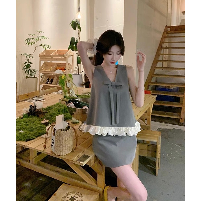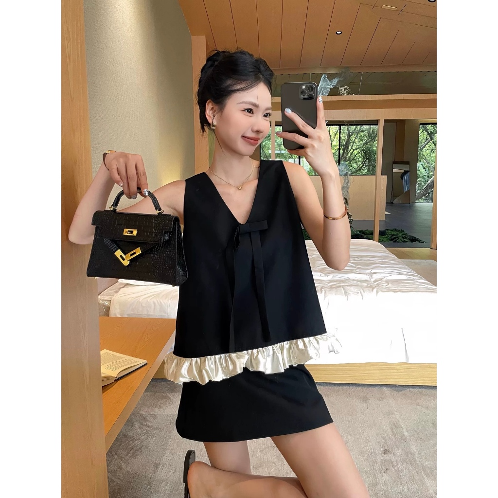 ?? ?? W6055 เซ็ท 2 ชิ้น เสื้อแขนกุดแต่งโบว์และชายเสื้อแต่งผ้า+กระโปรงสั้น มีซับใน แฟชั่นเกาหลี TAG WG.WE ??