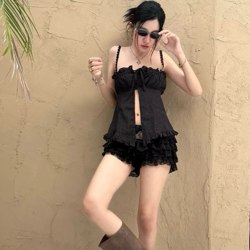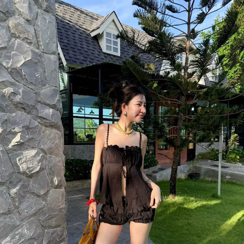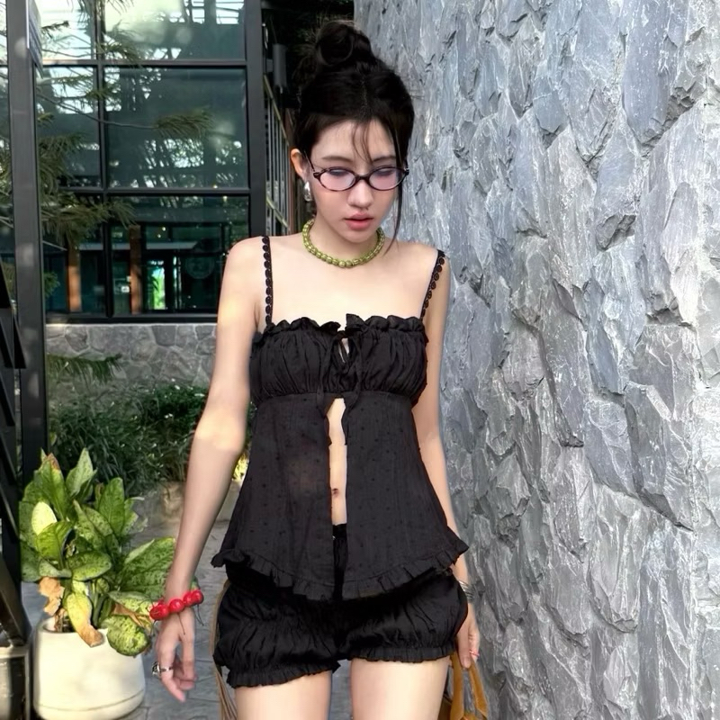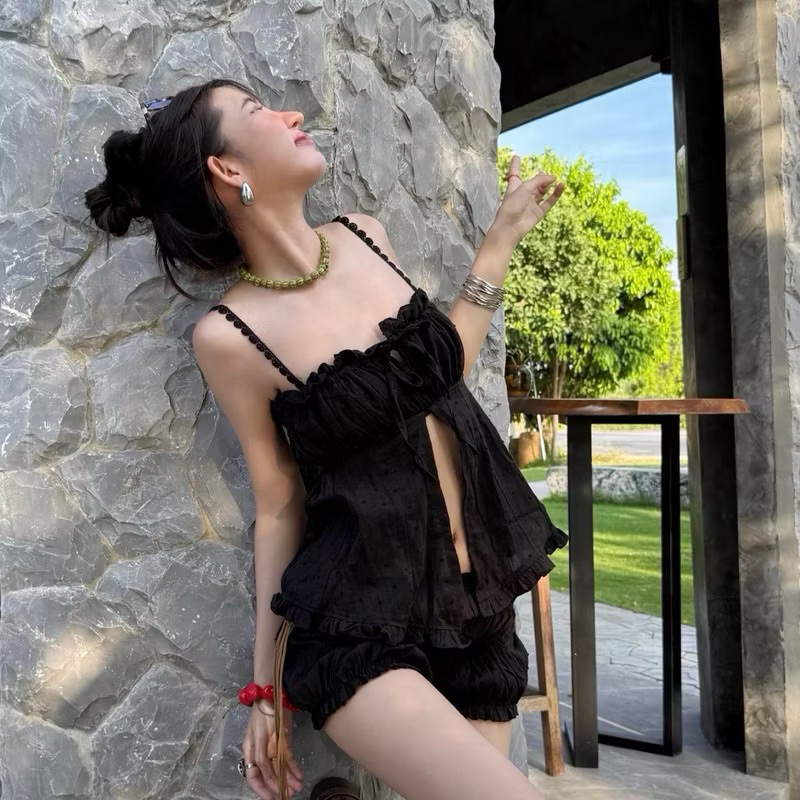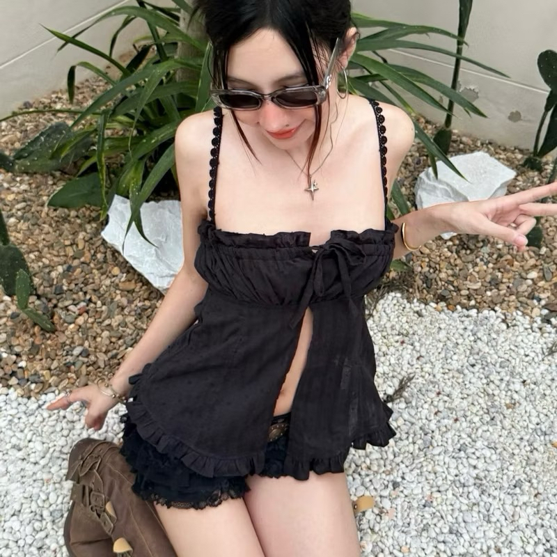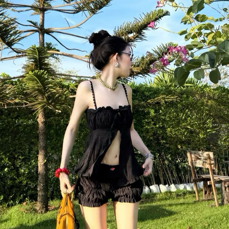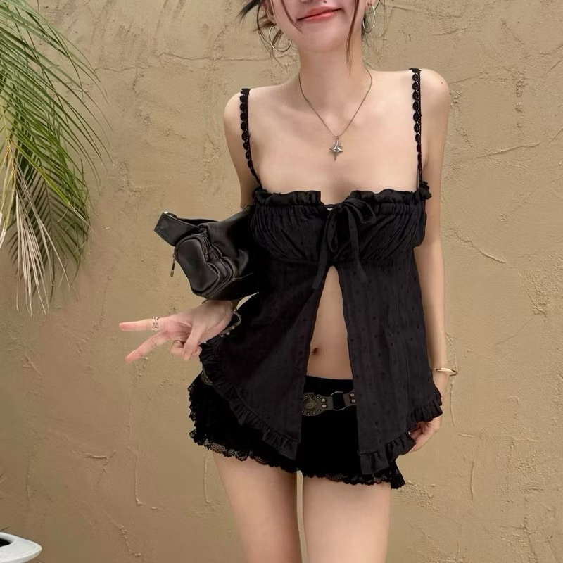 ? งานป้าย Swimol ? เสื้อสายเดี่ยวอกระบาย ผูกโบว์หน้า สีดำ