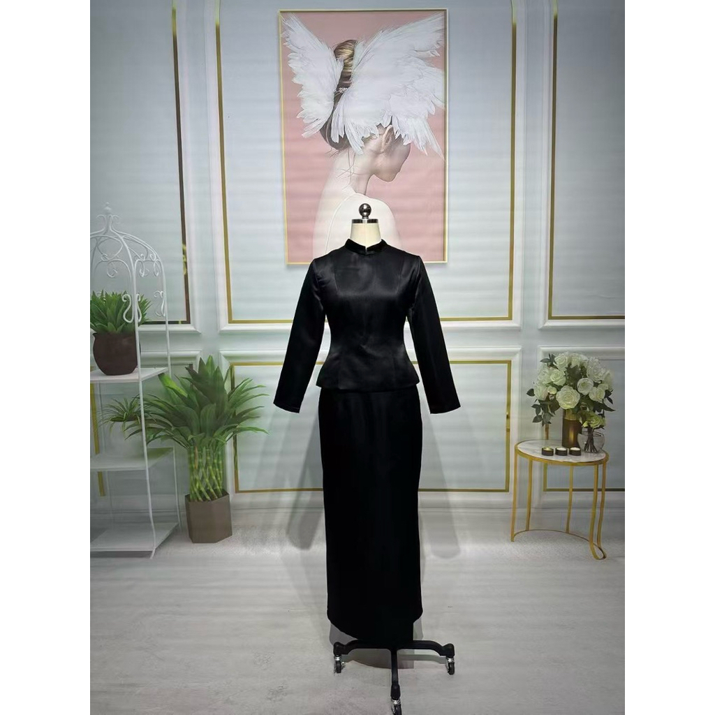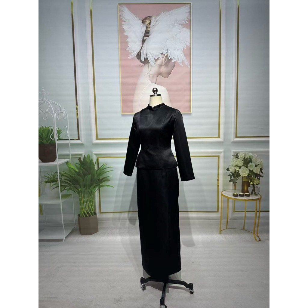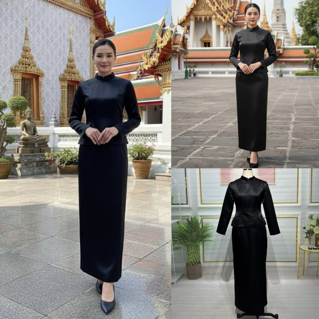 ❌พร้อมส่งM-4XL❌ป้าย ANANYA ชุดไทยบรมพิมานสีดำ งานตามหา ใส่ไว้อาลัย เสื้อคอตั้ง แขนยาว+ผ้าถุงสำเร็จรูป ทรงป้ายหน้าผ่าหลัง