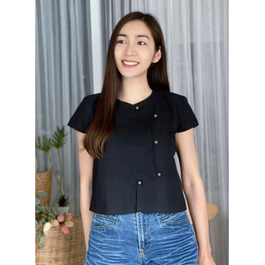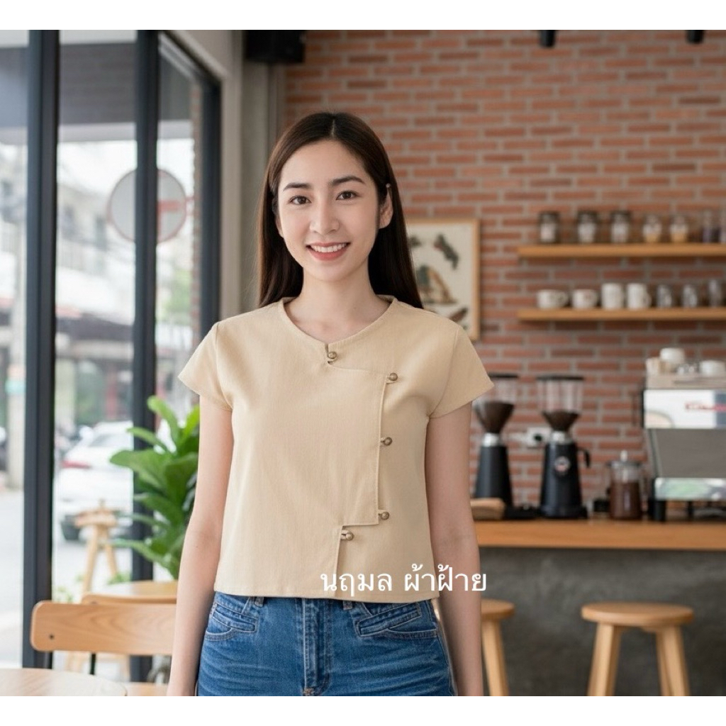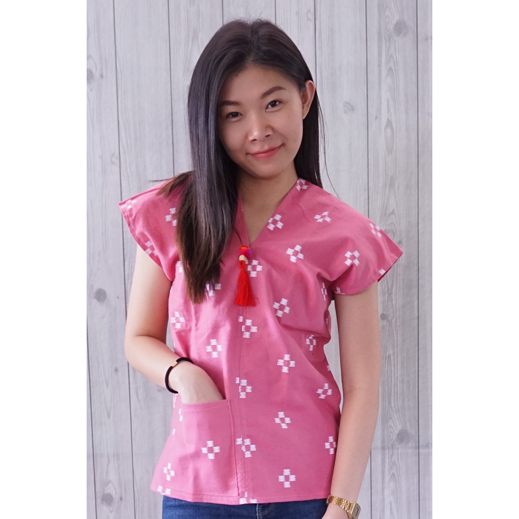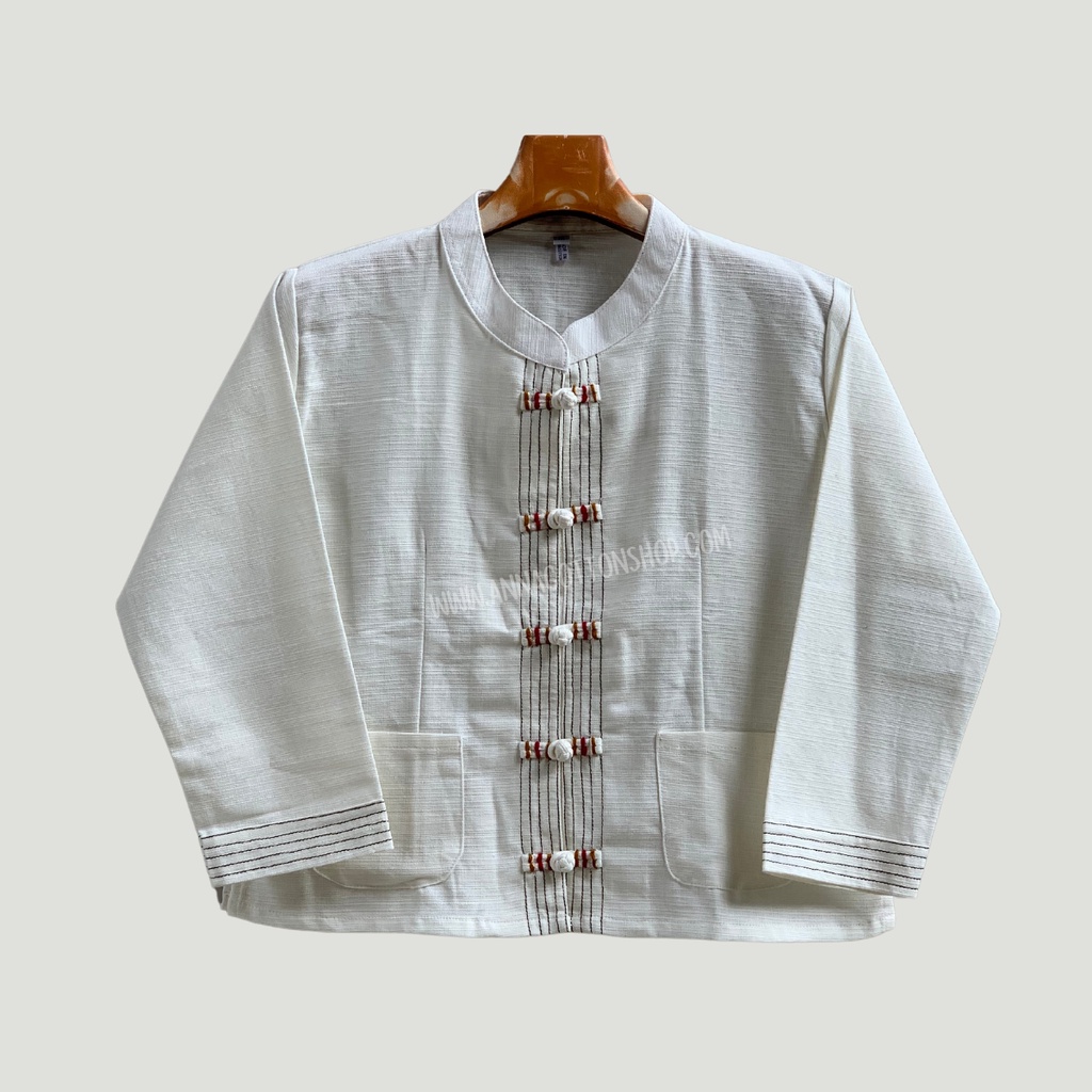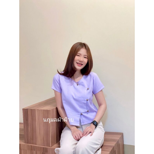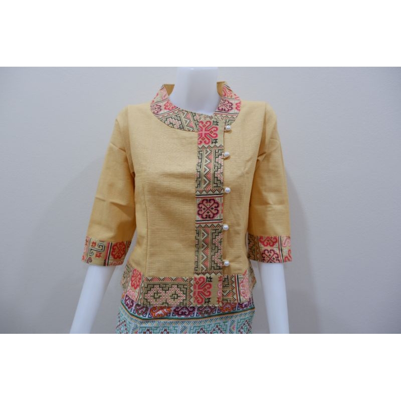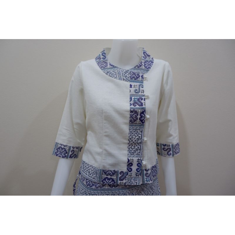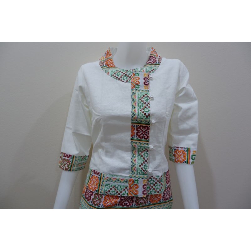เสื้อผ้าฝ้ายพื้นเมืองผู้หญืงแบบคอกลมป้าย