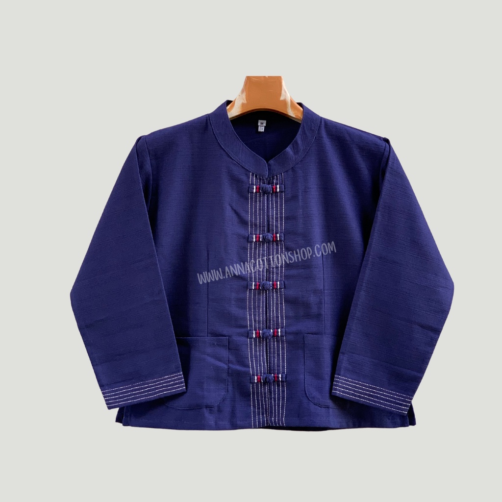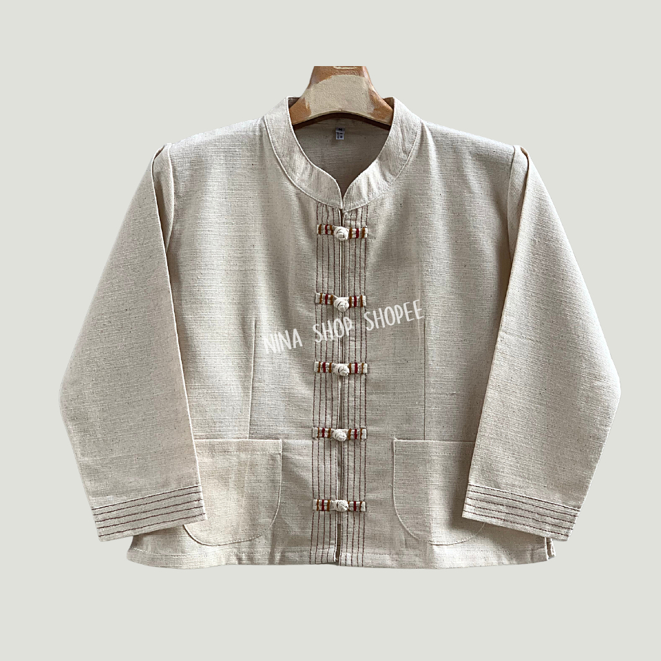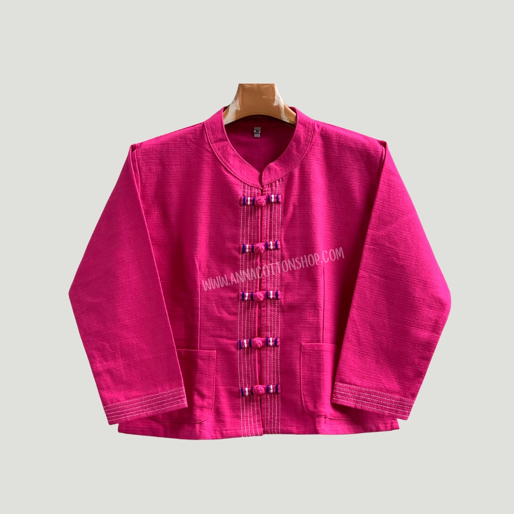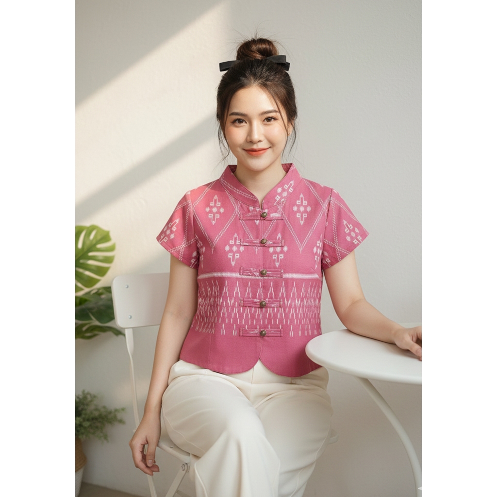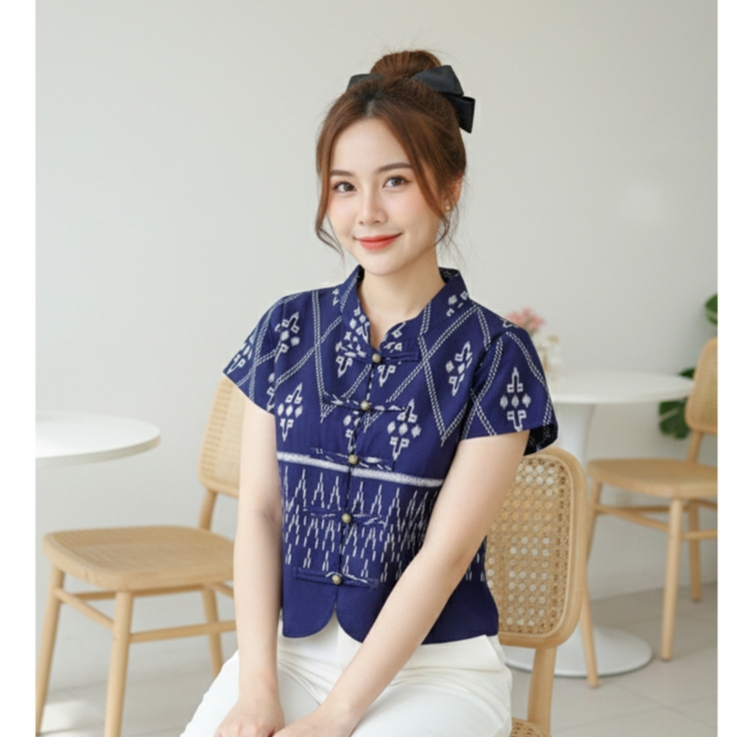เสื้อผ้าฝ้ายคอจีนป้ายหน้าแต่งลายมัดหมี่