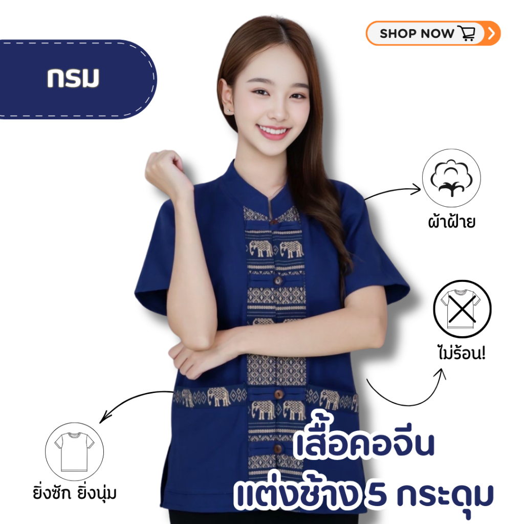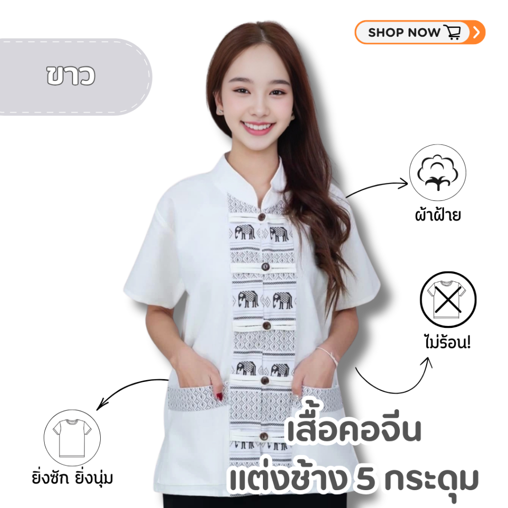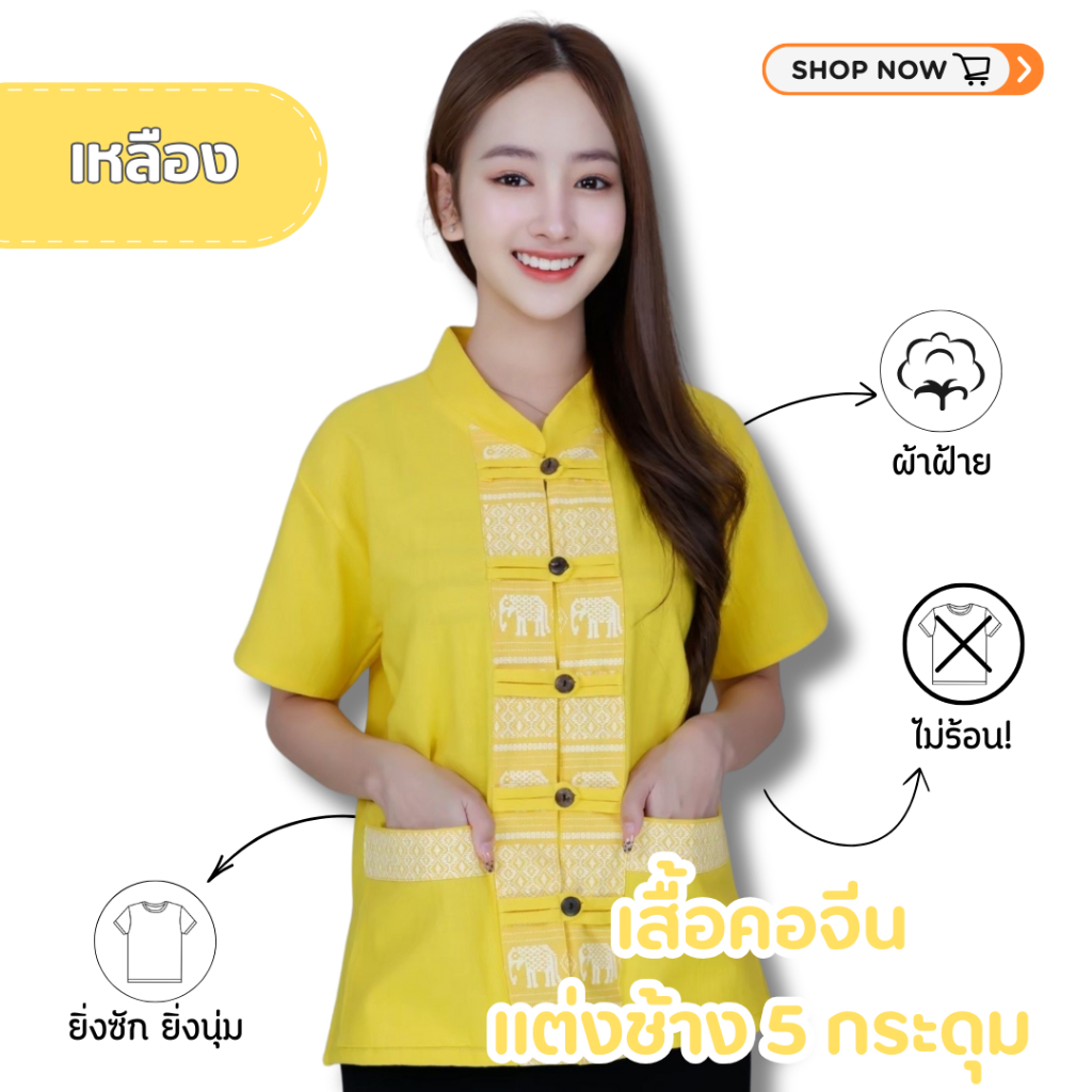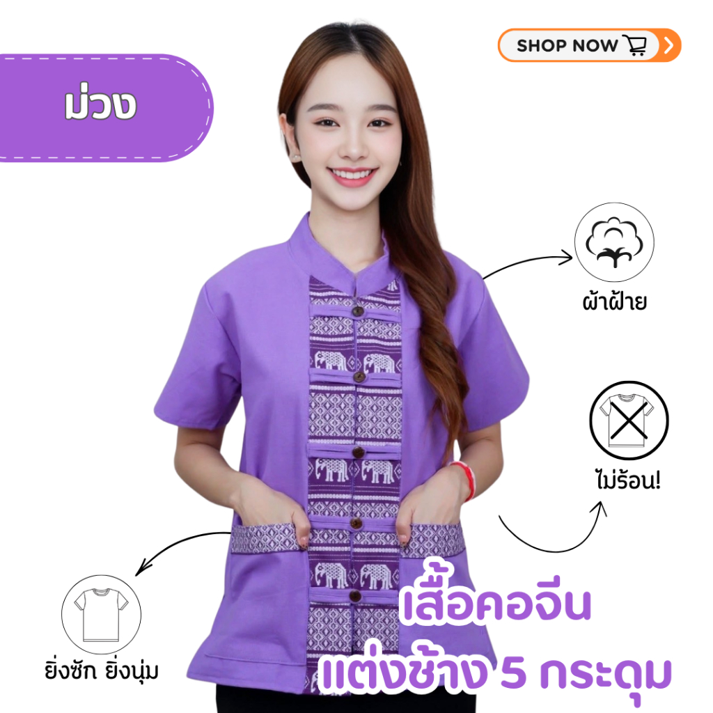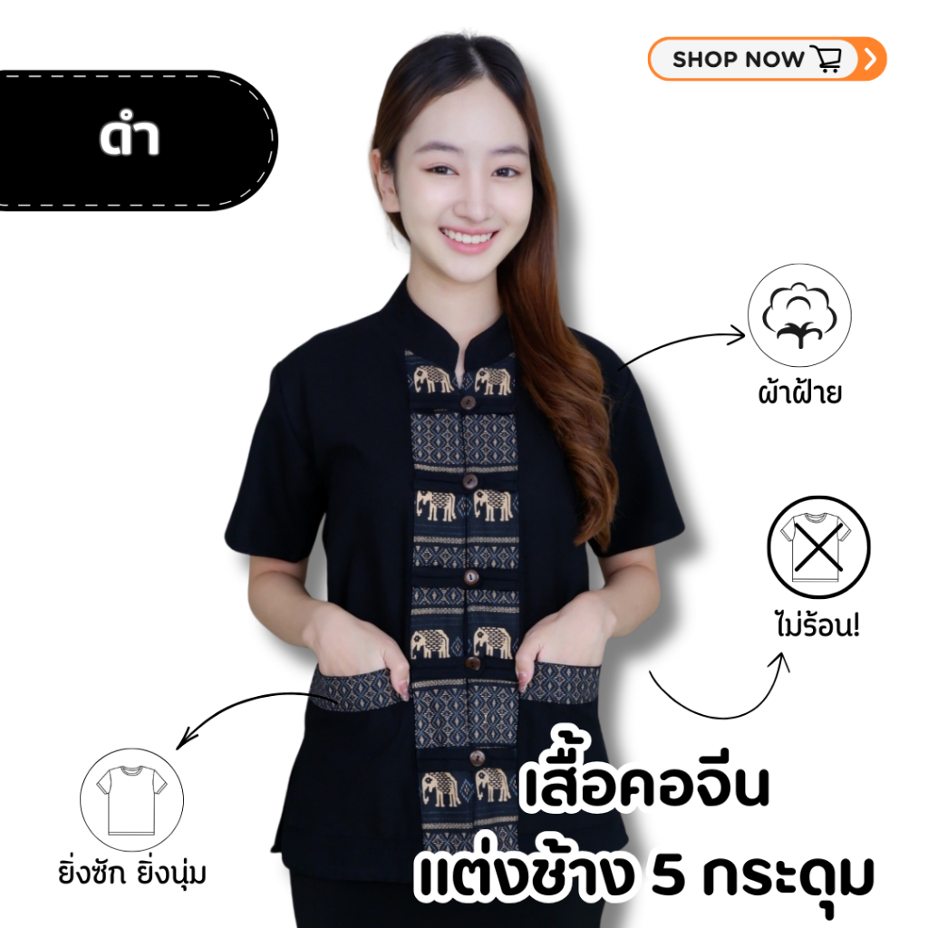 เสื้อผ้าฝ้ายฟอกนุ่ม 5 กระดุมผ่าหน้า แต่งลายช้างแนวตั้งกระดุมใช้จริงได้ทุกเม็ด ใส่ได้ทุกเทศกาล