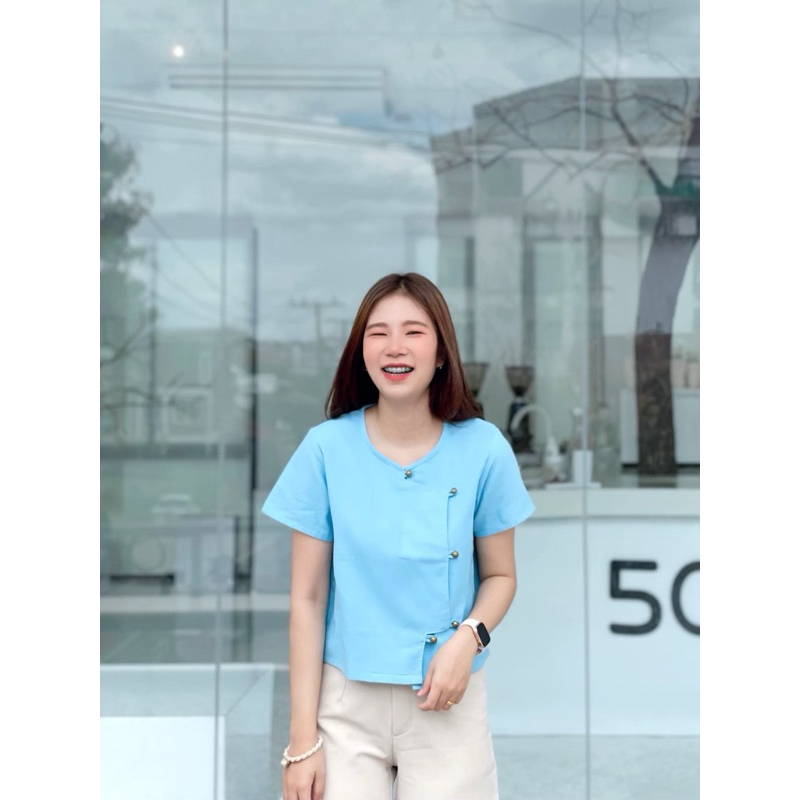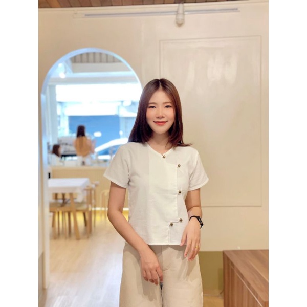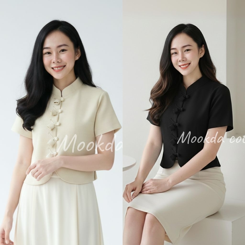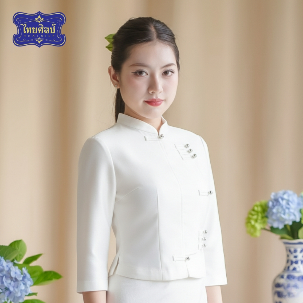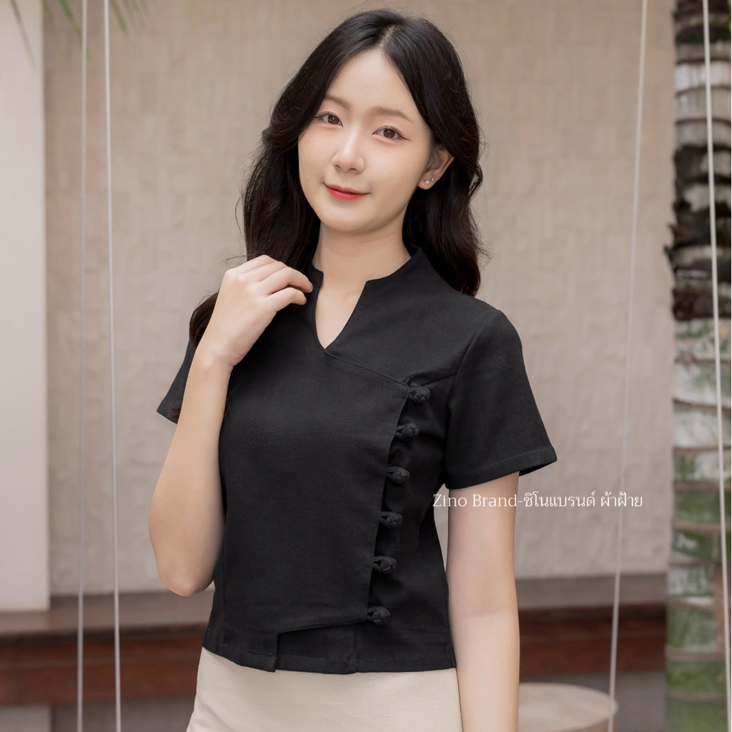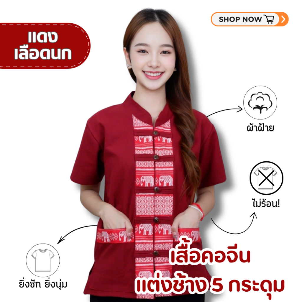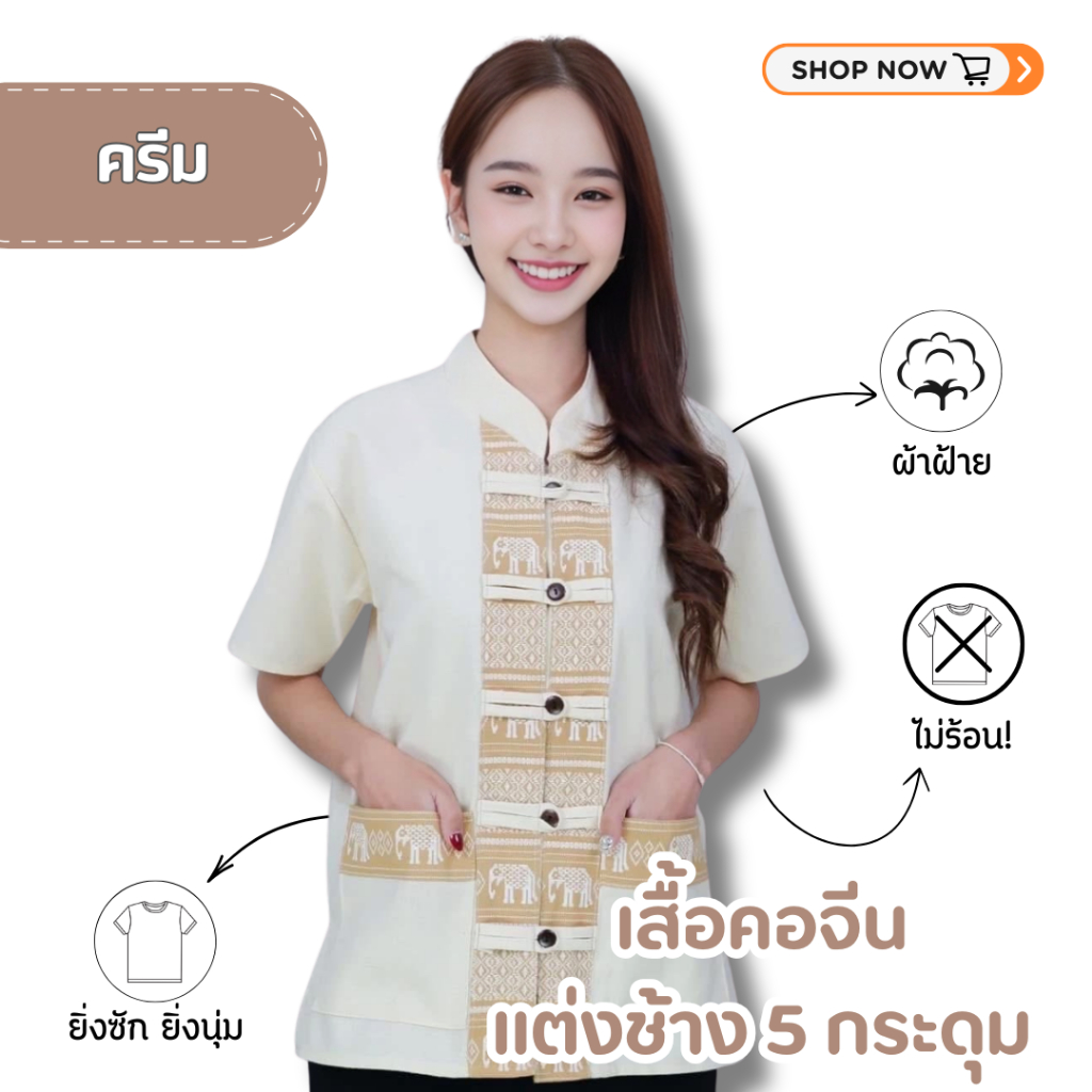 เสื้อผ้าฝ้ายฟอกนุ่ม 5 กระดุมผ่าหน้า แต่งลายช้างแนวตั้งกระดุมใช้จริงได้ทุกเม็ด ใส่ได้ทุกเทศกาล