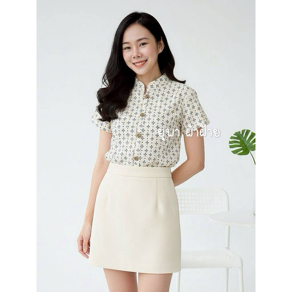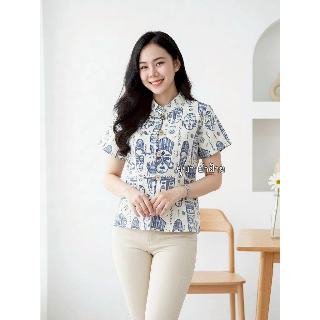 เสื้อผ้าฝ้ายพื้นเมือง คอจีนแต่งชายโค้ง ผ้าพิมพ์ลาย