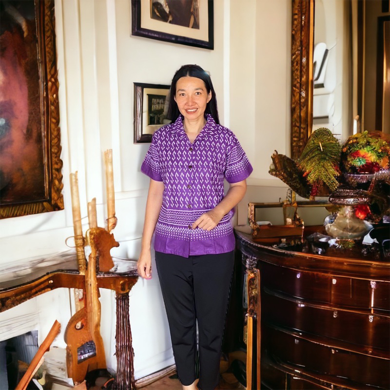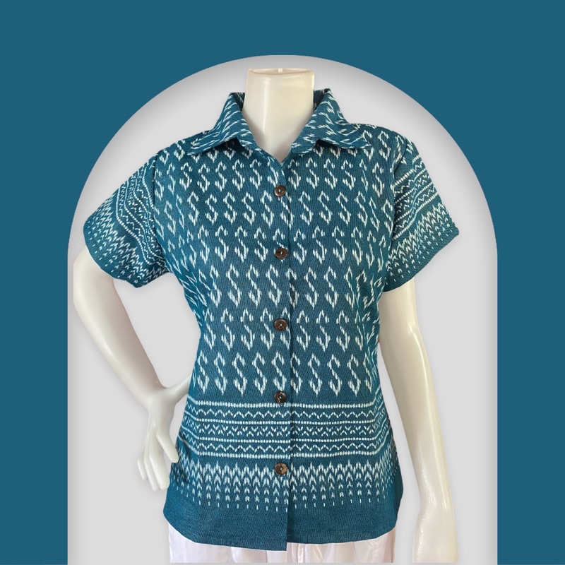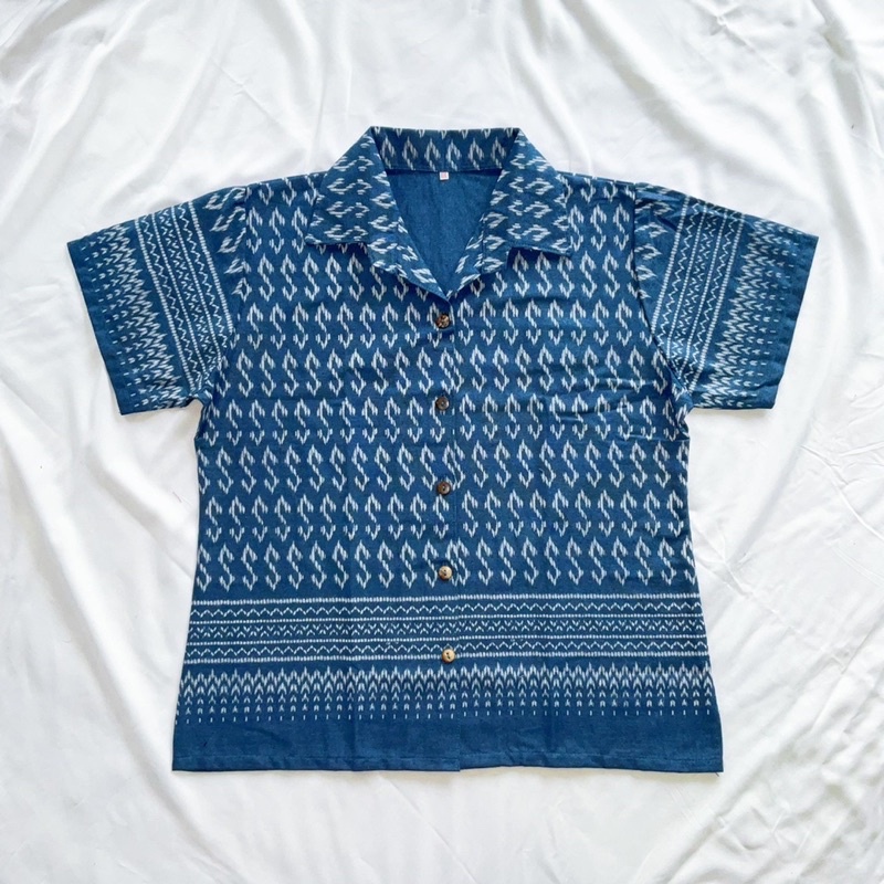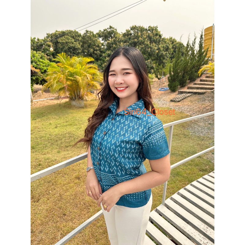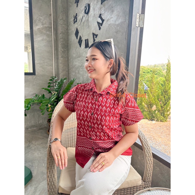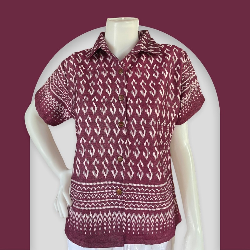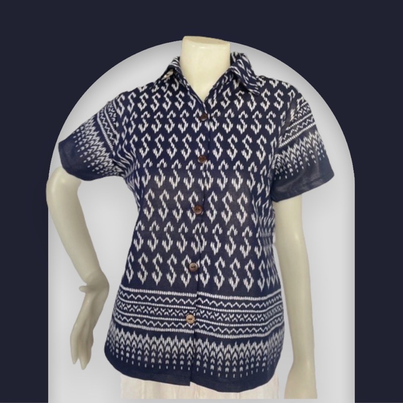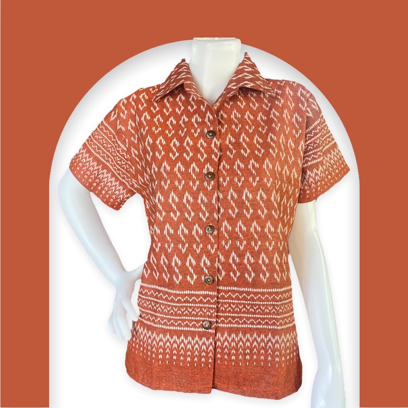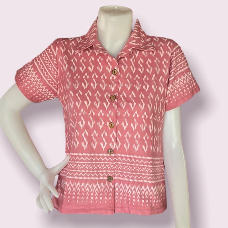 เสื้อหญิงคอฮาวาย เสื้อผ้าฝ้ายหมักโคลนลายขอ ลายผ้าพระราชทานฯ