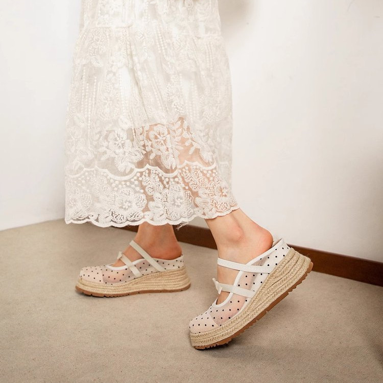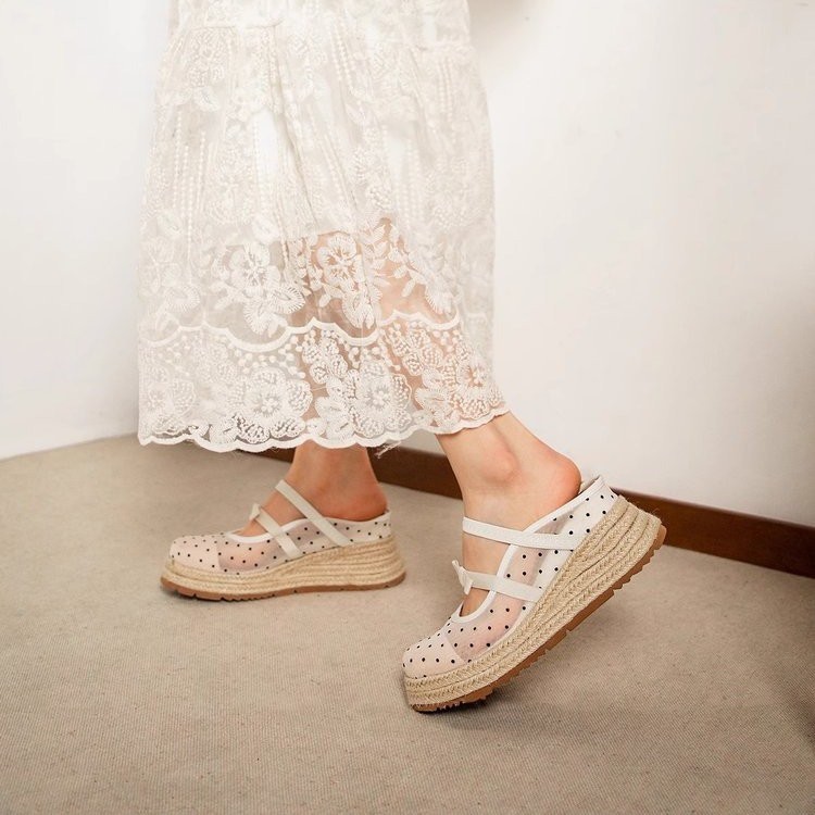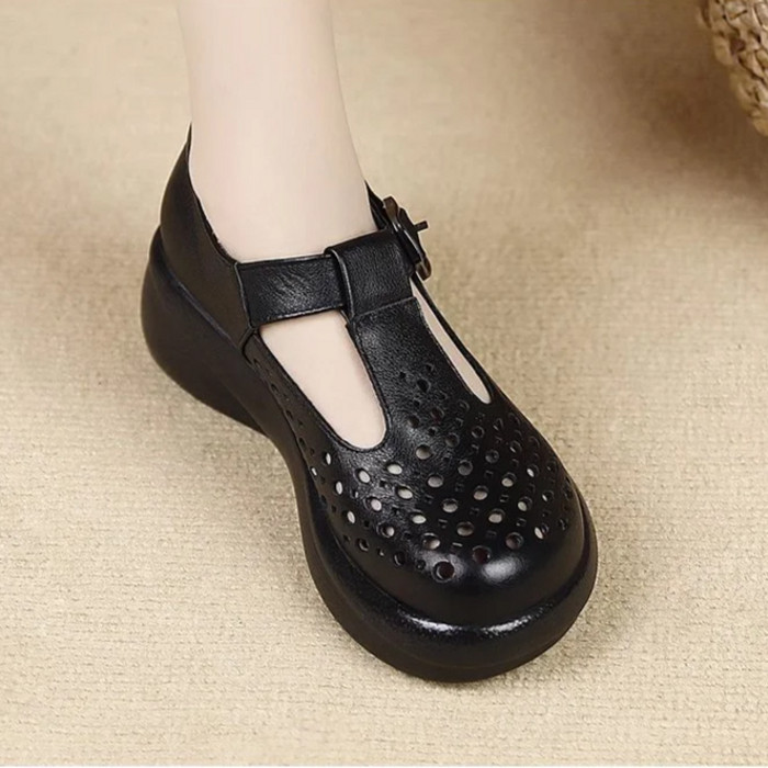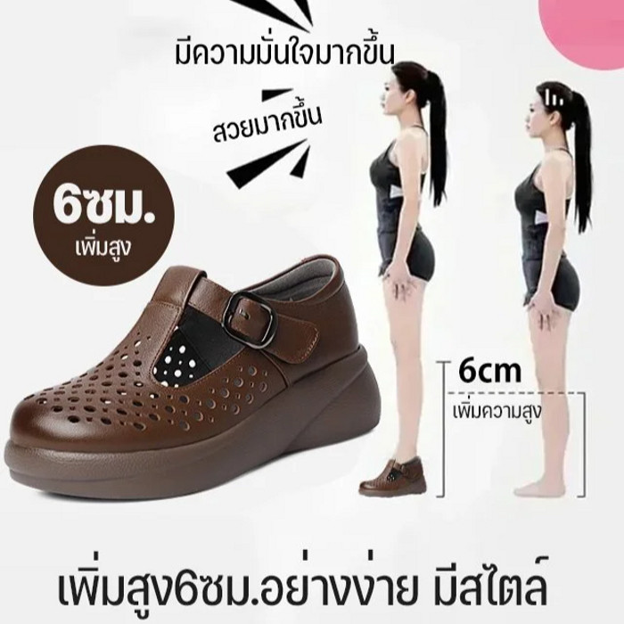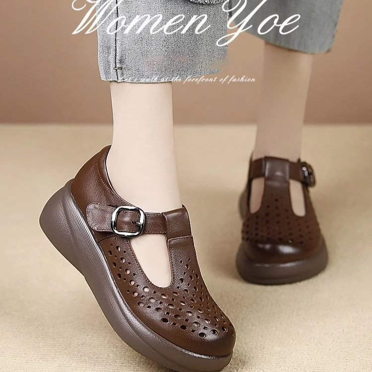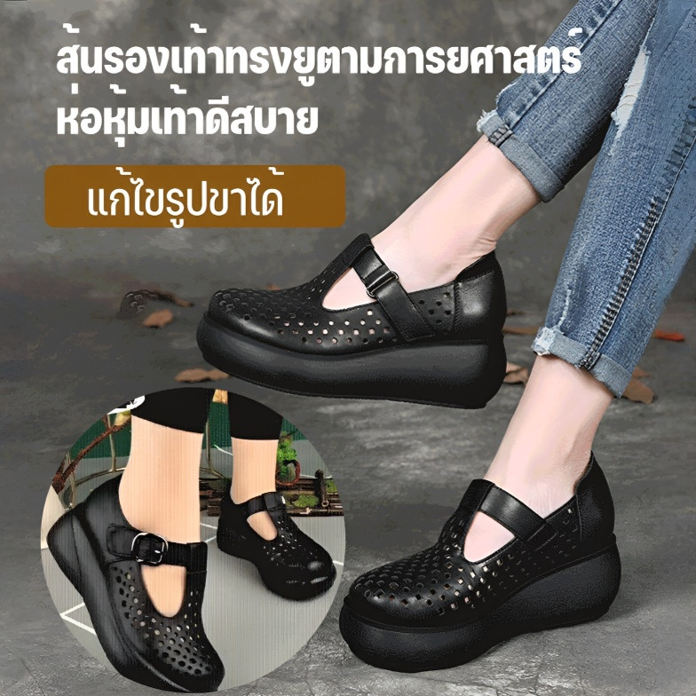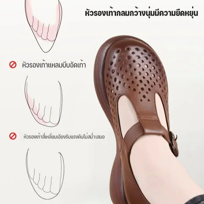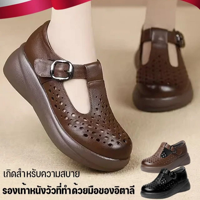 ?2025 NEW?รองเท้าหนังส้นเตารีดพื้นนุ่มระบายอากาศของแม่ รองเท้าแตะกลวงทำงานรองเท้าหนังแพลตฟอร์ม