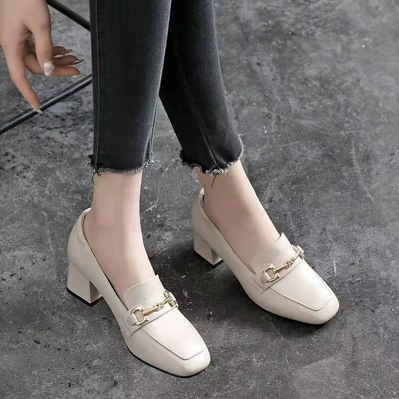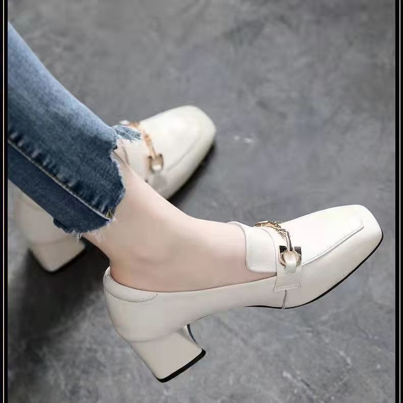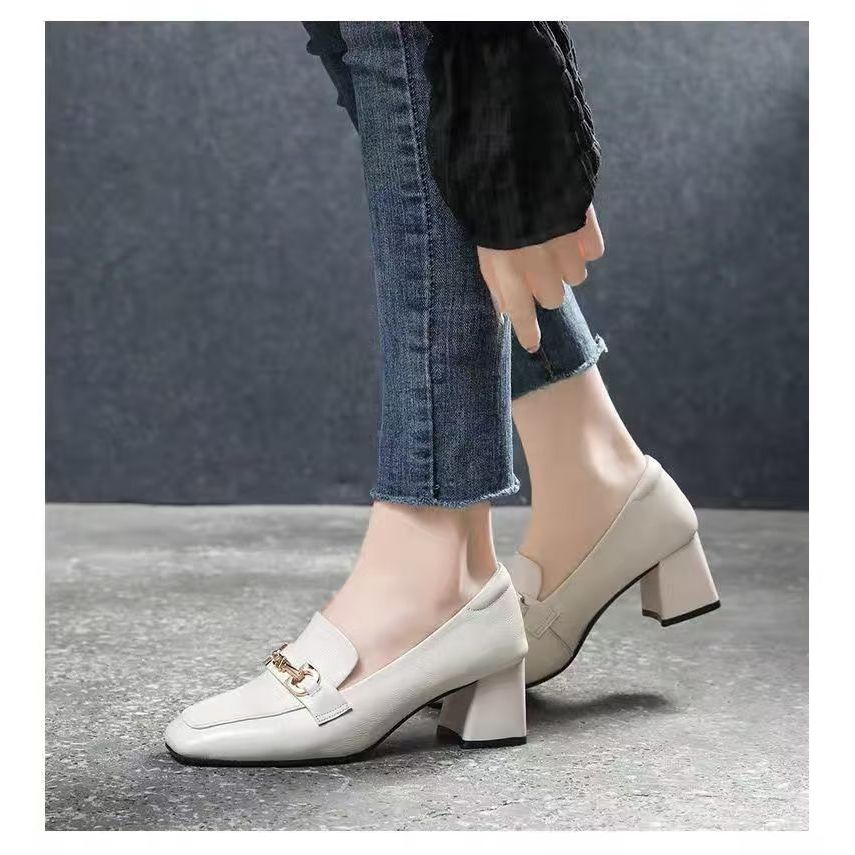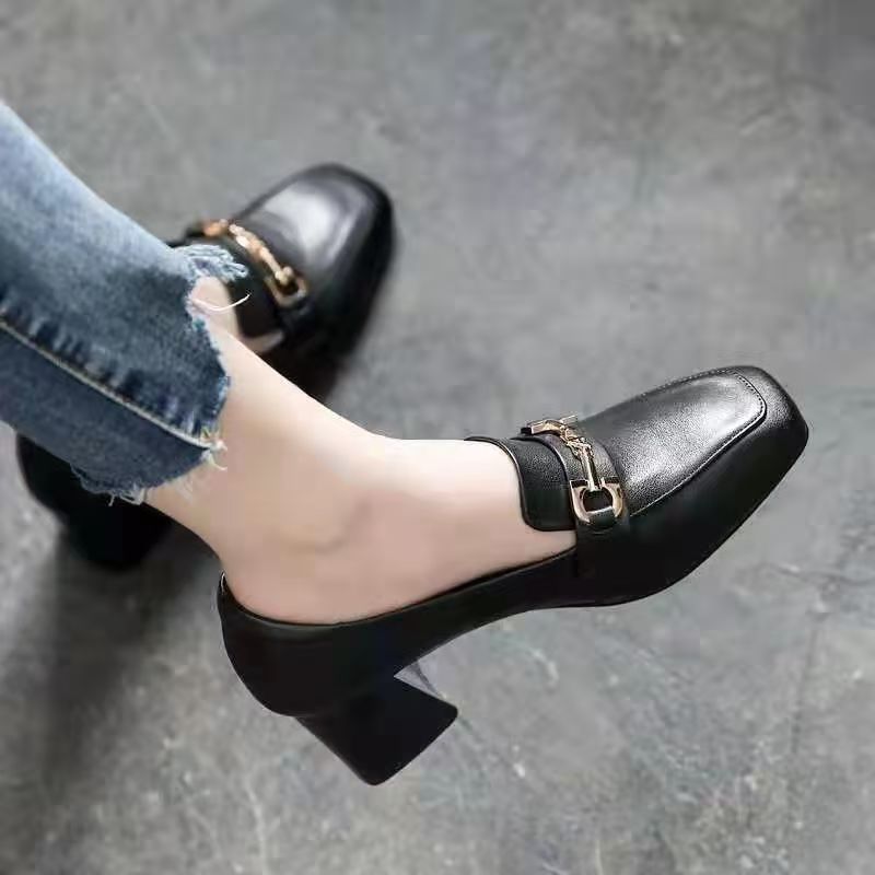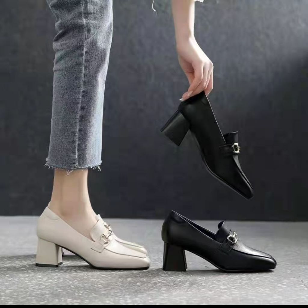 ? รองเท้าส้นสูงสไตล์เรโทร ส้นหนา ฤดูร้อน สีทึบ รองเท้าส้นสูงแฟชั่น