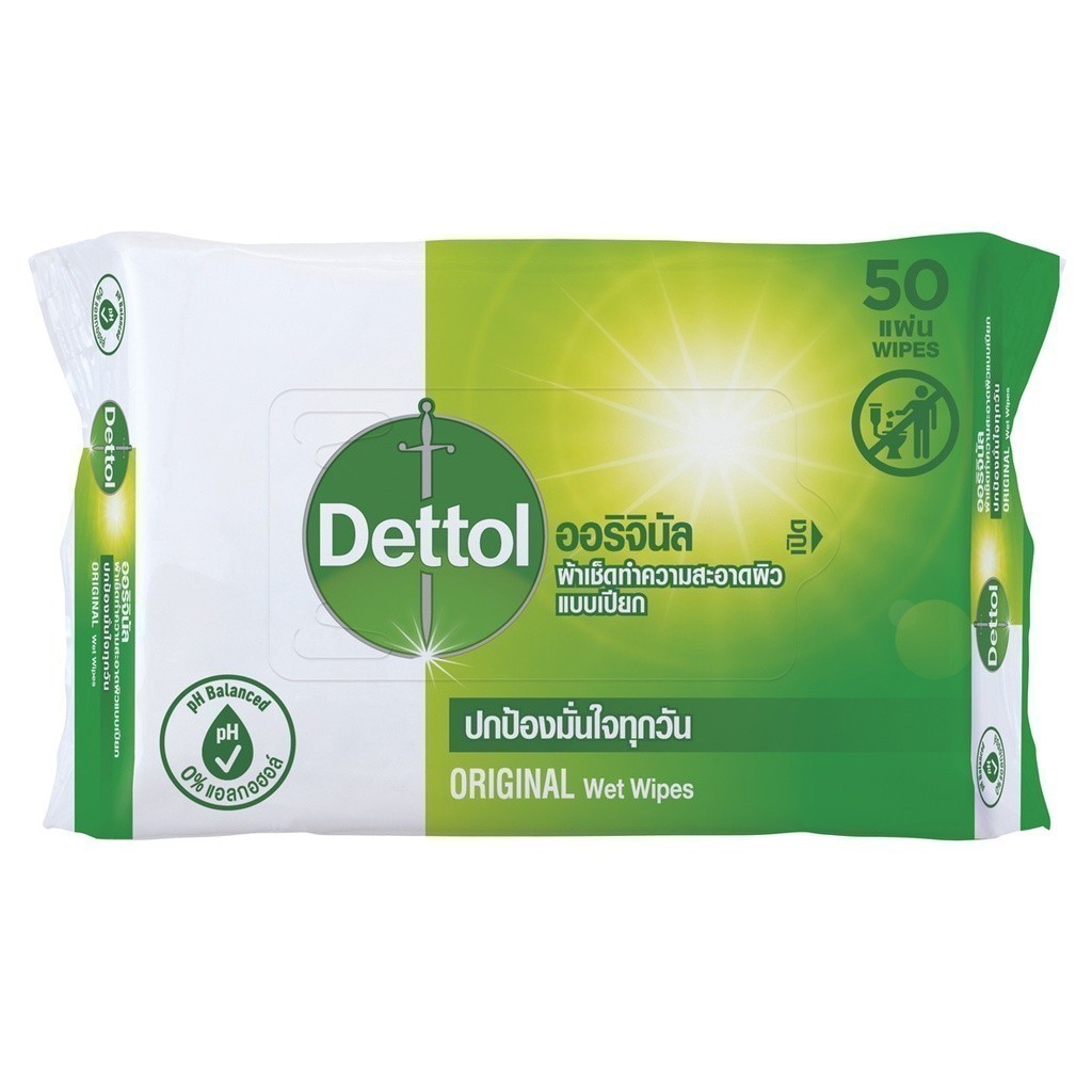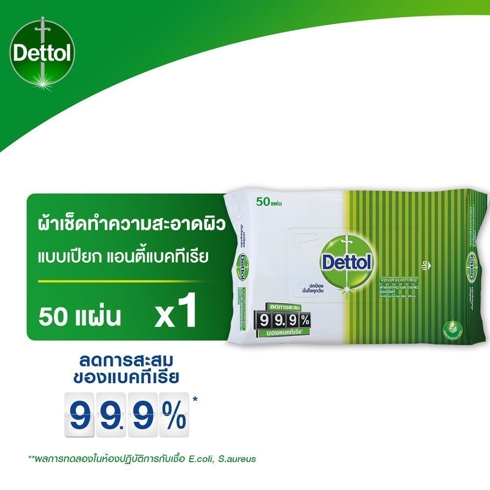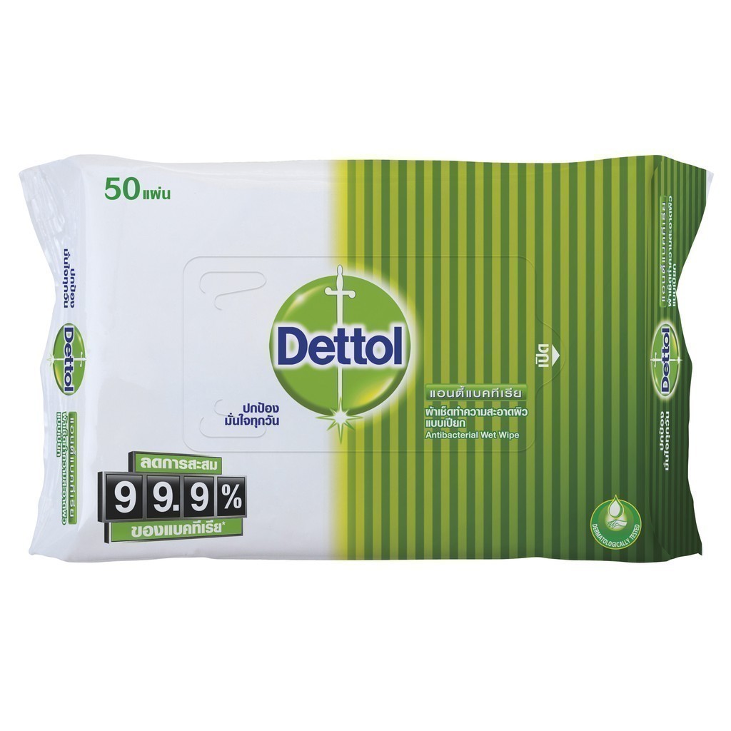 Dettol เดทตอล ผ้าเช็ดทำความสะอาดผิวแบบเปียก แอนตี้แบคทีเรีย จำนวน 50 แผ่น