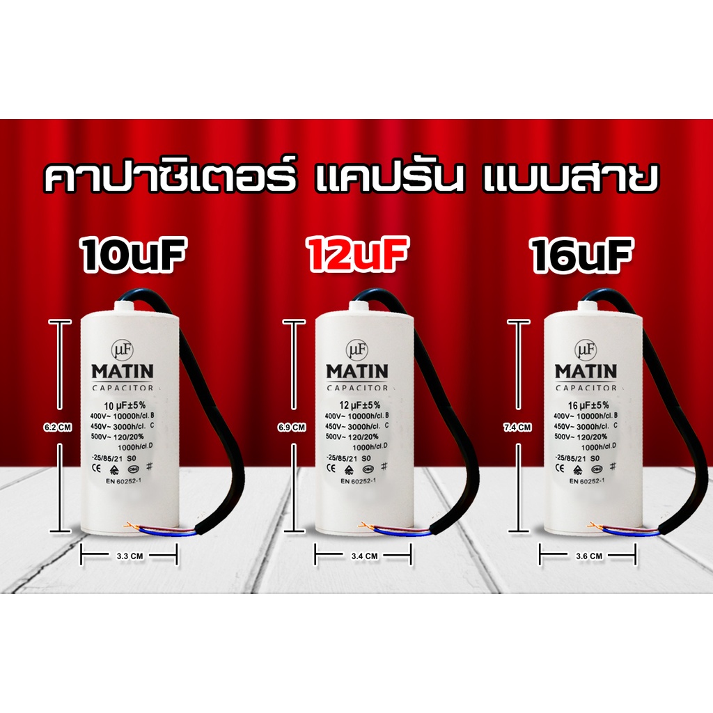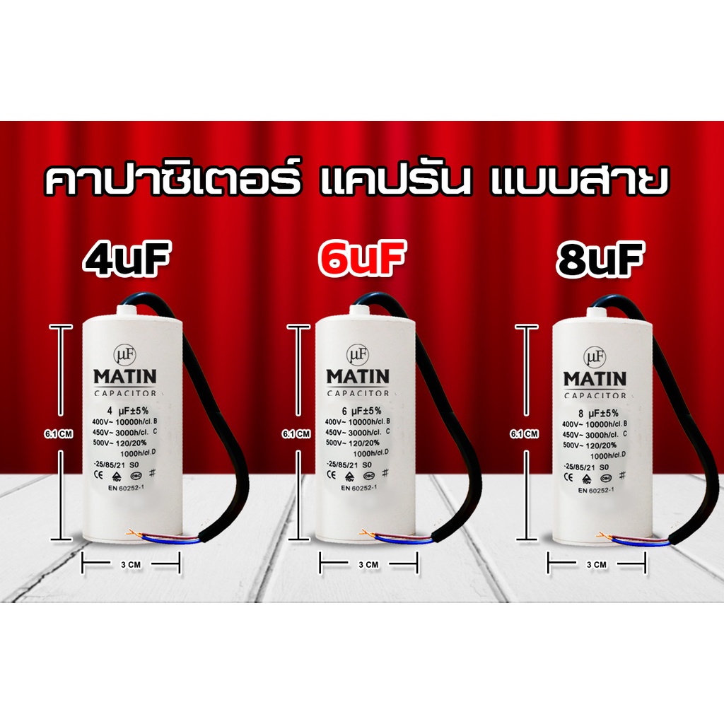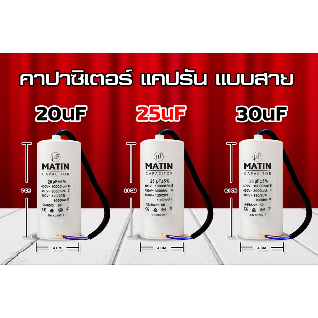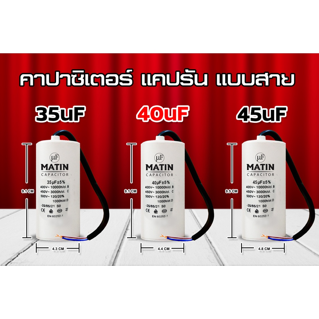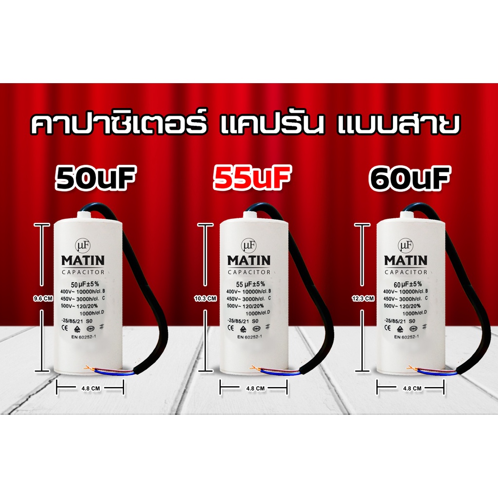คาปาซิเตอร์ แบบสาย Matin/Taino 4uf 6uf 8uf 10uf 12uf 16uf 20uf 25uf 30uf 35uf 40uf 45uf 50uf 55uf 60uf 450v