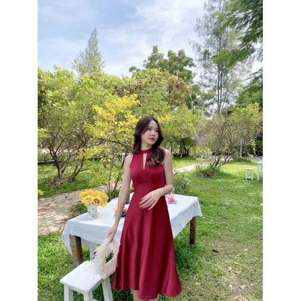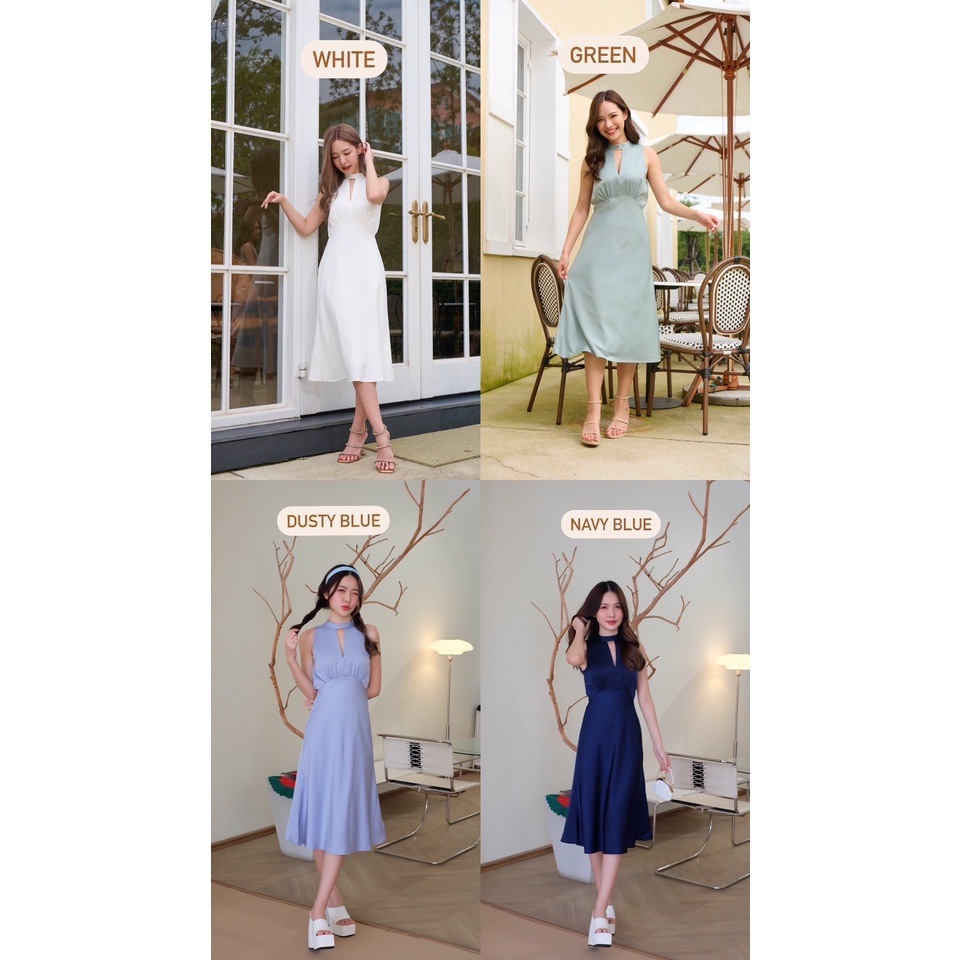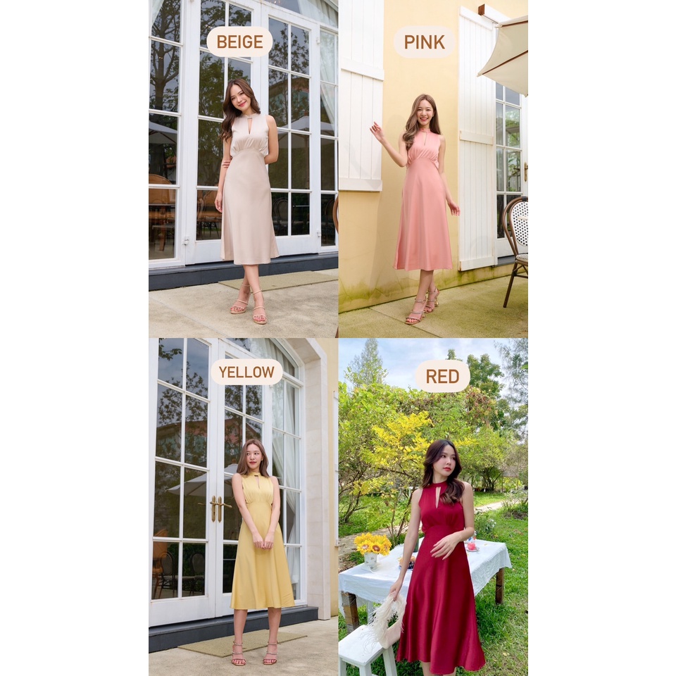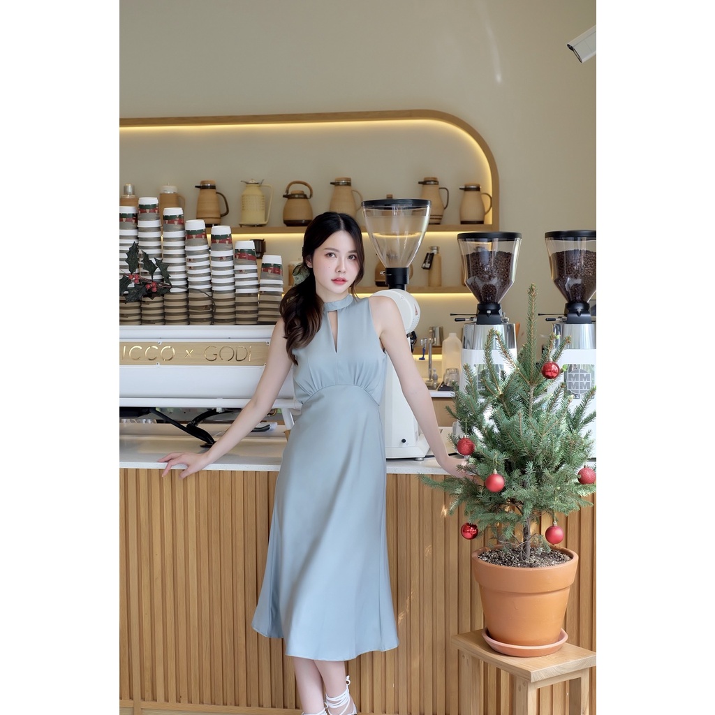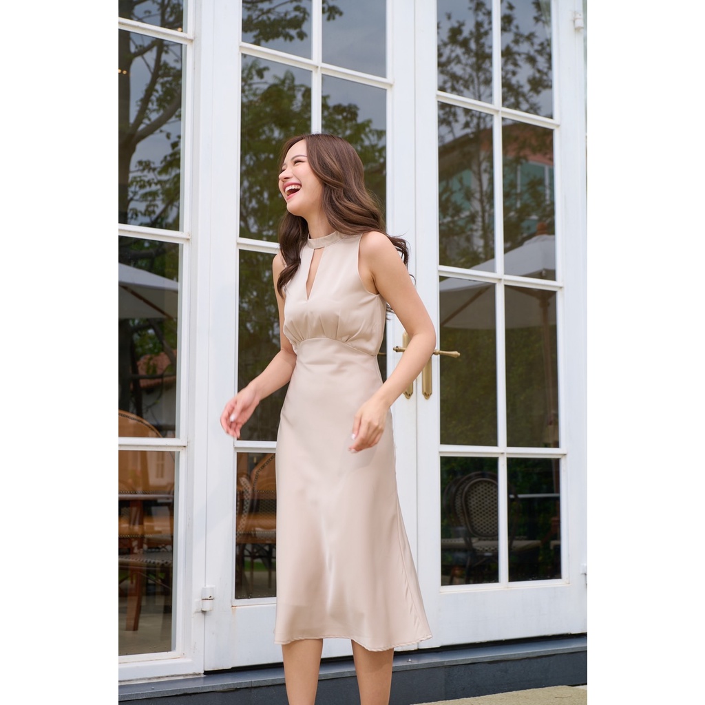 ทรงเดรสคือดีมาก น้องเป็นทรงคอจีน แขนกุด ช่วงคอ-อกแหวกเล็กน้อย พรางให้ดูเพรียว เอวสูงจับจีบใต้อกให้ช่วงขาดู