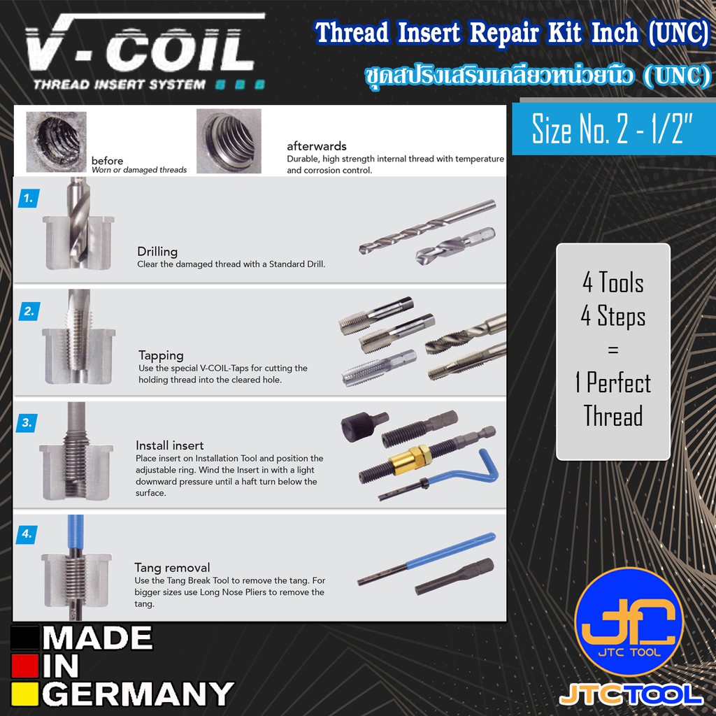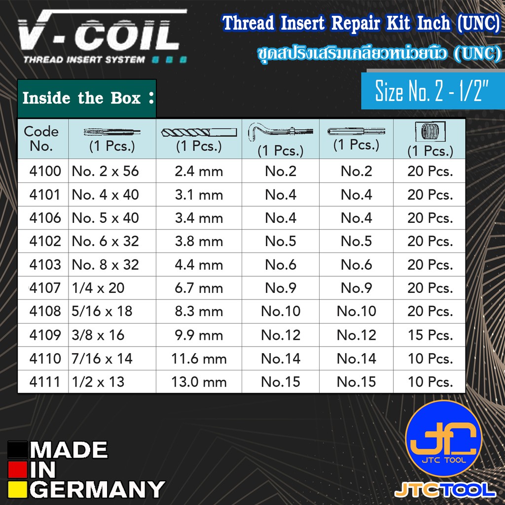 V-Coil สปริงเสริมเกลียวพร้อมอุปกรณ์หน่วยนิ้ว (UNC) ขนาด No.2 – 1/2นิ้ว – Thread Repair Kit UNC size No.2 – 1/2 Inch
