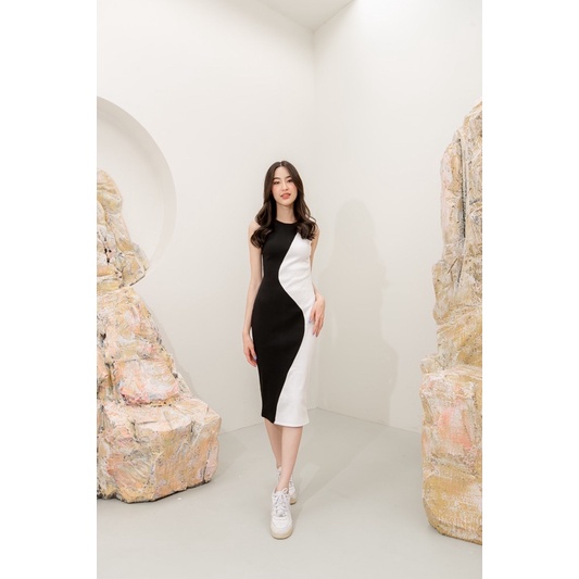 E-tax[เหลือ6xx.-ลด30%เก็บโค้ด”ร้านโค้ดคุ้ม”] Basicnotbasics-Curve dress แบรนด์แท้100% เดรสไหมพรม แต่งสีทูโทน (พร้อมส่ง)
