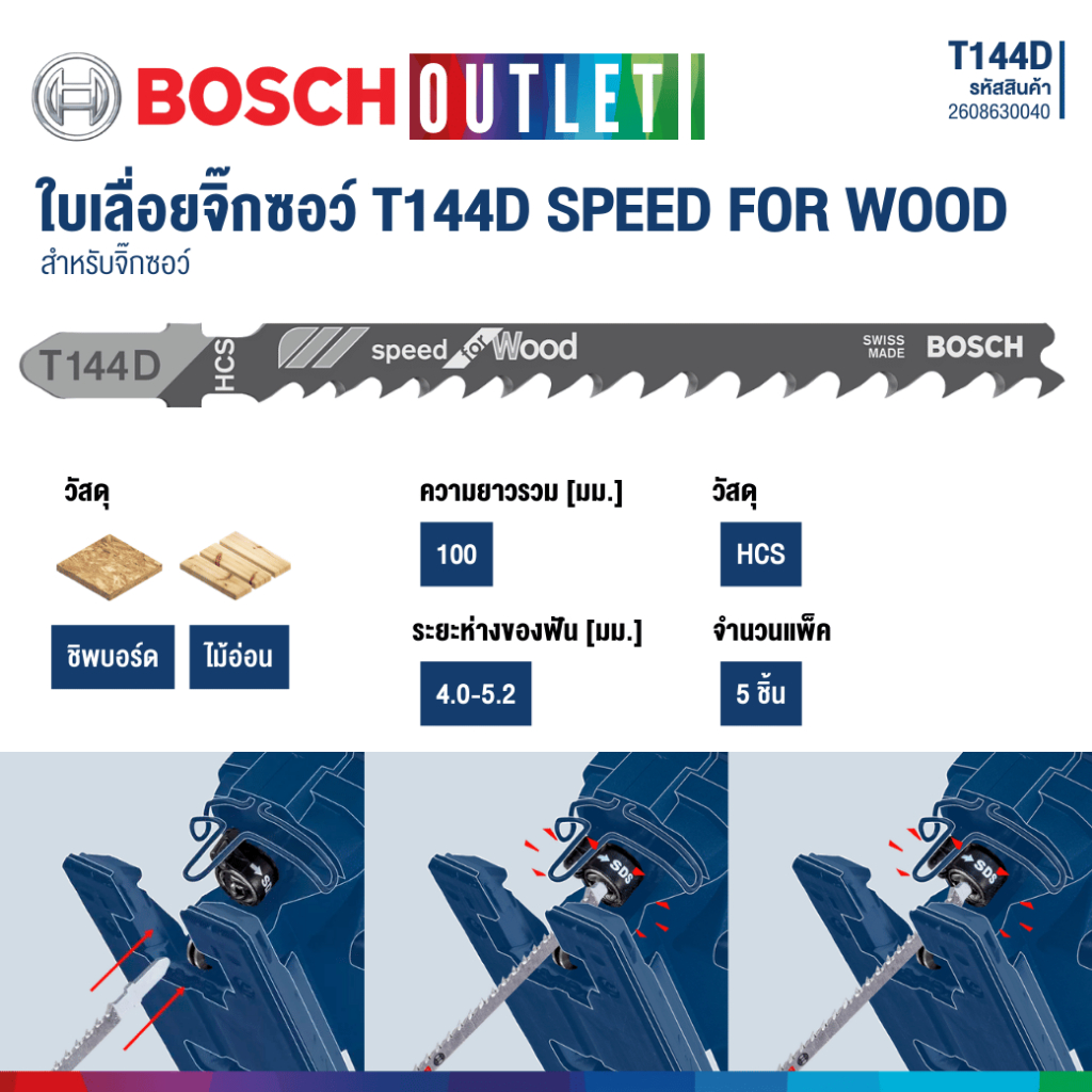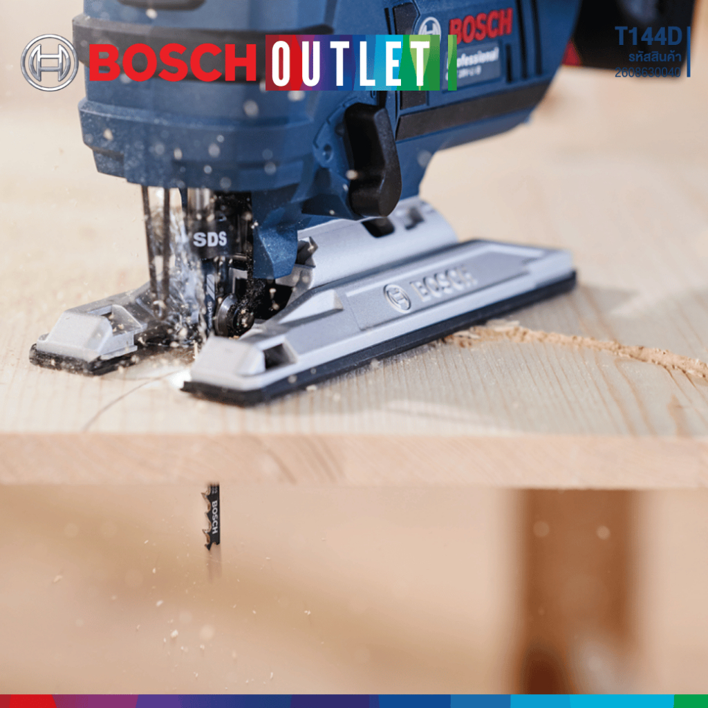 เลื่อยจิ๊กซอว์ T 144 D Speed for Wood สำหรับทำการตัดไม้แบบตรงอย่างรวดเร็ว วัสดุเหล็กกล้าคาร์บอนสูงนั้นเหมาะสำหรับการตัดไม้อ่อนและวัสดุงานไม้ที่ไม่เป็นสารไม่ขัดถู ความล