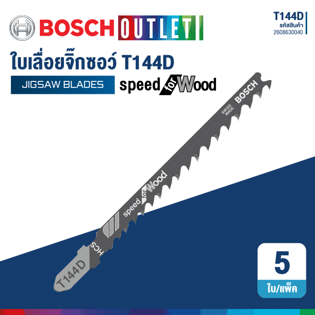 BOSCH T144D ใบเลื่อยจิ๊กซอว์ตัดไม้เนื้อ่อนแบบตรงอย่างรวดเร็ว (5ใบ/เเพ็ค) #2608630040