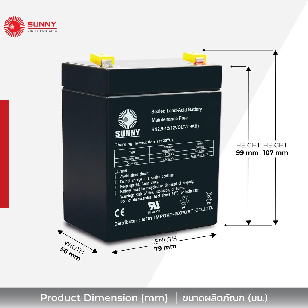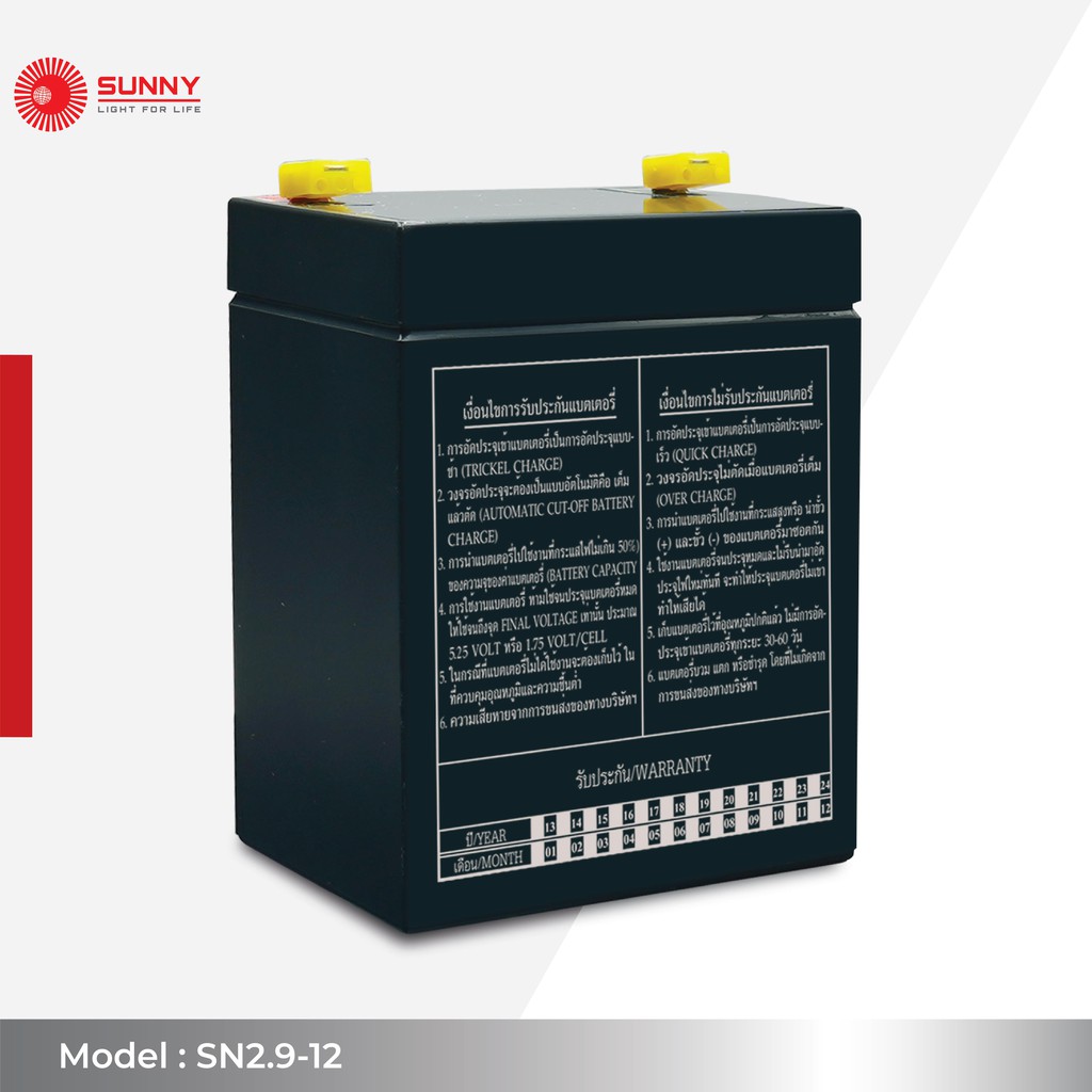 **หากลูกค้าเลือกการชำระเงินแบบเก็บเงินปลายทาง รบกวนใส่เบอร์โทรศัพท์ในคอมเม้นท์ให้ด้วยค่ะ ขอบคุณค่ะ** ㆍแบรนต์ SUNNY ㆍรุ่น SN 2.9-12 (12V 2.9Ah.) ㆍแรงดันไฟฟ้า Nominal Voltage : 12V ㆍความจุไฟฟ้า Nominal Capacity(10 HR) : 2.9Ah. ㆍขนาด(มม.) Dimension : L79 mm