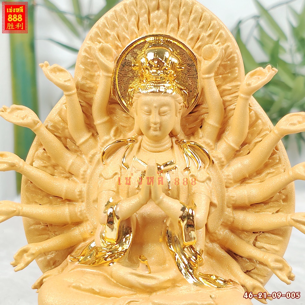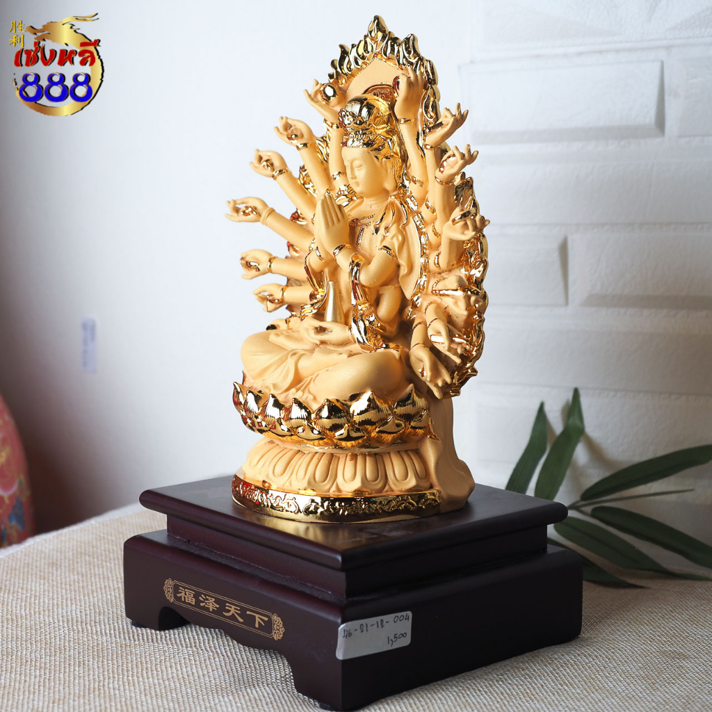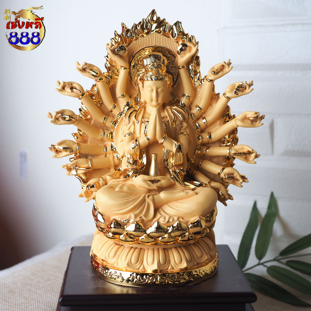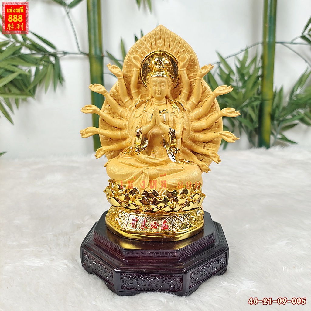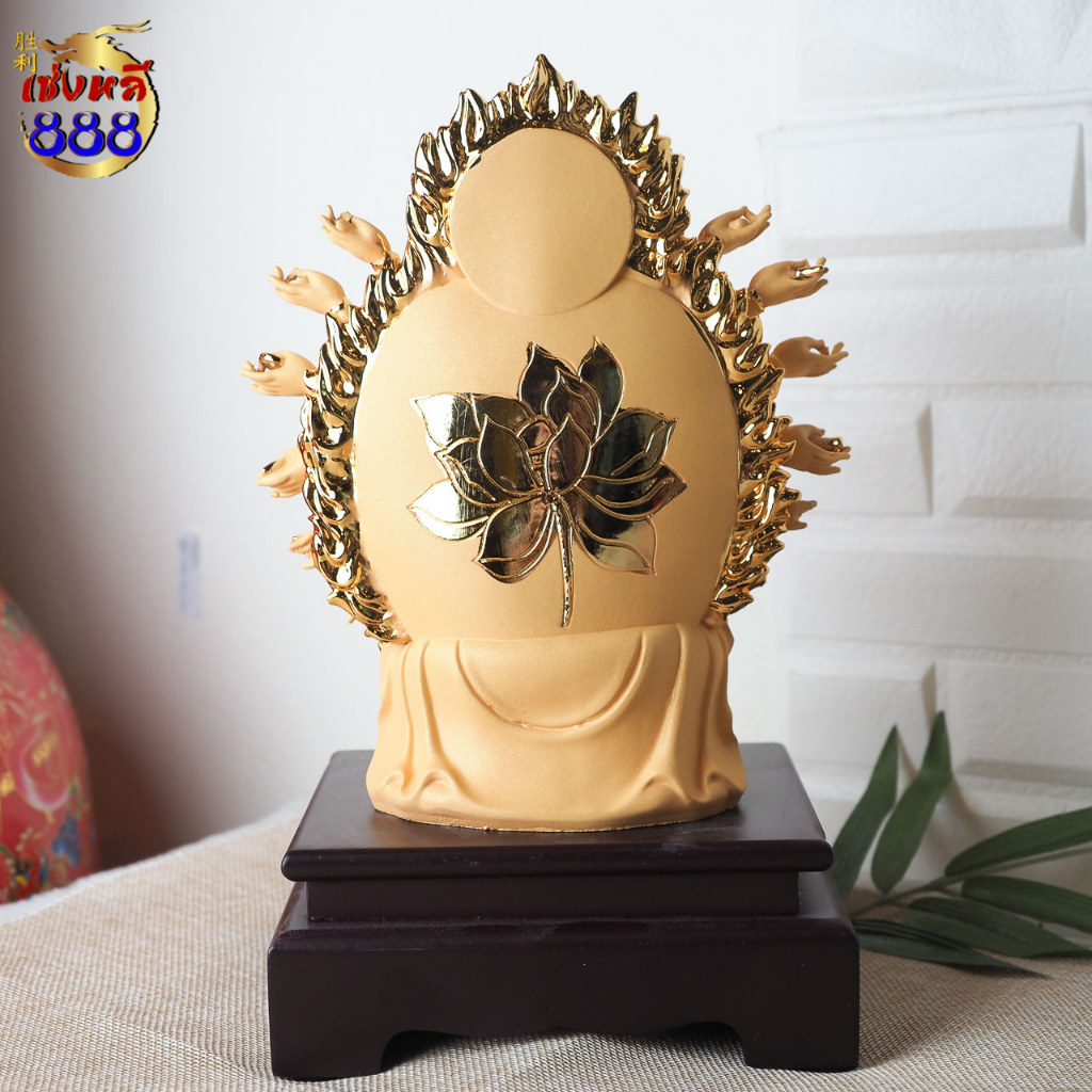 (พร้อมส่ง) เจ้าแม่กวนอิมนั่งดอกบัว ปางพันมือ หลังมีรัศมี งานเรซิ่นพ่นทรายสีทอง พร้อมฐาน สูง 9-21 นิ้ว