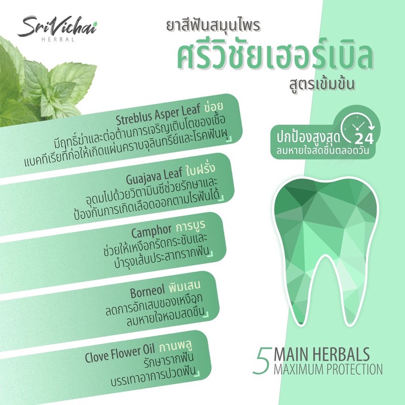 ยาสีฟันสมุนไพรศรีวิชัย เฮอร์เบิล ผลิตจากสมุนไพรไทยที่มีประโยชน์ต่อเหงือกและฟัน ซึ่งสมุนไพรเหล่านี้มีสรรพคุณรักษาเหงือกและฟัน ป้องกันฟันผุ ลดกลิ่นปาก ฆ่าเชื้อโร