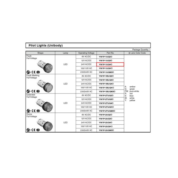 • รุ่น YW1P-1UQ4 Operating Voltage : 24V AC/DC Lens Color Code : (G) Green