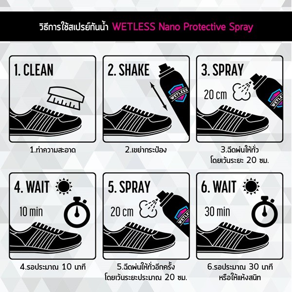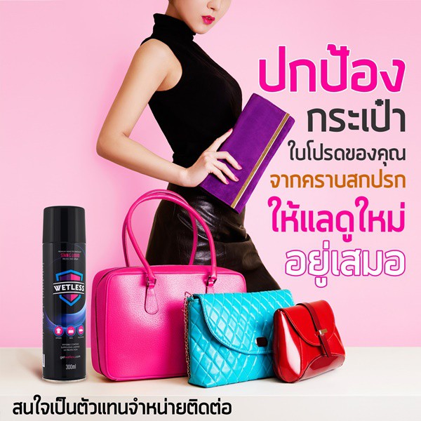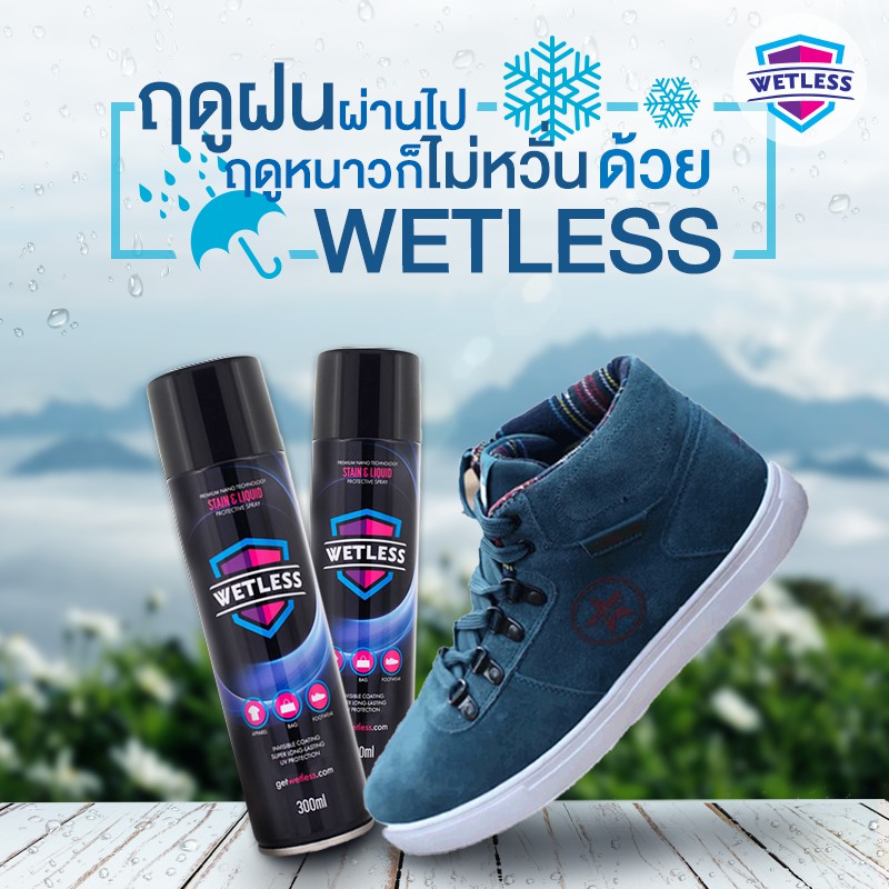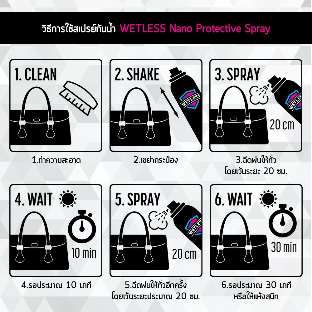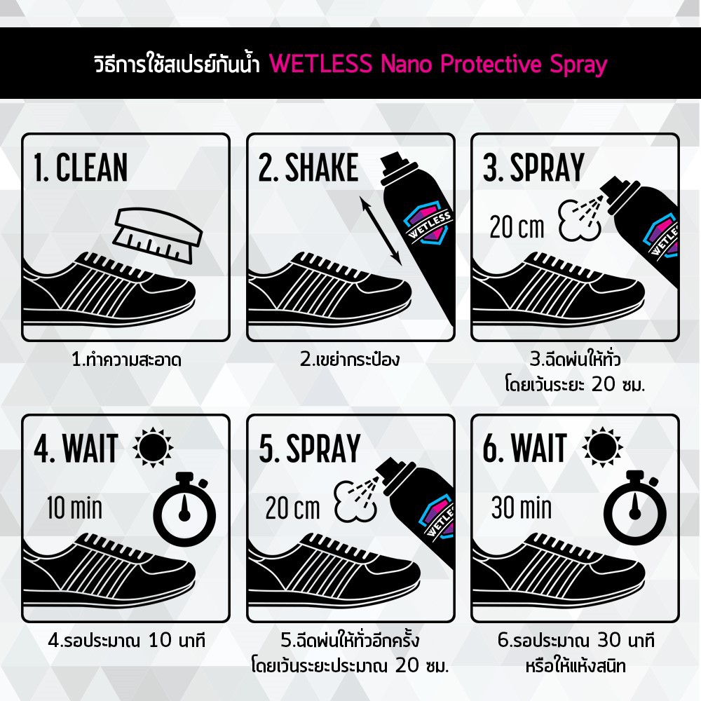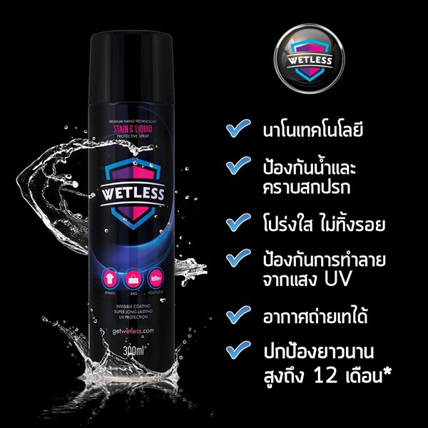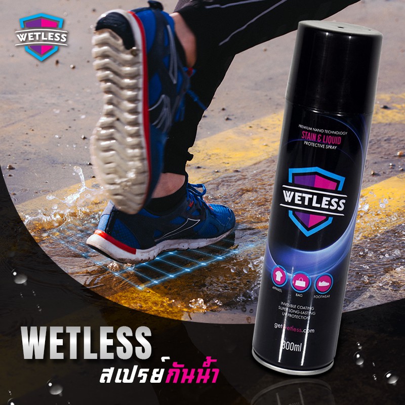WETLESS สเปรย์ป้องกันน้ำและคราบสกปรก ด้วยเทคโนโลยีการเคลือบนาโนในระดับอนุภาค ช่วยให้น้ำไม่ซึม คราบไม่เกาะติด ทำความสะอาดได้ง่าย แห้งเร็ว ฉีดพ่นได้บ่อยตามที่ต้องการ
