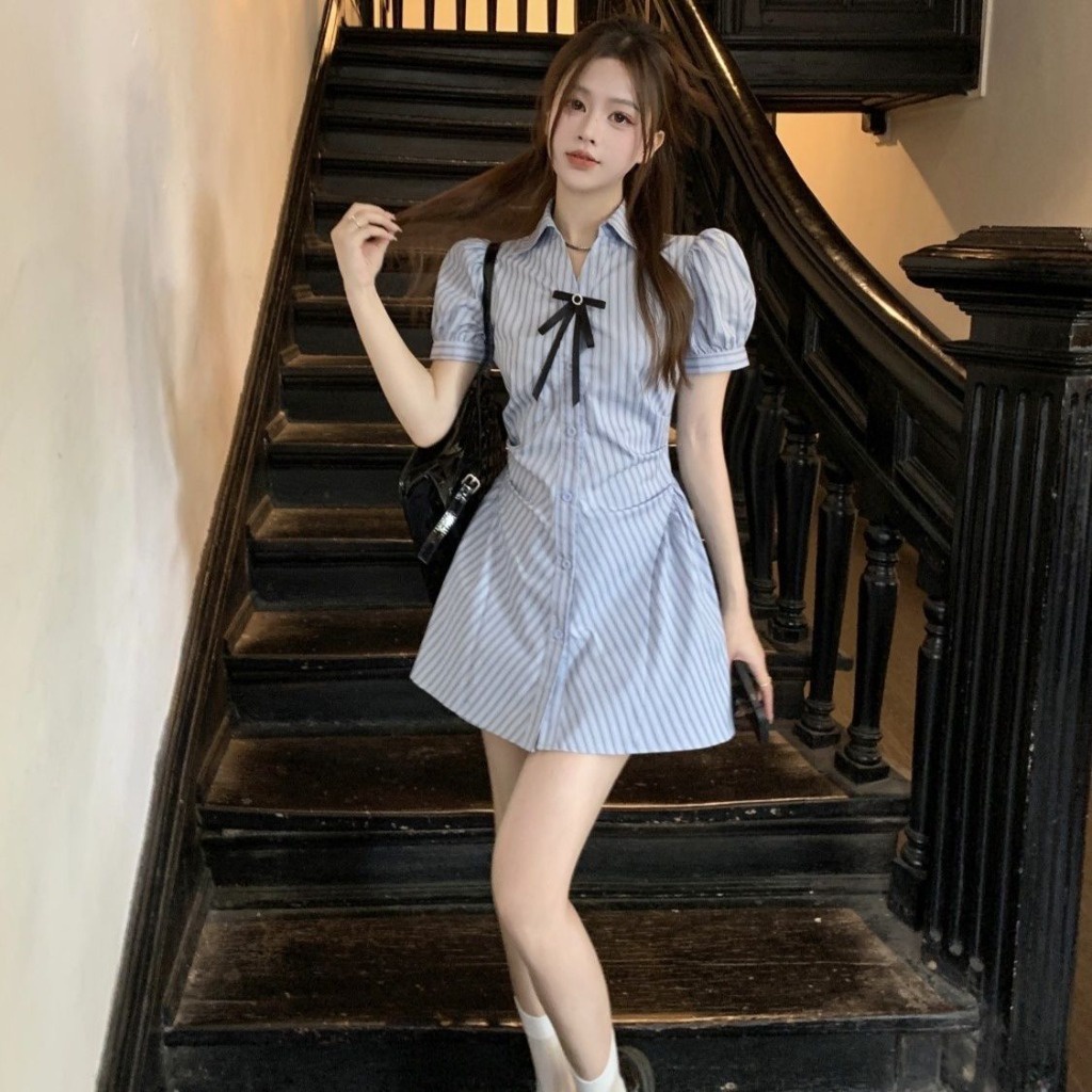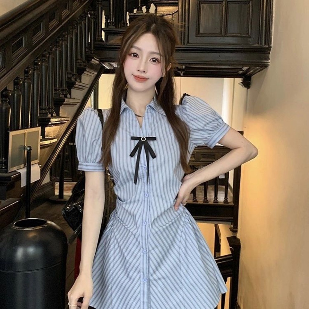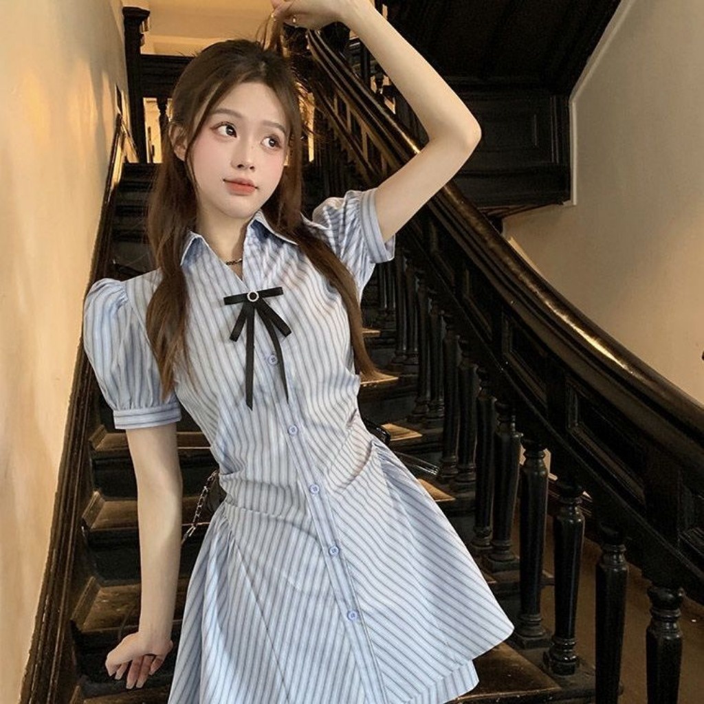 (จัดส่งจากกรุงเทพฯ) ฤดูร้อนรูปแบบใหม่ กระดุมแถวเดียว แขนพัฟ ลายทางแนวตั้ง ผอมเพรียว ชุด