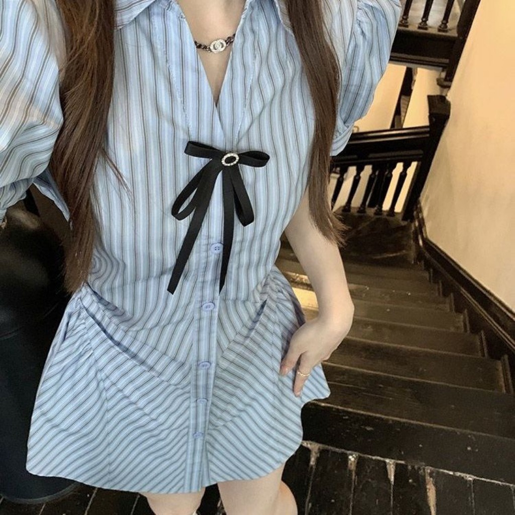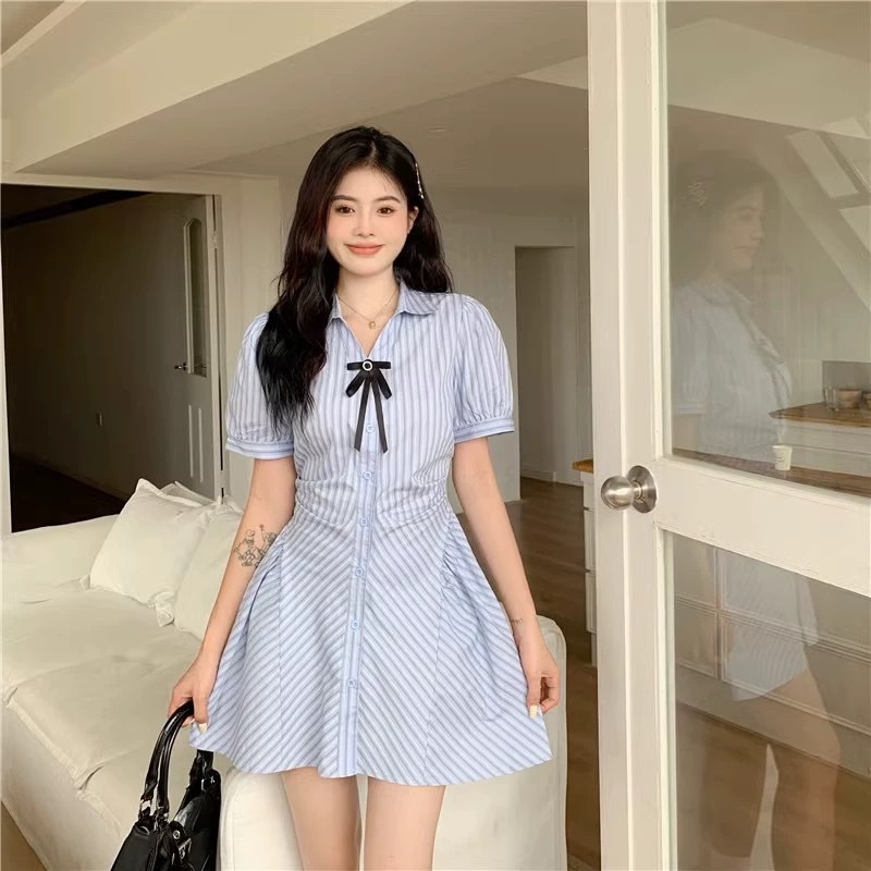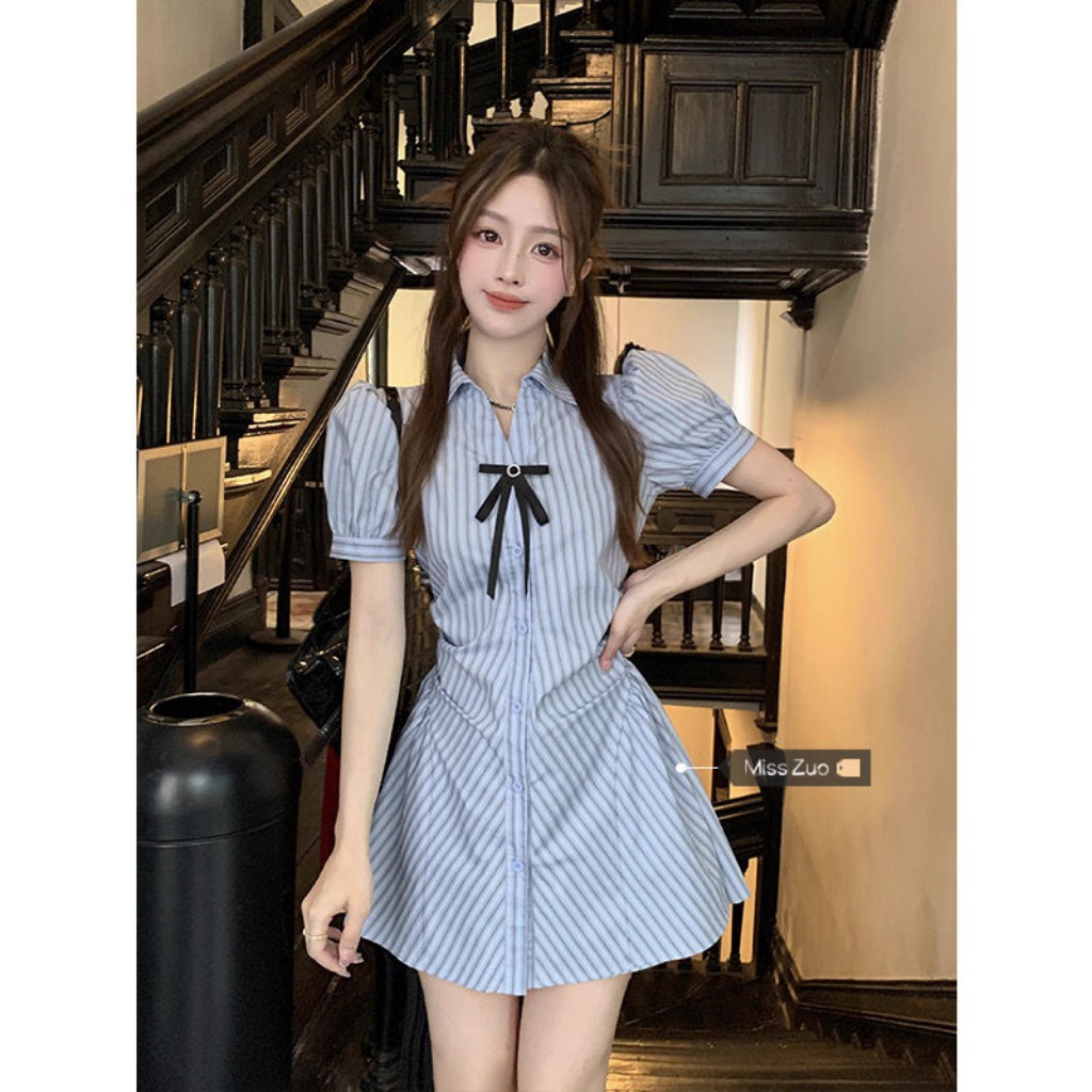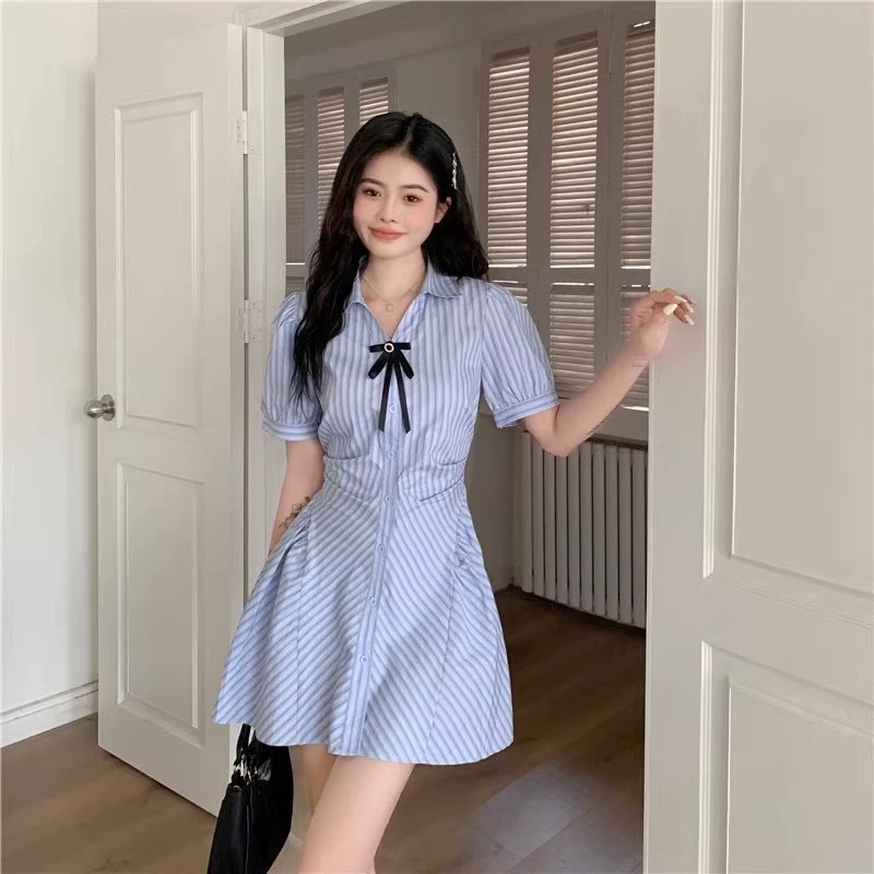 (จัดส่งจากกรุงเทพฯ) ฤดูร้อนรูปแบบใหม่ กระดุมแถวเดียว แขนพัฟ ลายทางแนวตั้ง ผอมเพรียว ชุด