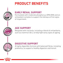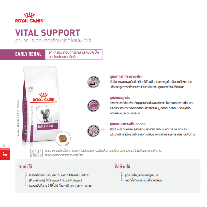 ดูแลแมวที่มีความเสี่ยงหรือเป็นโรคไตระยะเริ่มต้น ลดปริมาณฟอสฟอรัส , ชะลอความเสื่อมของไต , เสริมกรดไขมัน ลดการอักเสบที่ไต , เสริมสารต้านอนุมูลอิสระ ดูแลไตที่เ