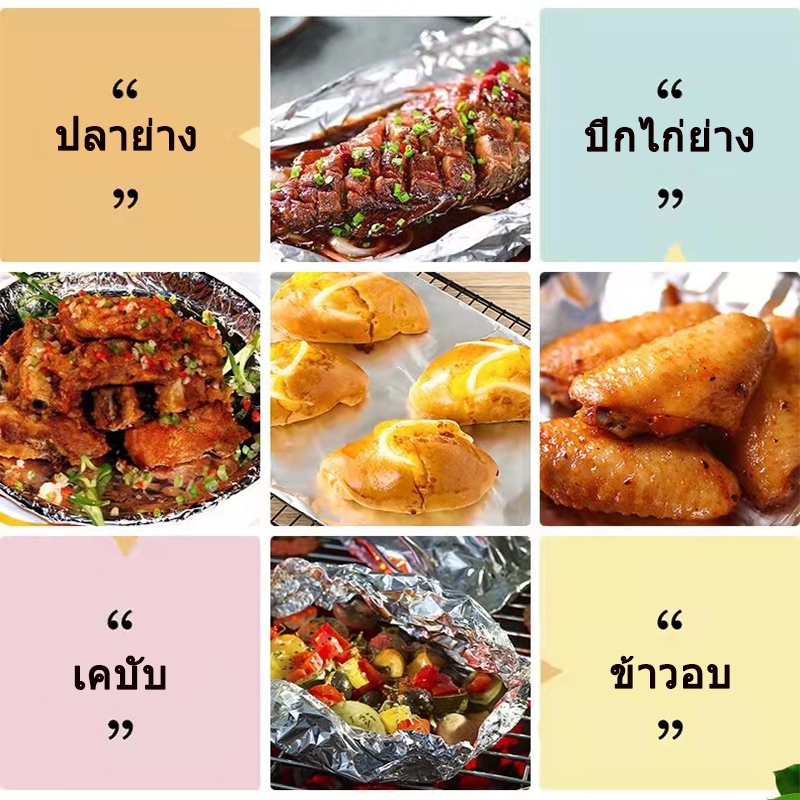 กระดาษฟอยล์สำหรับห่ออาหาร ใช้ห่ออาหารเพื่อนำไปปิ้ง ย่าง อบ หรือจะใช้เป็นบรรจุภัณฑ์ที่สามารถรักษาความสดของอาหาร เพื่อป้องกันการสูญเสียน้ำในตัววัตถุดิบ