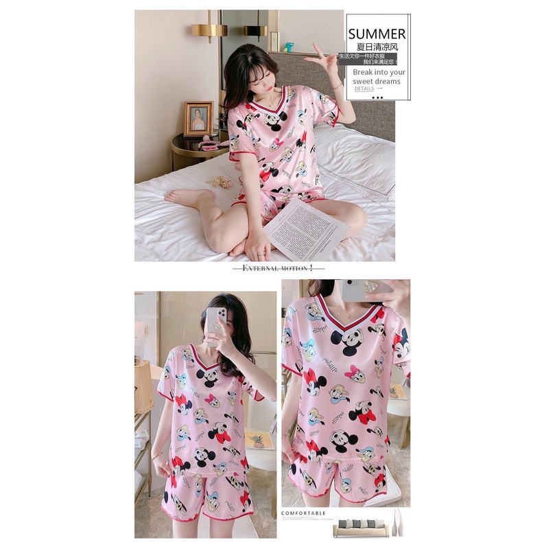ชุดนอนผ้าซาติน ชุดนอนแฟชั่นเกาหลี Womenผ้าซาติน เสื้อแขนสั้น+กางเกงขาสั้น คอวี ผ้านิ่มใส่สบาย