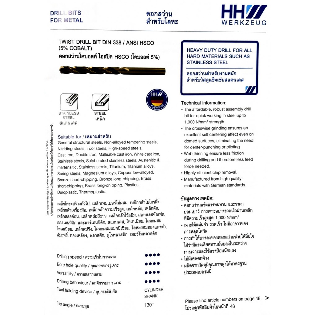 ดอกสว่านโคบอลท์ เจาะเหล็ก สแตนเลส ไททาเนียม ฯลฯ มีขนาดตั้งแต่ 3mm - 13mm HHW (มาตรฐาน เยอรมัน)