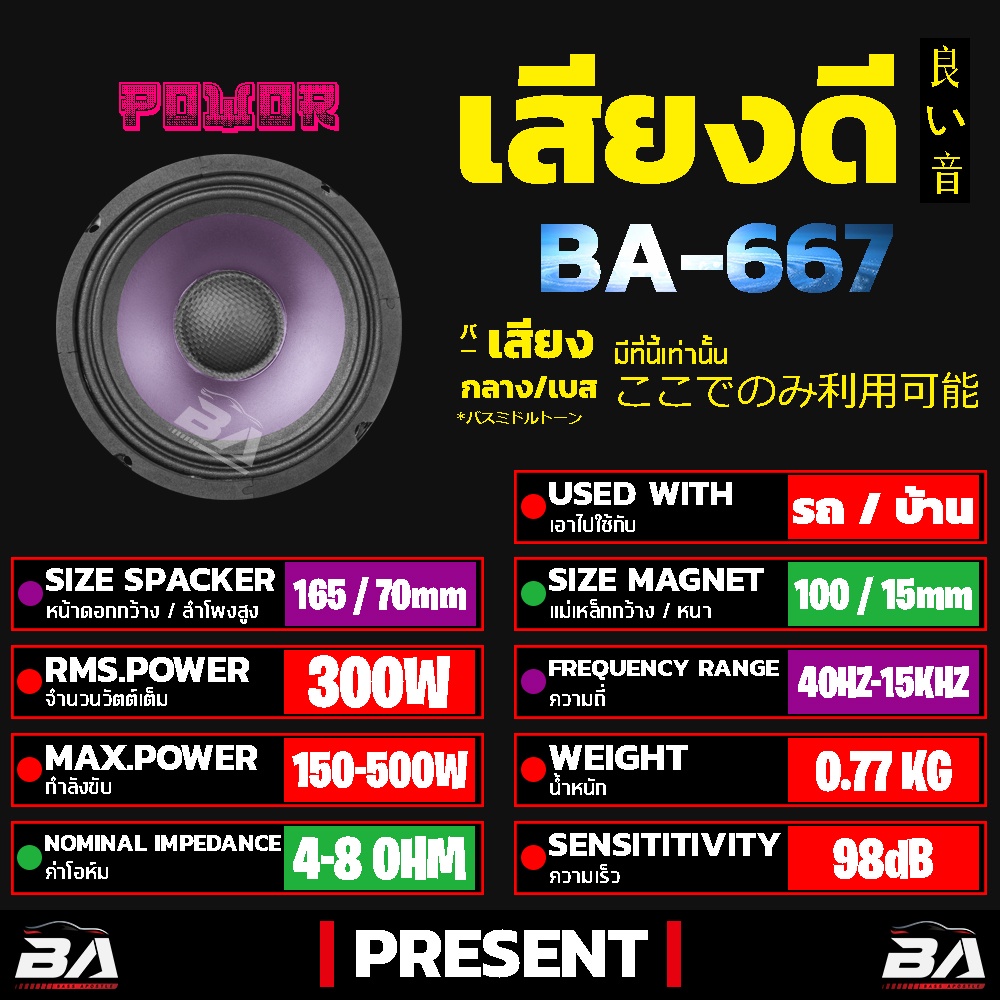 BA SOUND ลำโพงเสียงกลาง 6.5นิ้ว 300วัตต์ ขายส่ง 4ดอก BA-667 ลำโพงโดมเคฟล่า 6.5 นิ้ว ลำโพงติดรถยนต์ 6.5 นิ้ว ดอกลำโพง