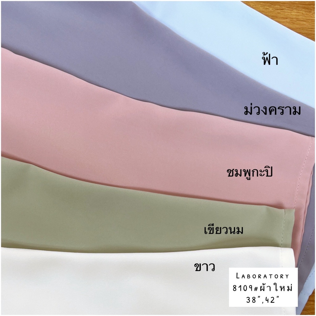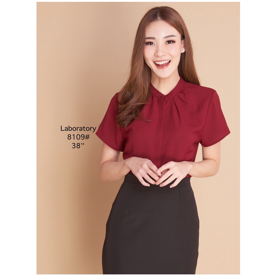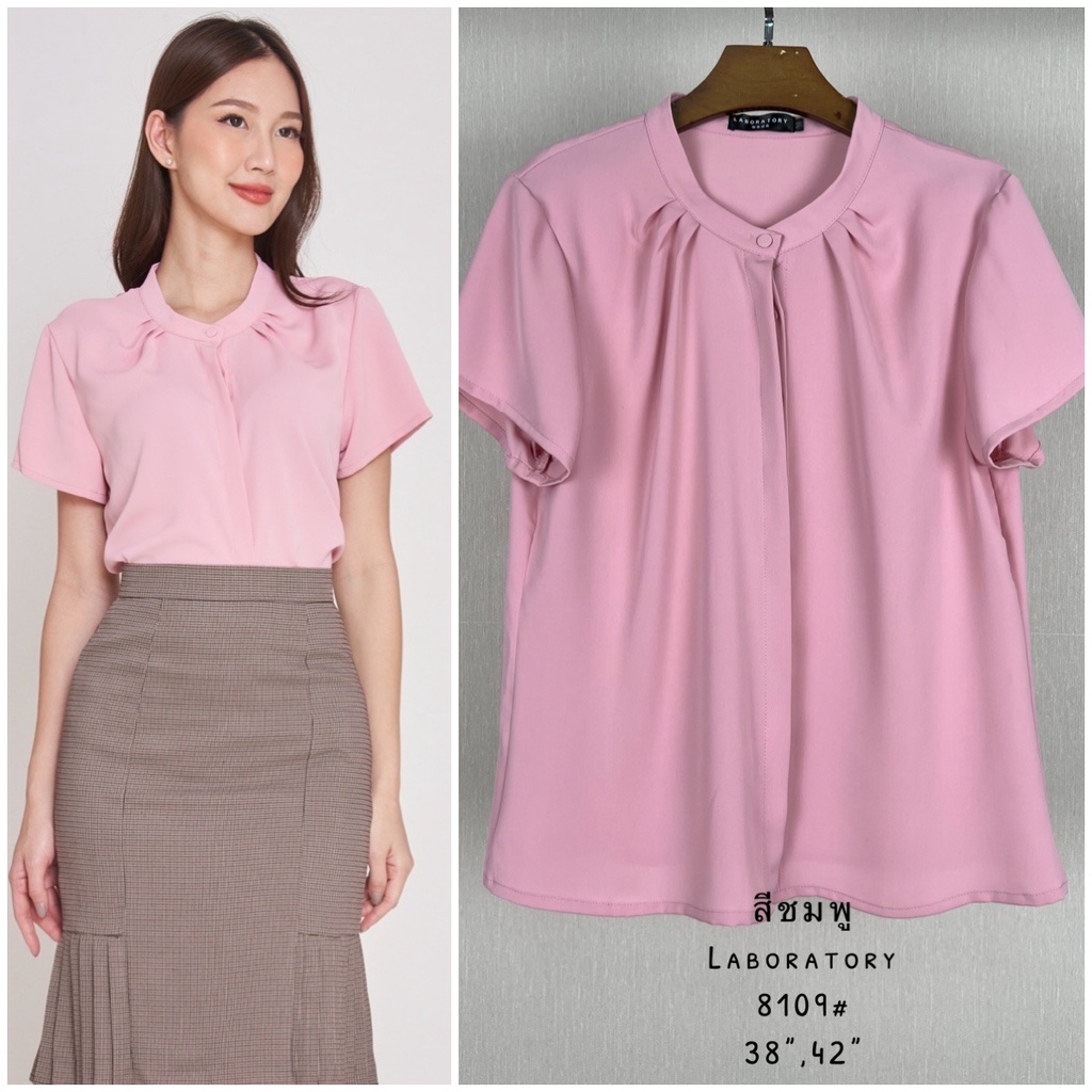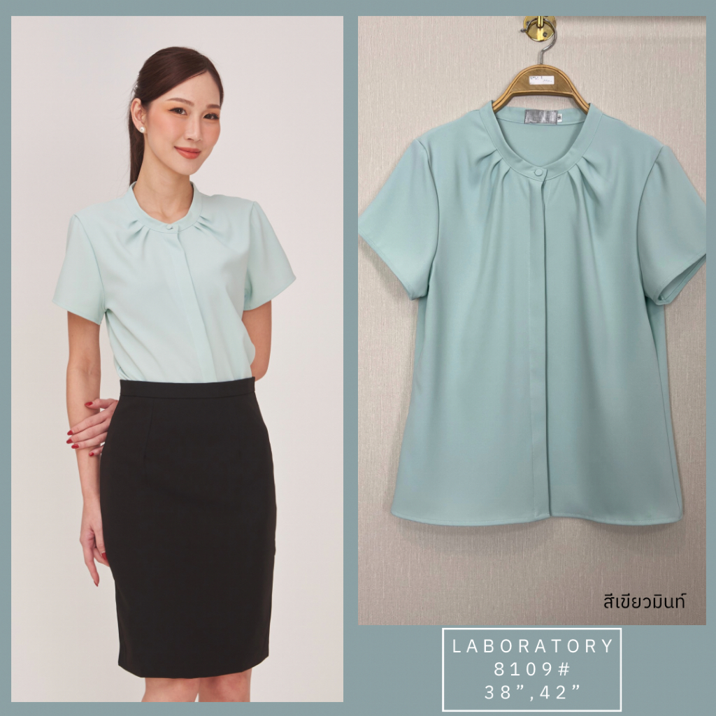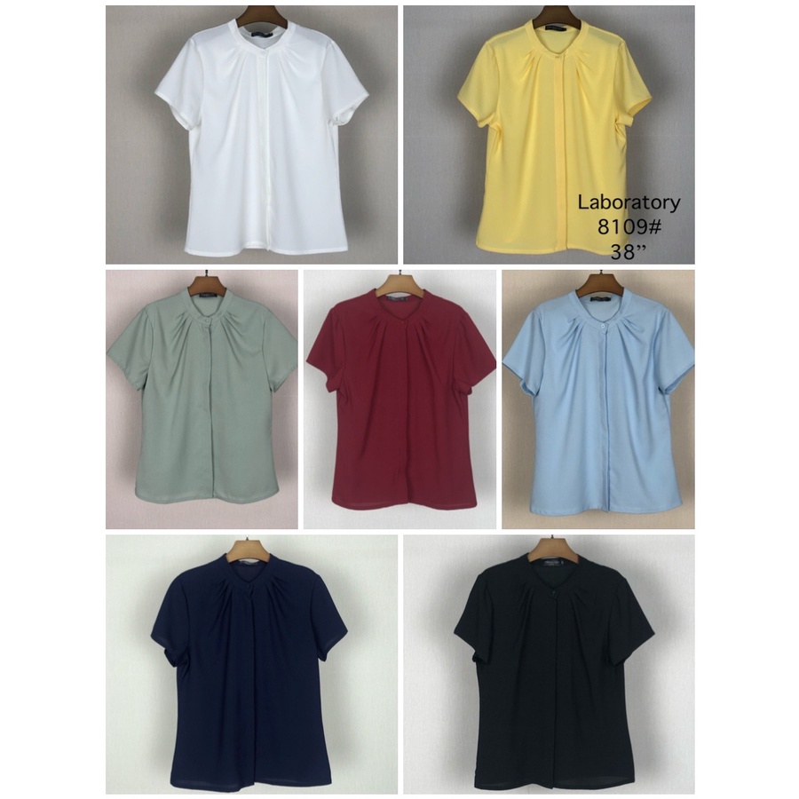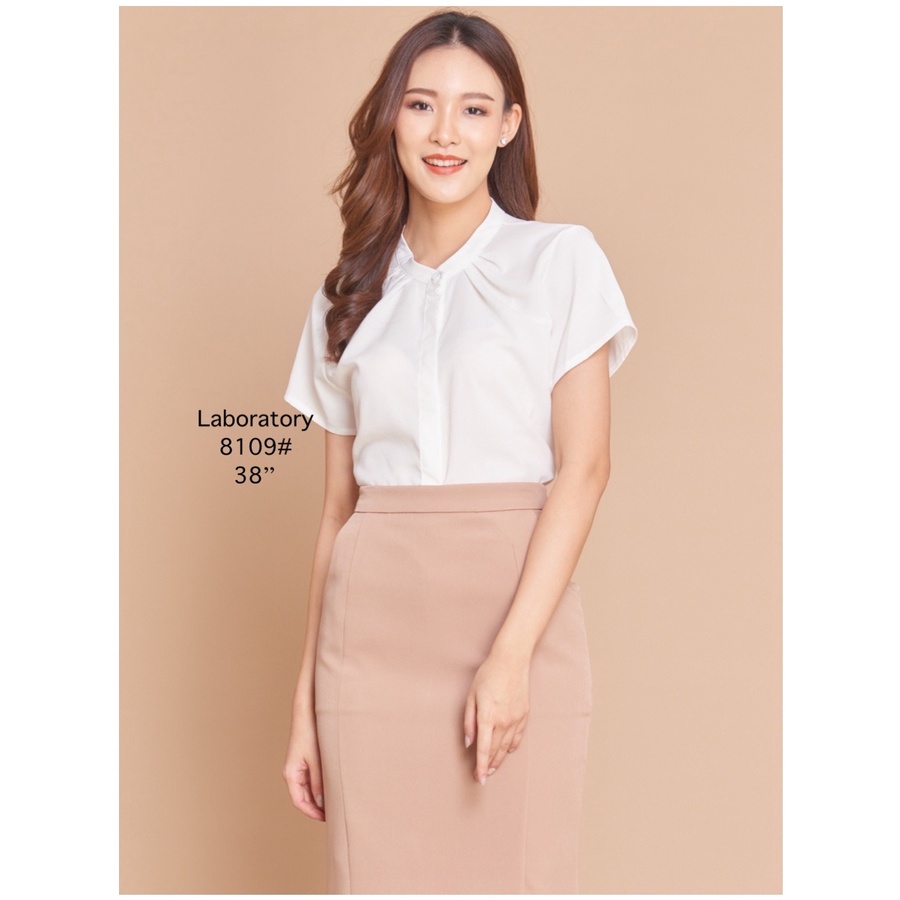 Laboratory 8109# เสื้อทำงานทรงจีบคอกระดุมหน้าแต่งสาบซ่อนแขนสั้นไซส์ 36,38,42
