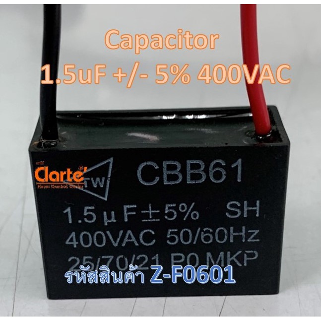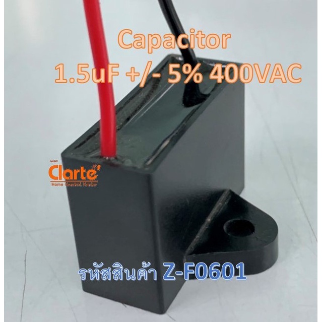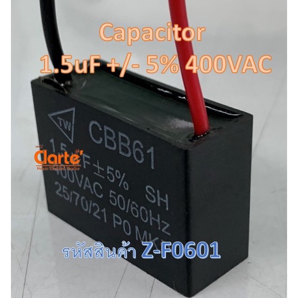 1. Capacitor หรือตัวเก็บประจุไฟฟ้า 1.5uF +/-5% 400VAC 50 Hz สำหรับต่อคล่อมขดสตาร์ทของมอเตอร์พัดลมไฟฟ้าขนาด 14-16 นิ้ว